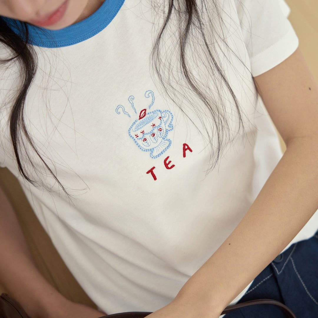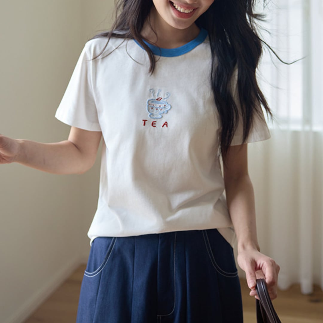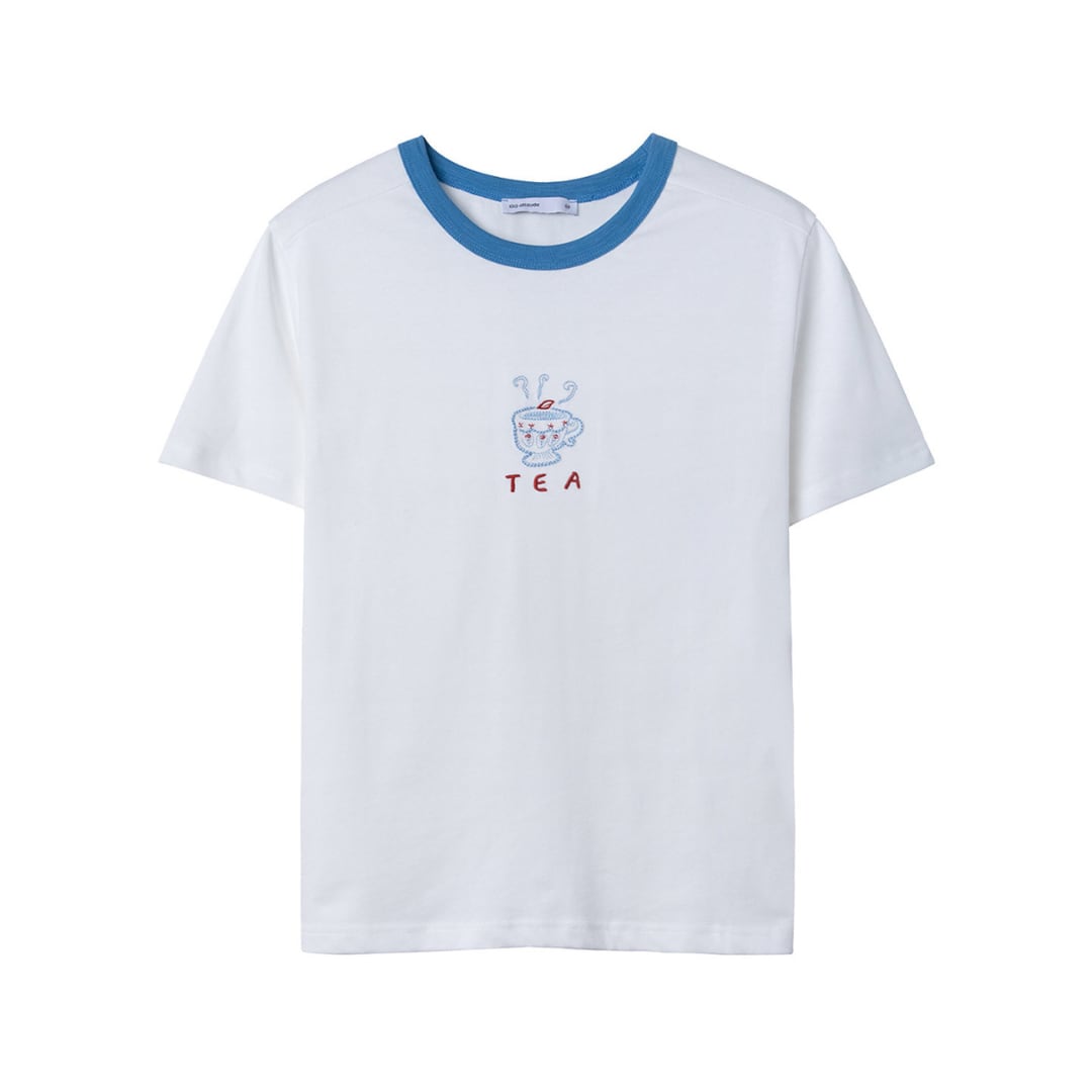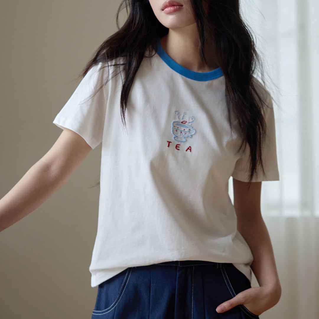 胸元にあしらわれたティーカップモチーフの刺繍がさりげないアクセントになる、やわらかなコットン素材の半袖Tシャツ。