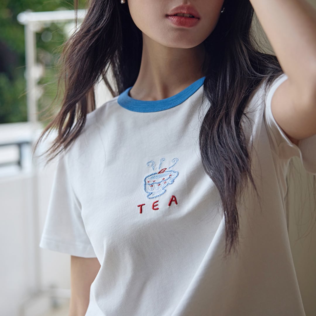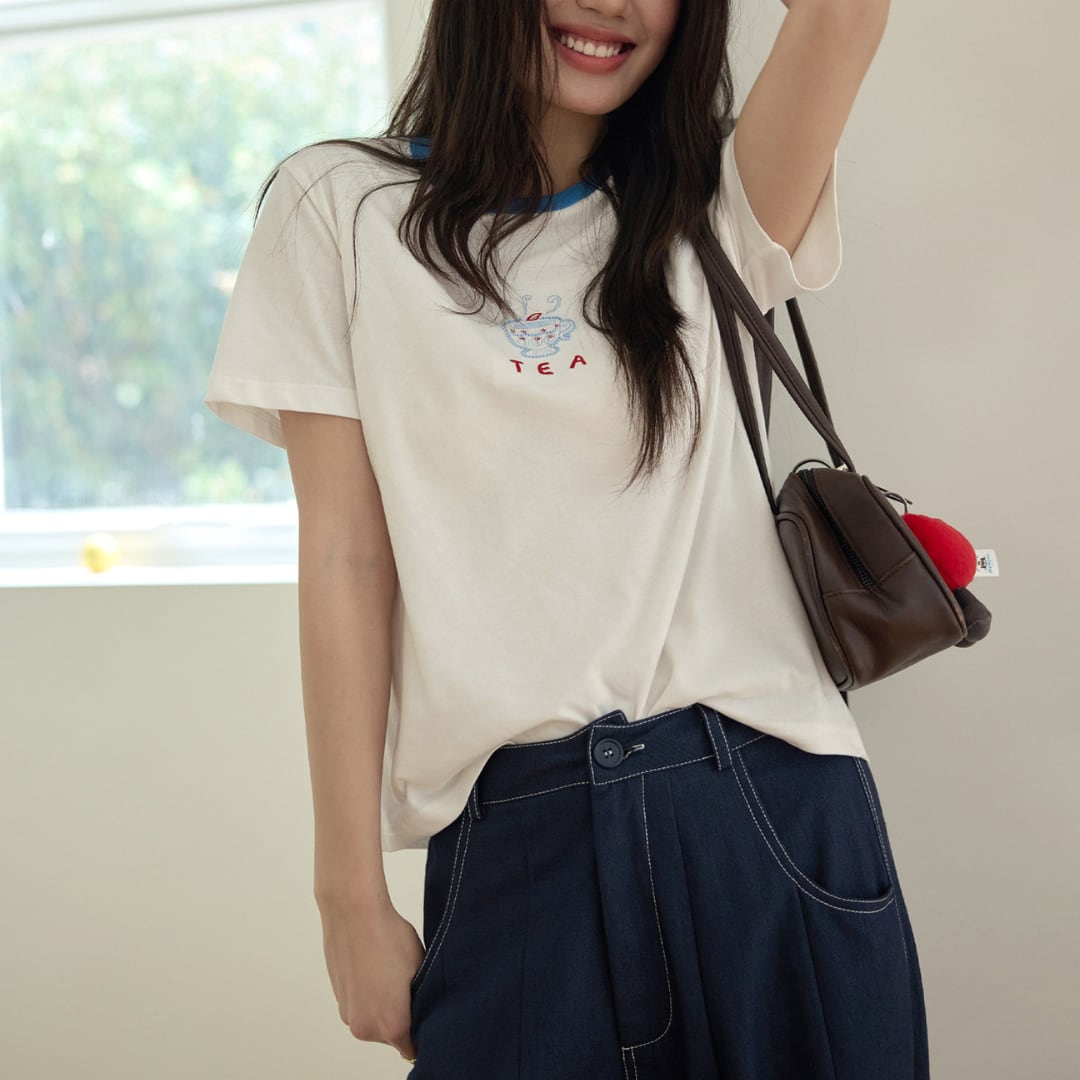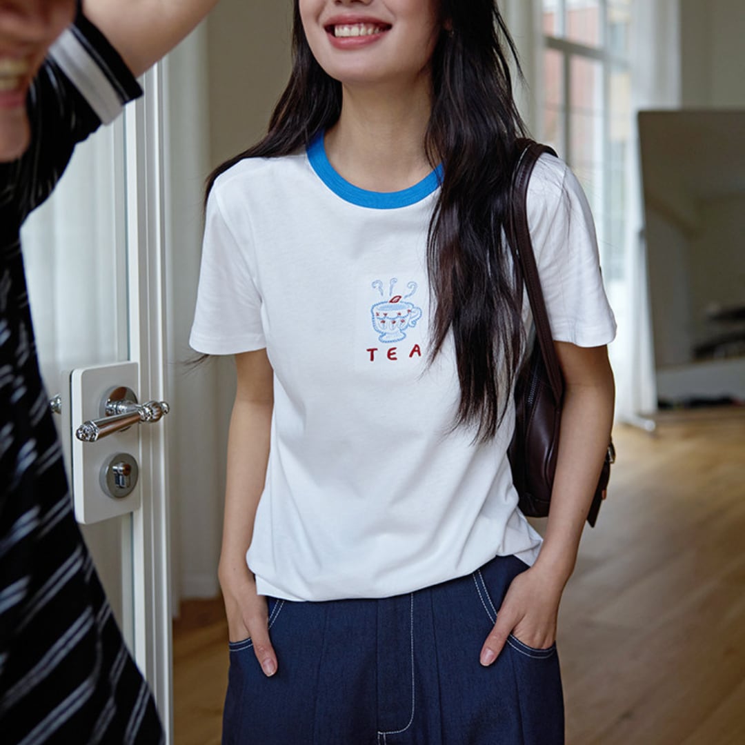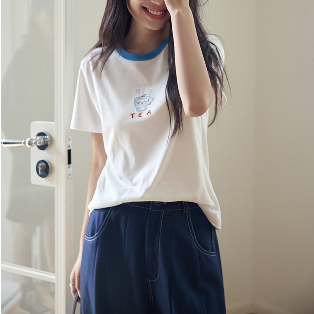 胸元にあしらわれたティーカップモチーフの刺繍がさりげないアクセントになる、やわらかなコットン素材の半袖Tシャツ。