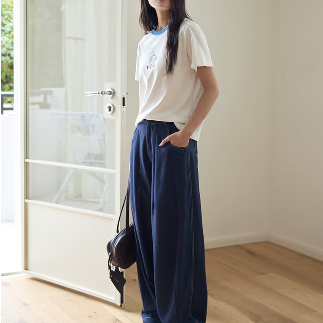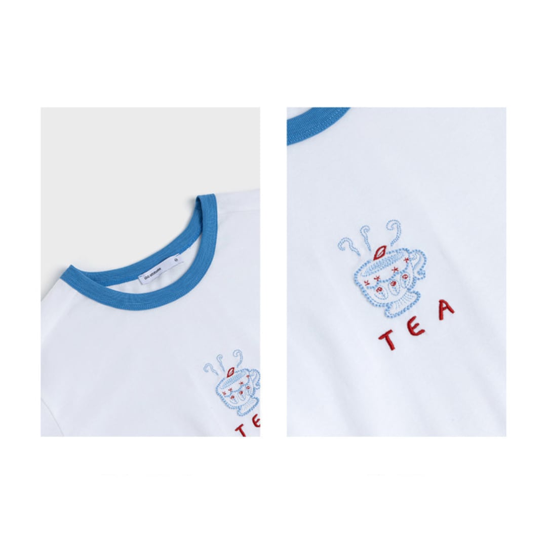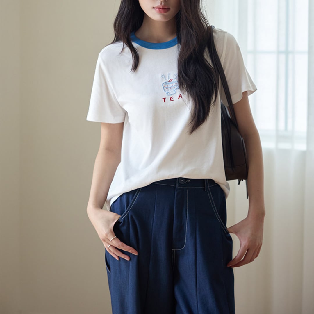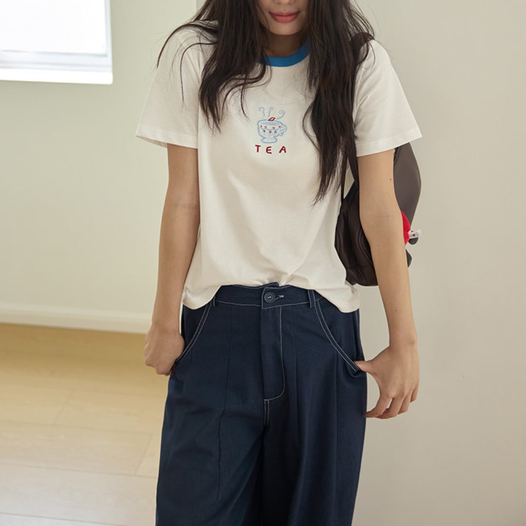胸元にあしらわれたティーカップモチーフの刺繍がさりげないアクセントになる、やわらかなコットン素材の半袖Tシャツ。