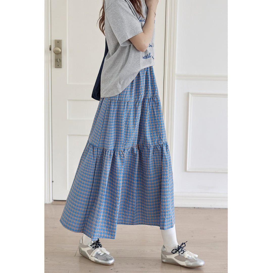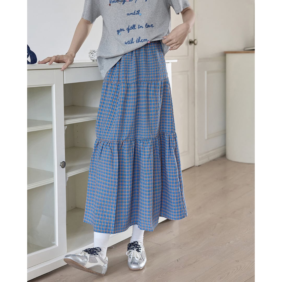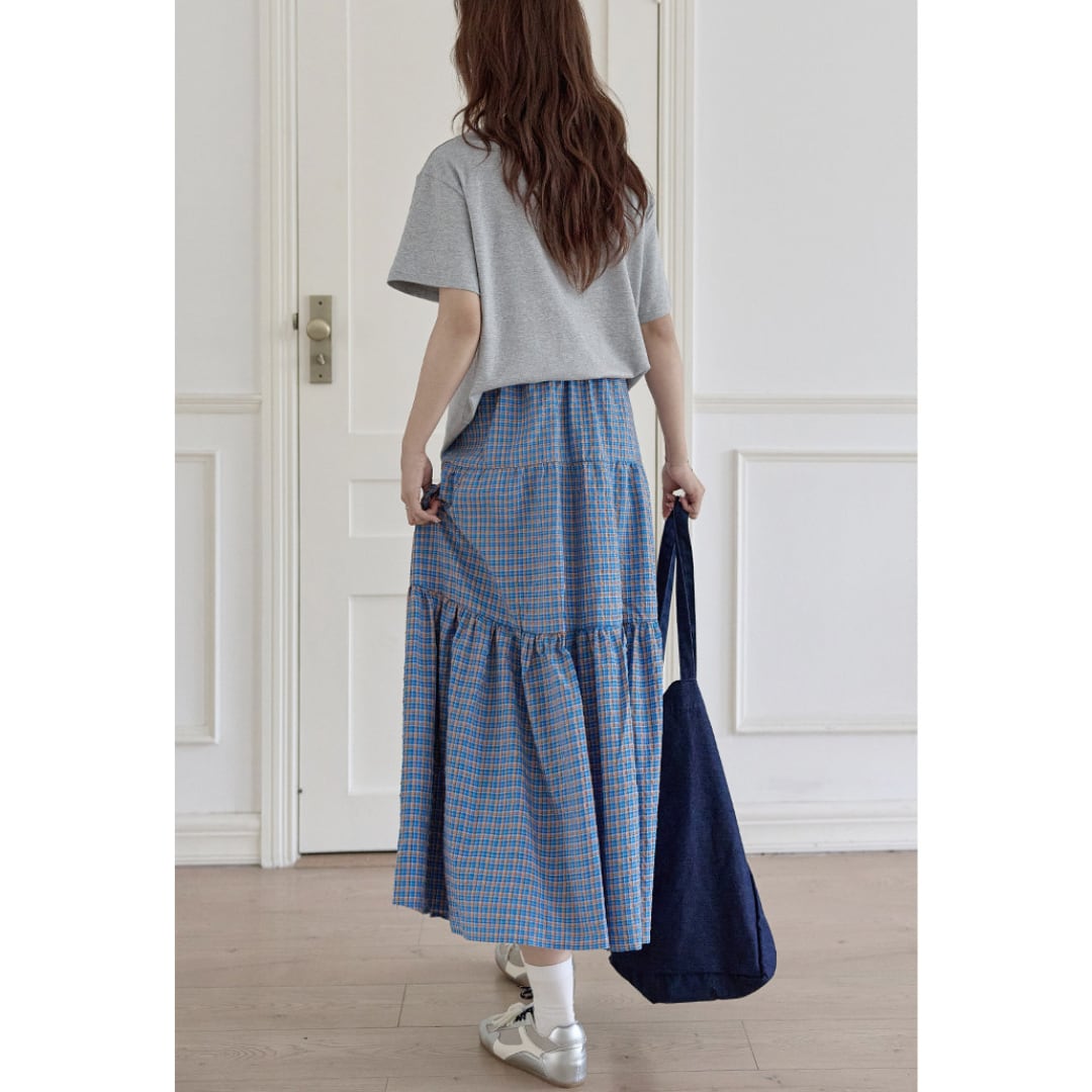 軽やかなチェック柄とふんわり広がるティアードデザインが印象的な、動きのあるシルエットが魅力のロングスカート。