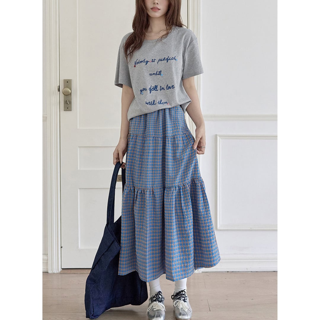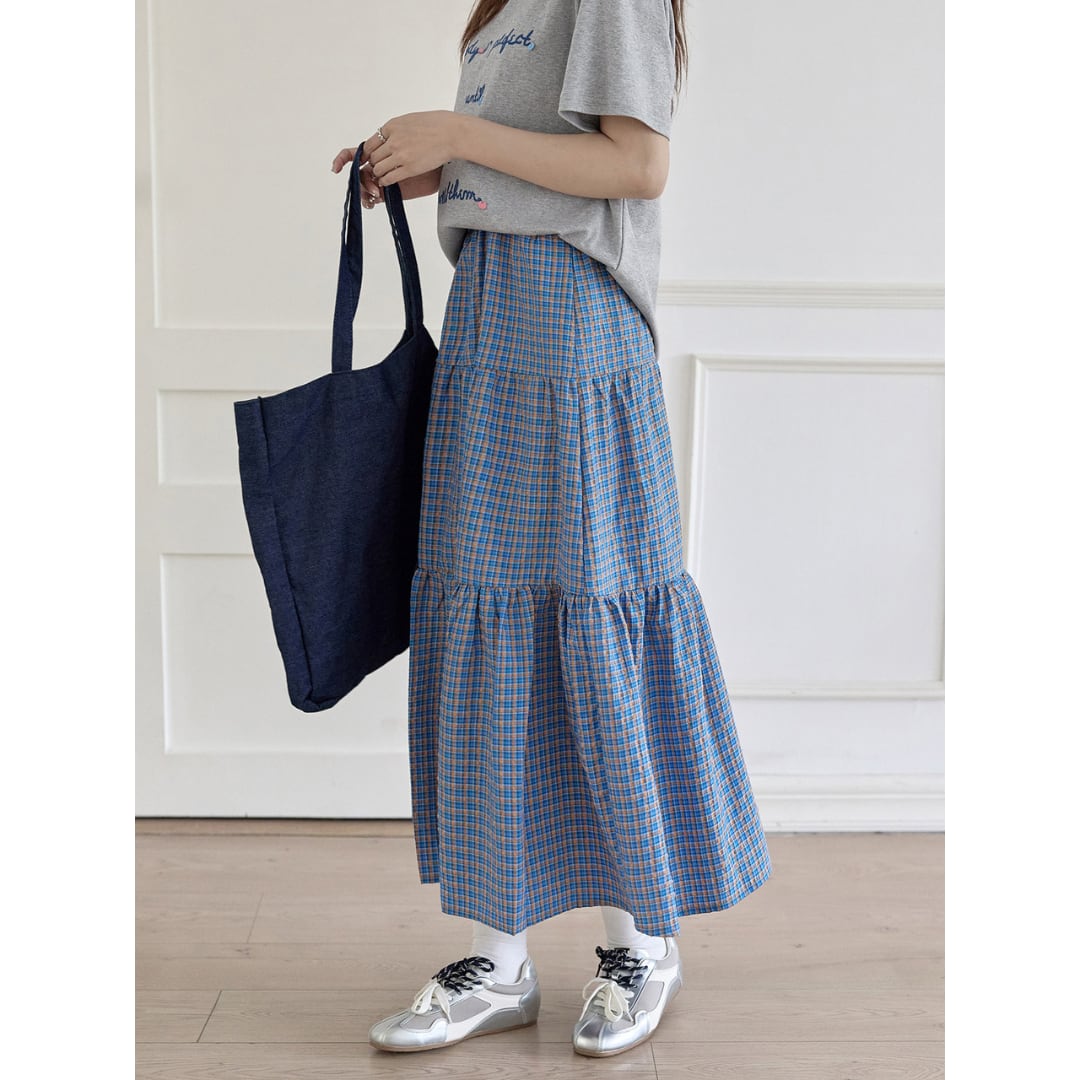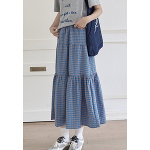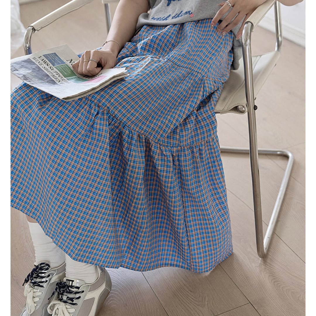 軽やかなチェック柄とふんわり広がるティアードデザインが印象的な、動きのあるシルエットが魅力のロングスカート。