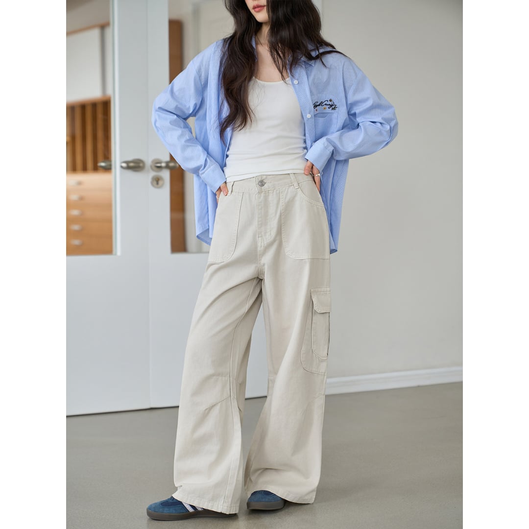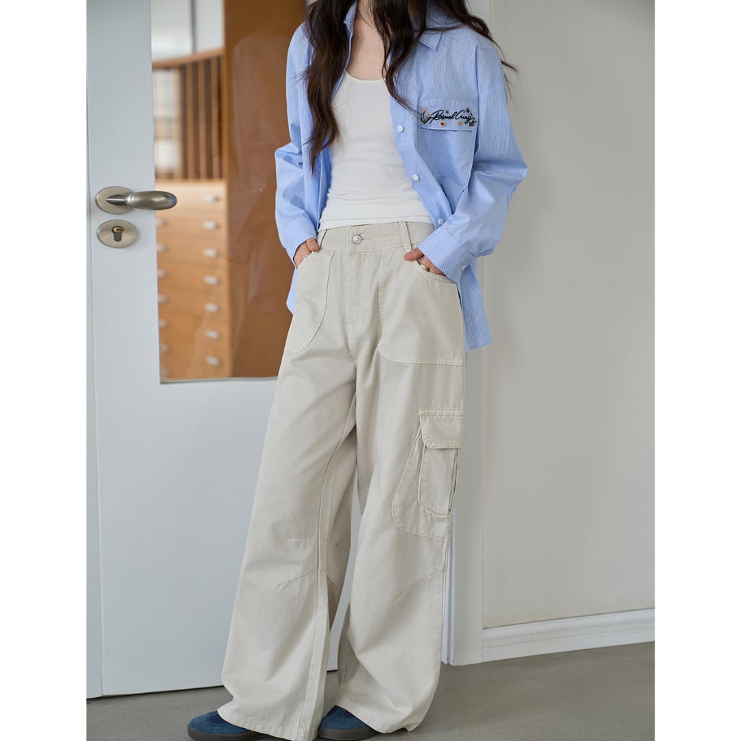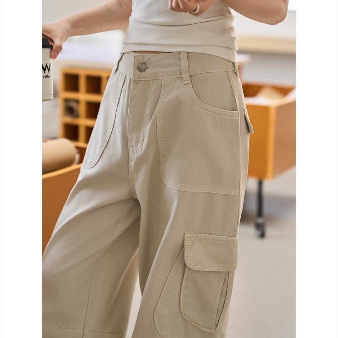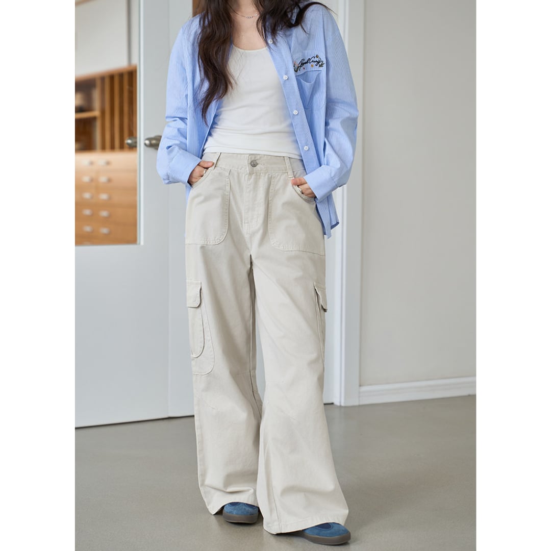 ゆったりとしたワイドストレートシルエットと立体的なポケットデザインが特徴の、カジュアルな雰囲気を演出するカーゴパンツ。