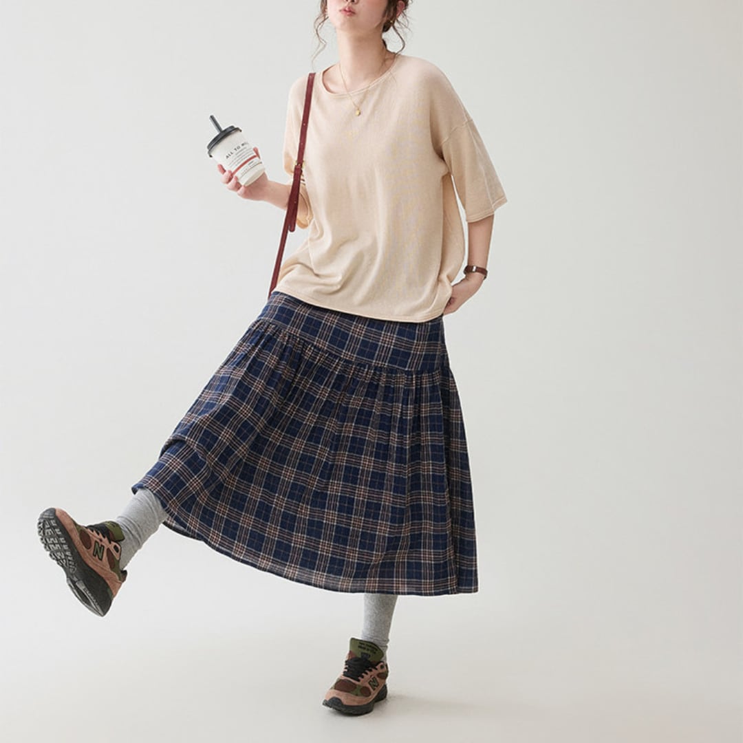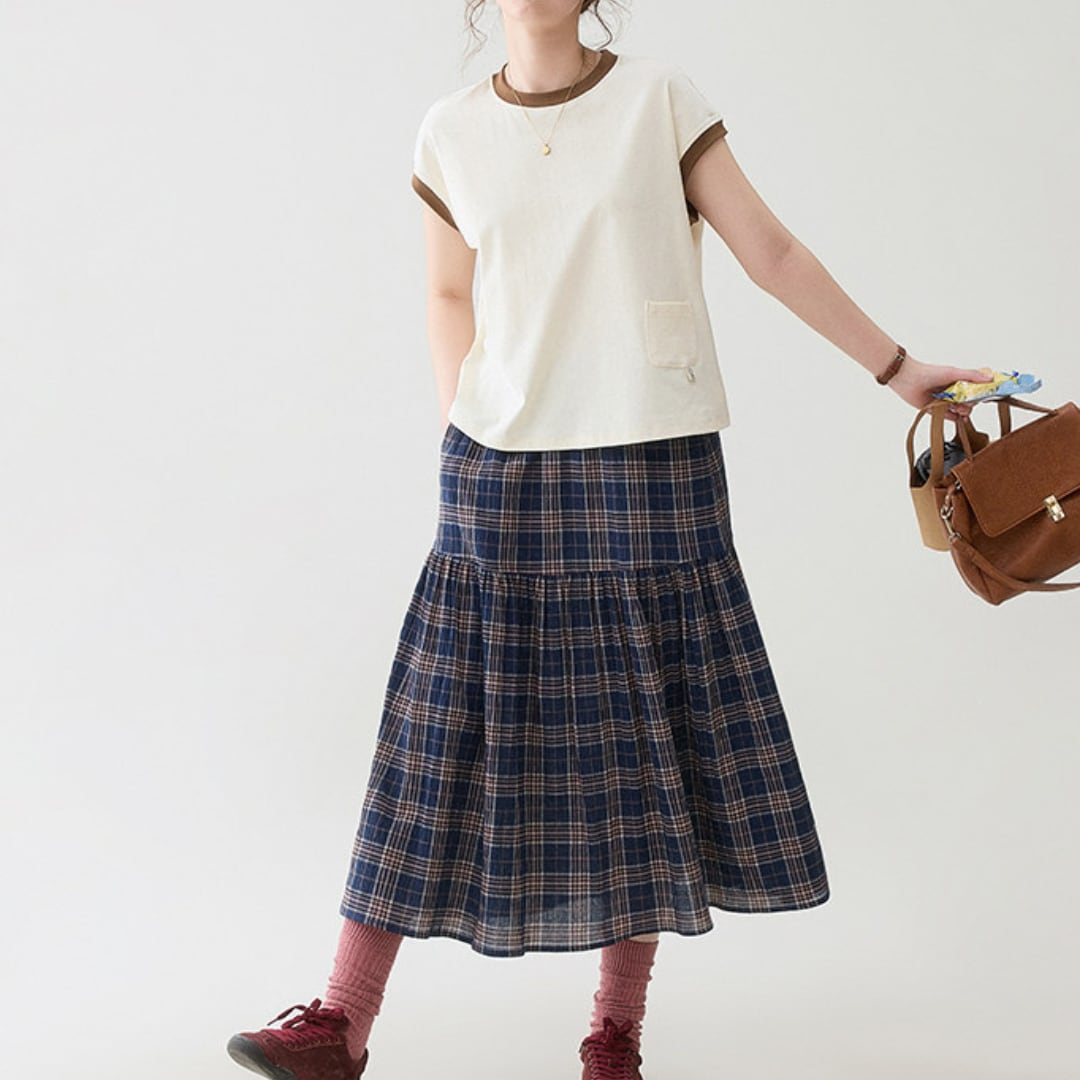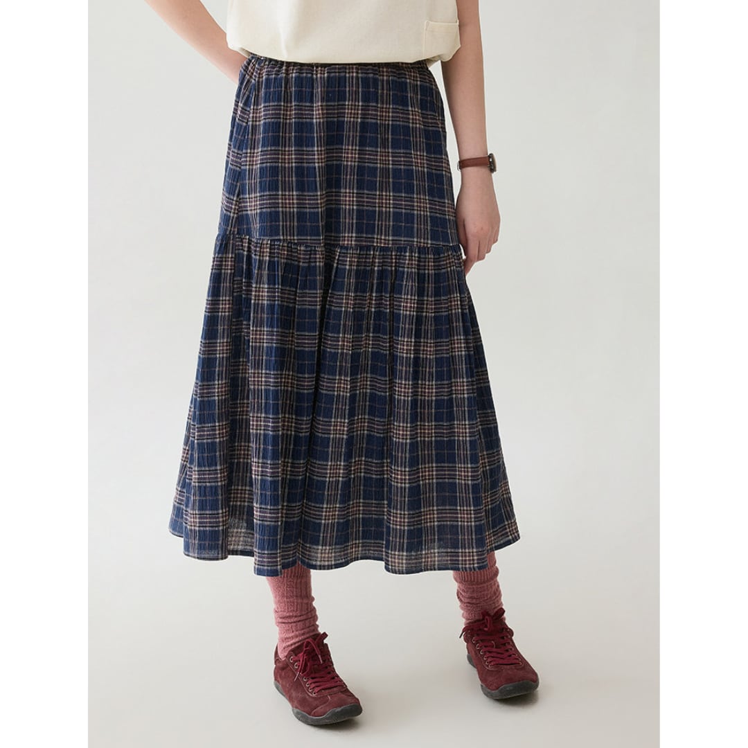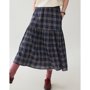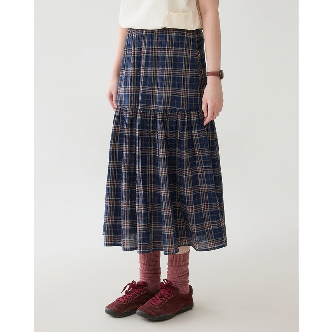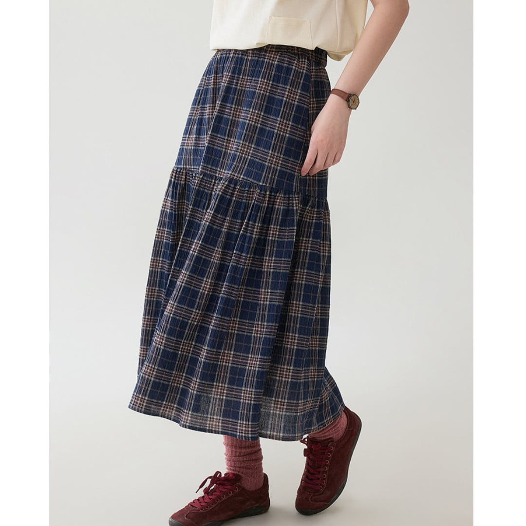 落ち着いたチェック柄とふんわり広がるティアードデザインが魅力のロングスカートで、ナチュラルな雰囲気と程よいボリューム感がコーデに柔らかな印象をプラスしてくれます。