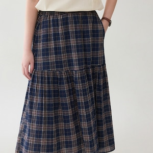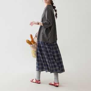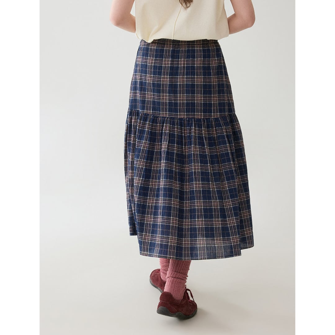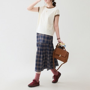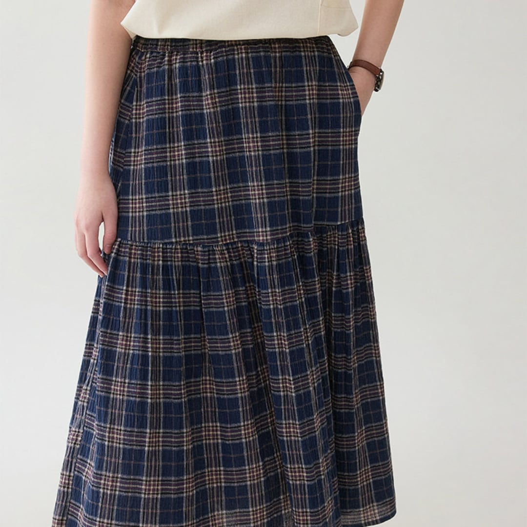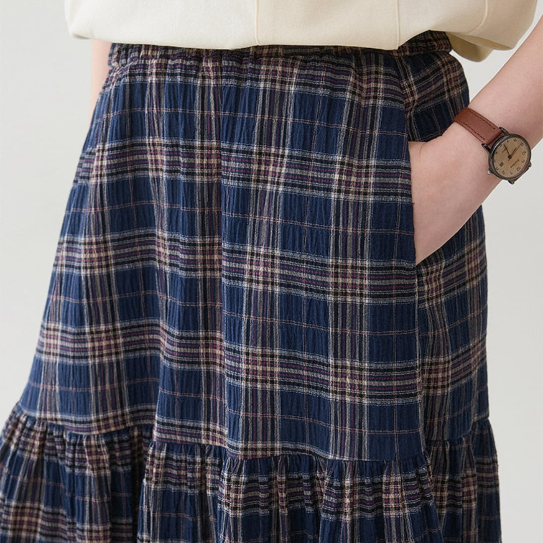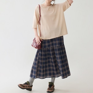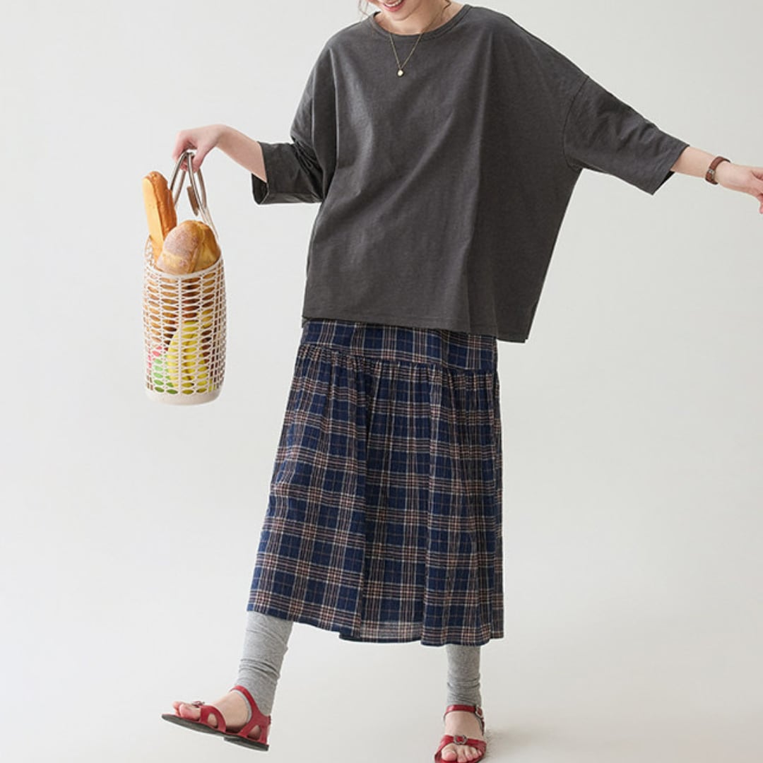 落ち着いたチェック柄とふんわり広がるティアードデザインが魅力のロングスカートで、ナチュラルな雰囲気と程よいボリューム感がコーデに柔らかな印象をプラスしてくれます。