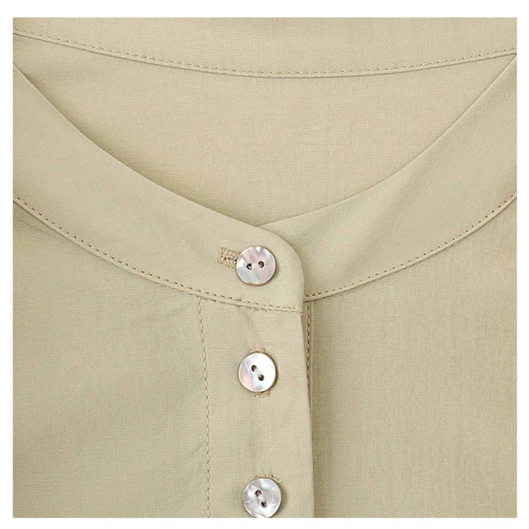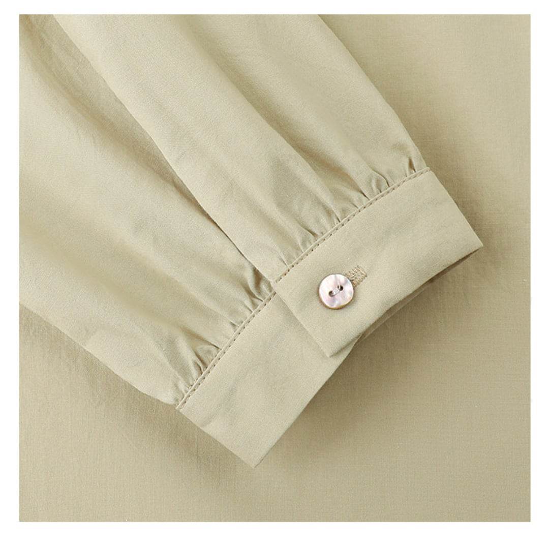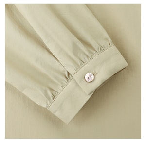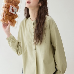 フロントに並んだボタンデザインとゆったりとしたシルエットが特徴の長袖ブラウスで、やわらかな風合いとナチュラルな雰囲気が上品な印象を演出してくれます。