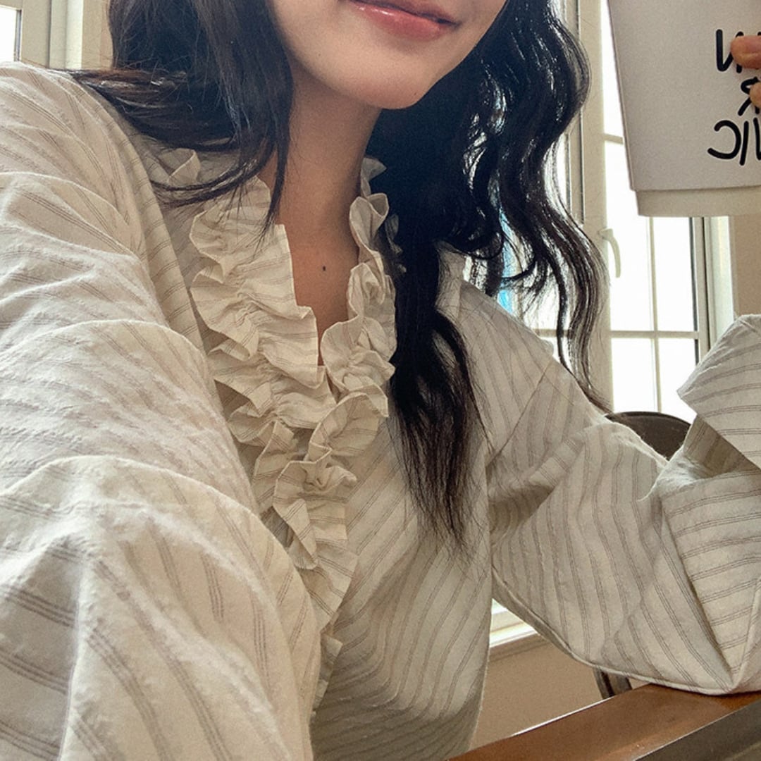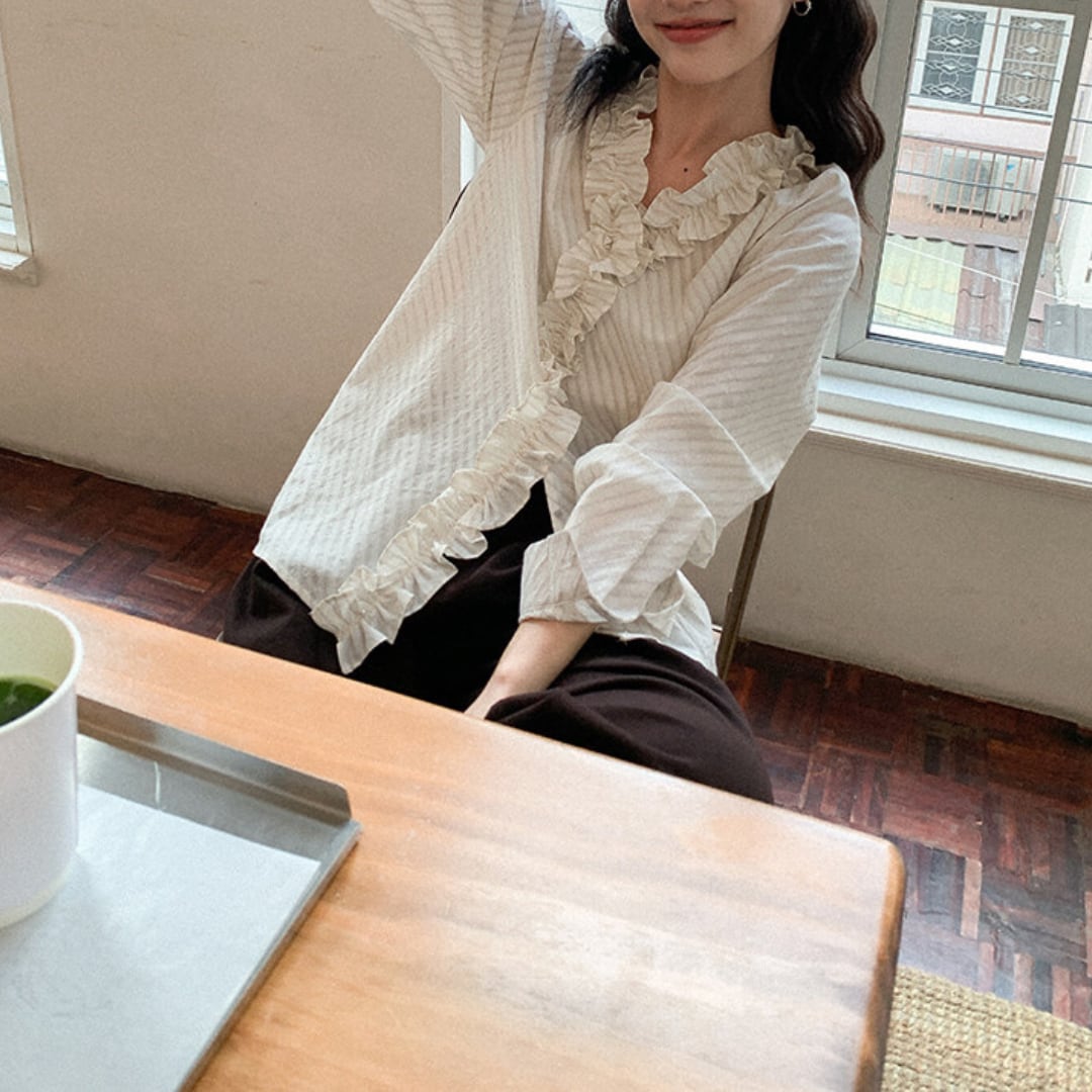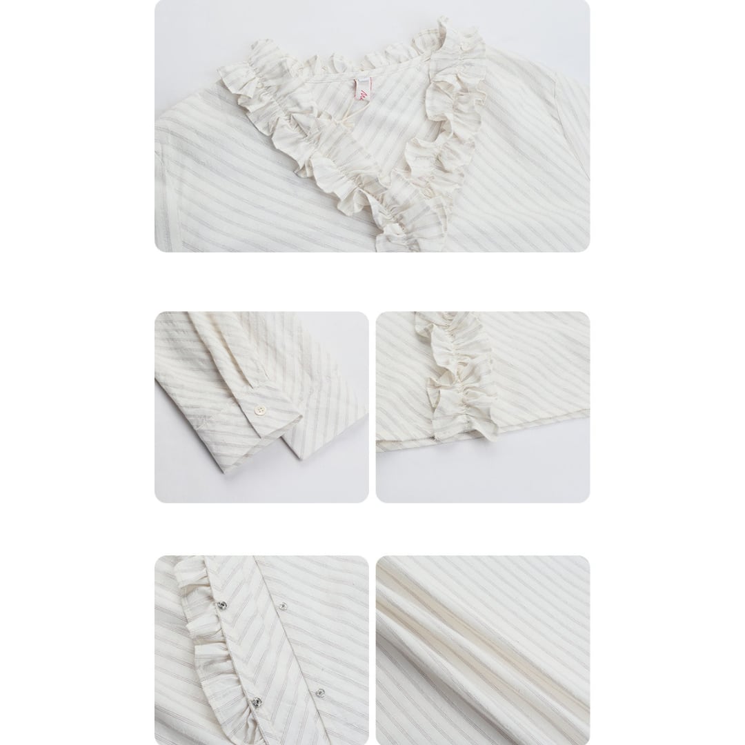繊細なストライプ柄にフリルディテールをあしらったデザインが印象的なブラウスで、やわらかな雰囲気と上品な立体感がコーデに華やかさをプラスしてくれる一枚です。