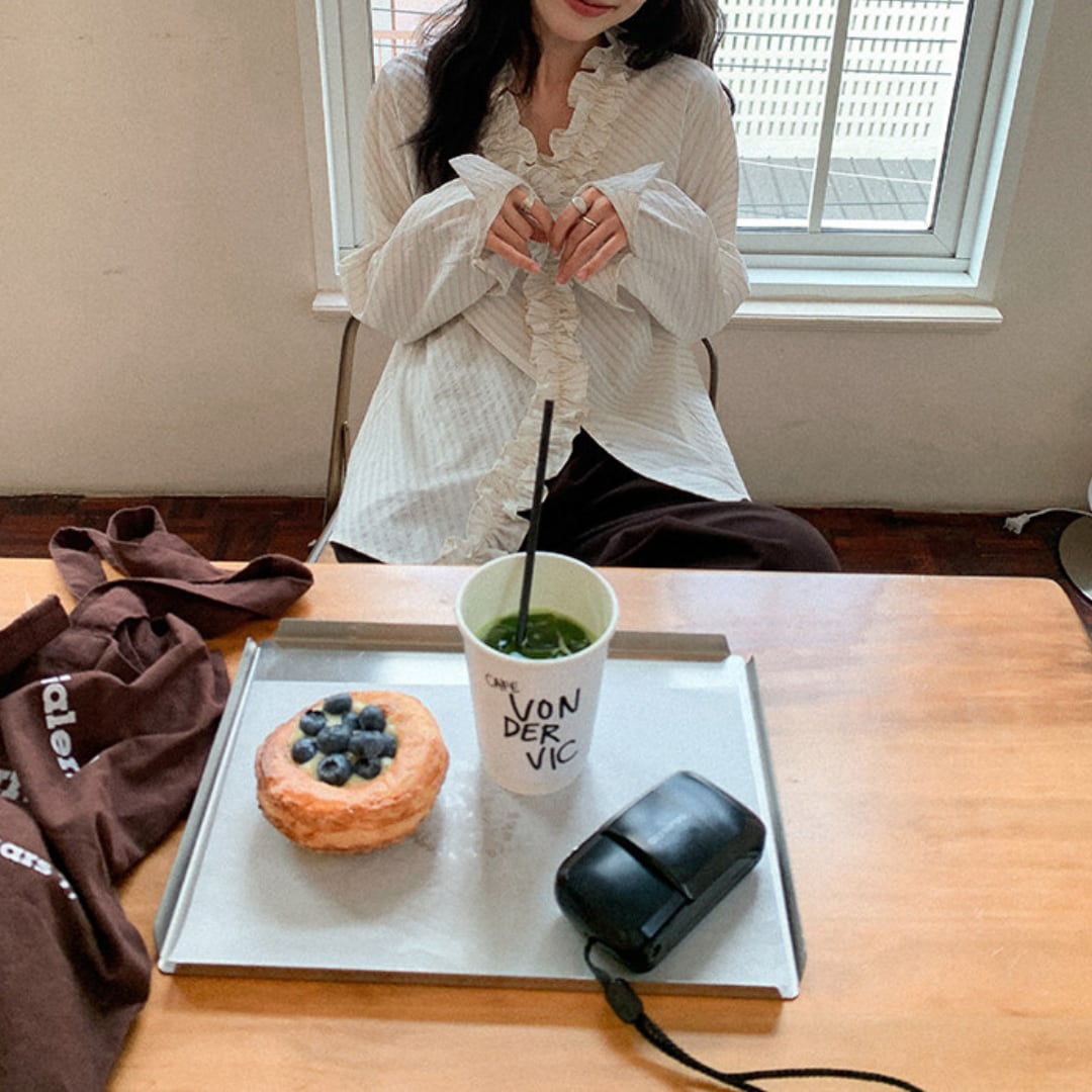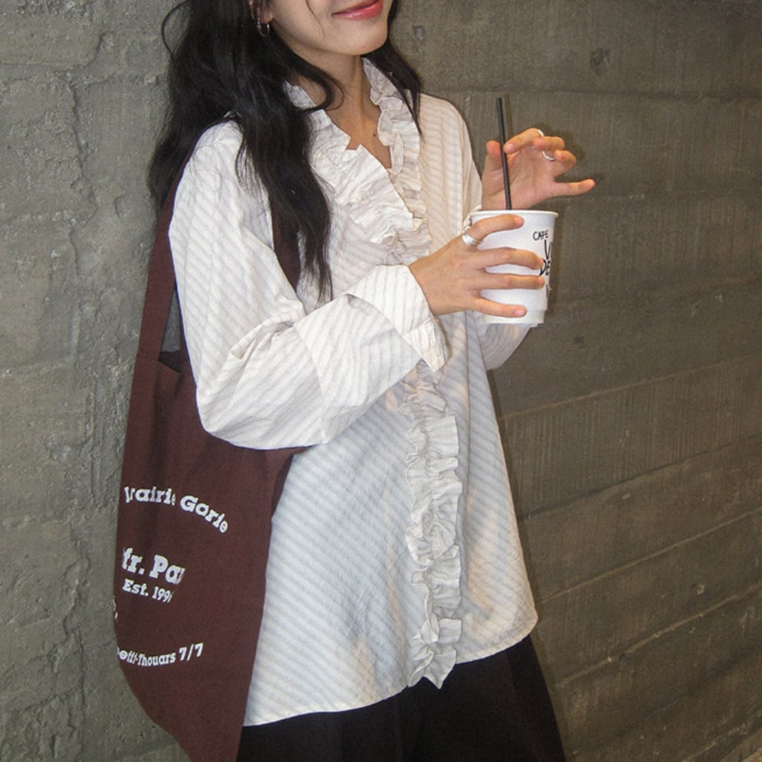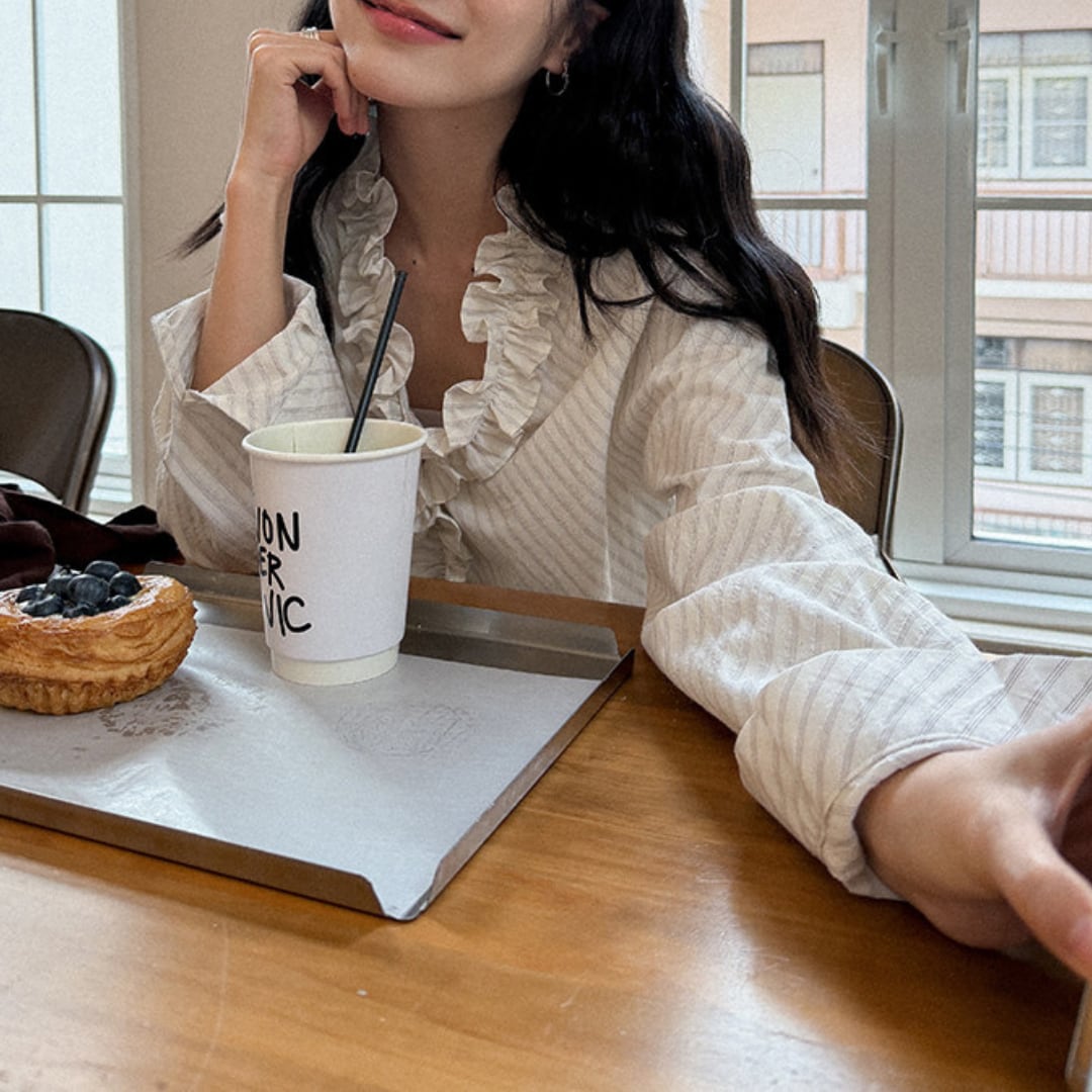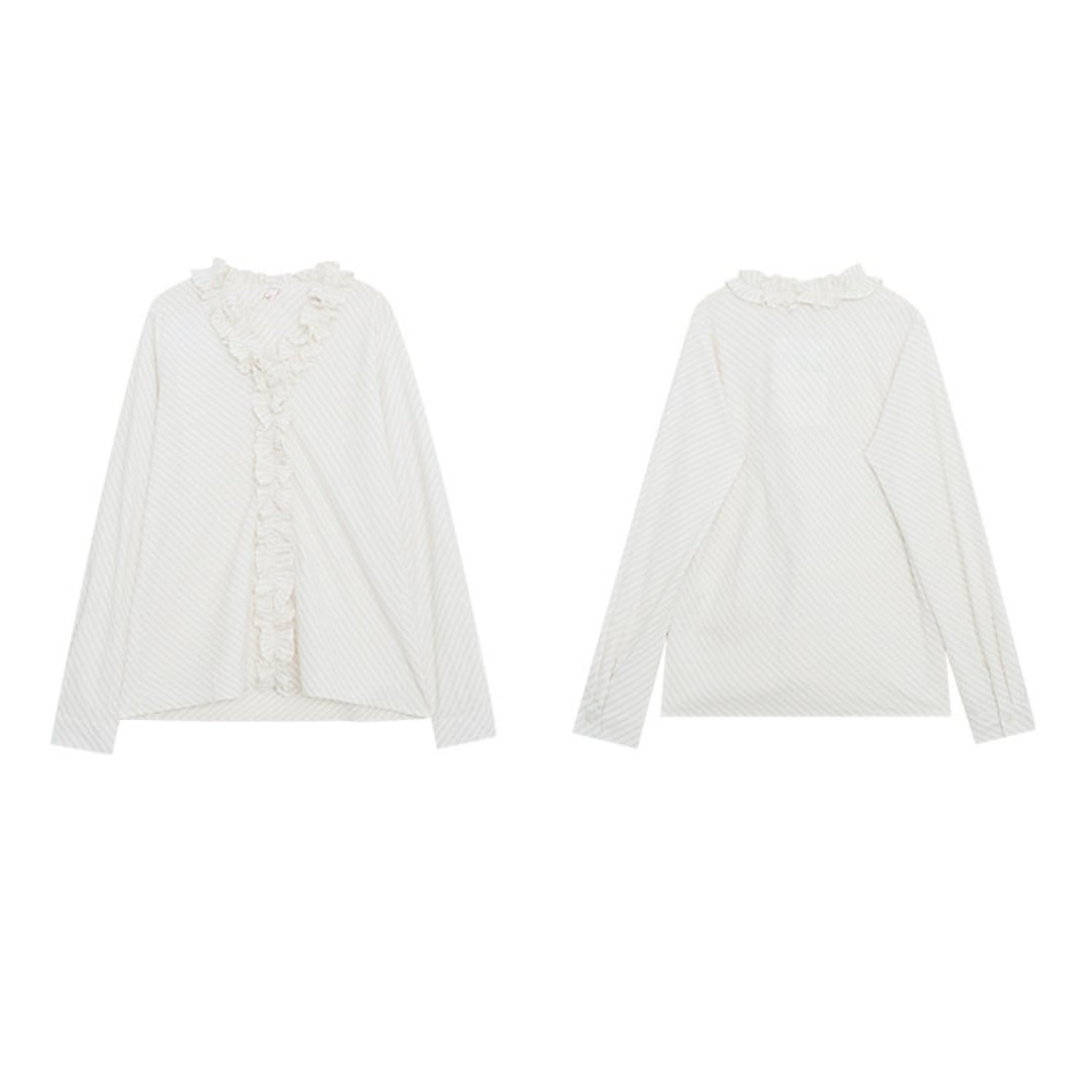 繊細なストライプ柄にフリルディテールをあしらったデザインが印象的なブラウスで、やわらかな雰囲気と上品な立体感がコーデに華やかさをプラスしてくれる一枚です。