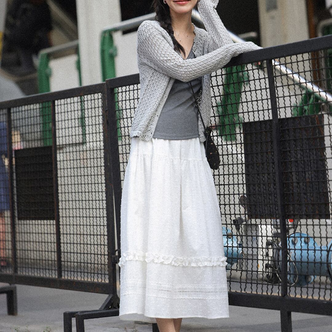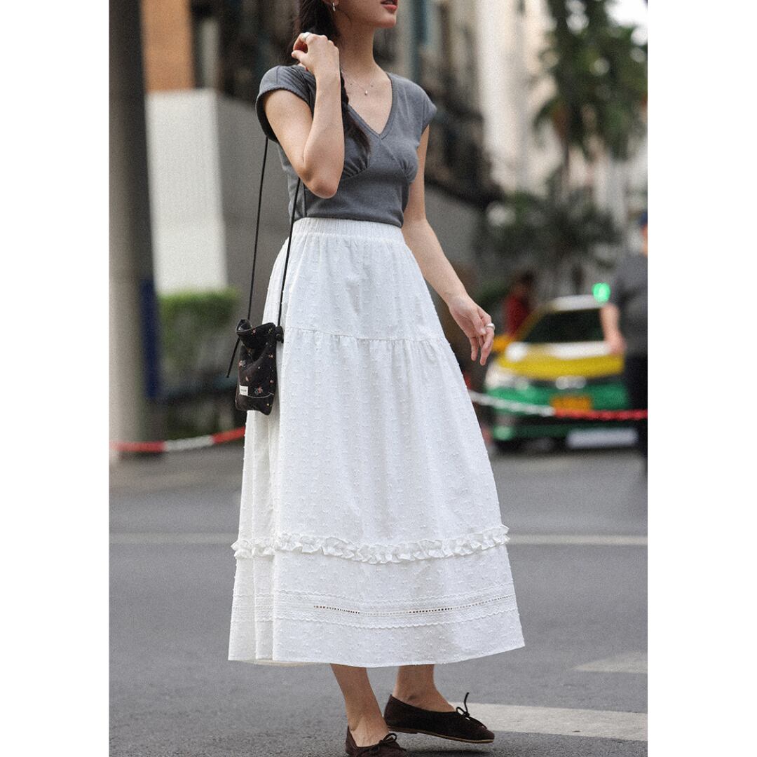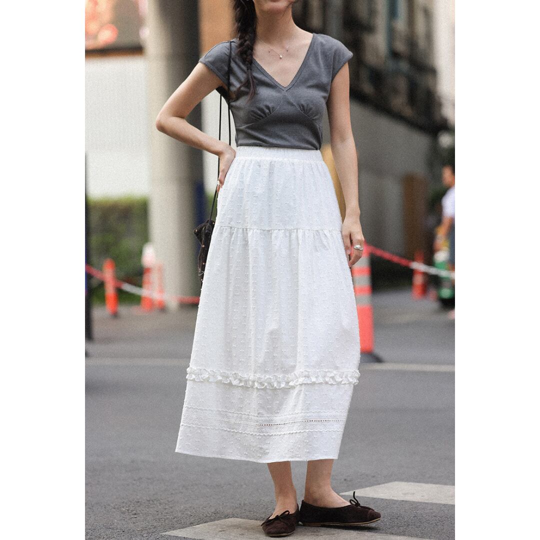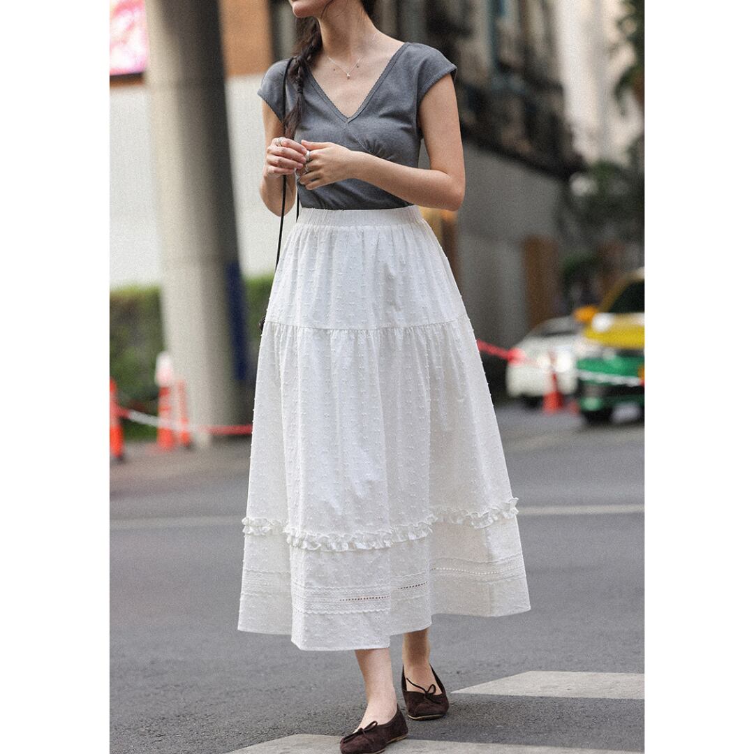 繊細な凹凸感のある生地とティアードデザインが重なり合い、軽やかで女性らしい印象を演出するロングスカート。