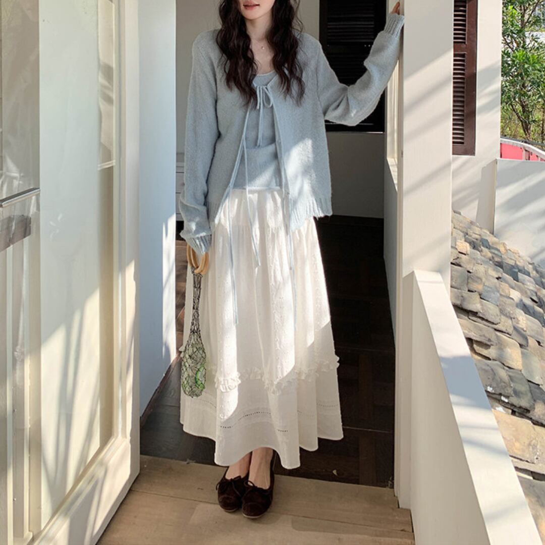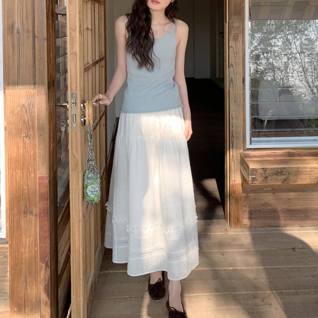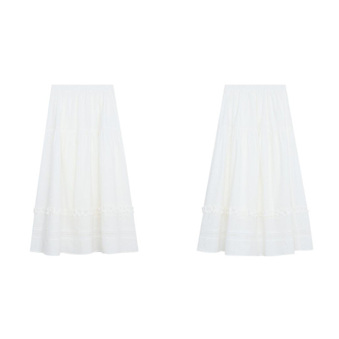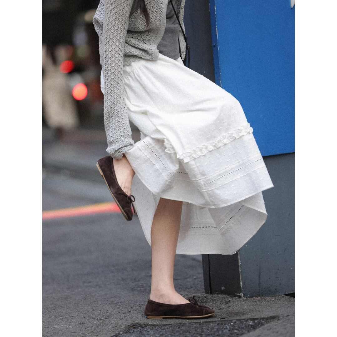 繊細な凹凸感のある生地とティアードデザインが重なり合い、軽やかで女性らしい印象を演出するロングスカート。