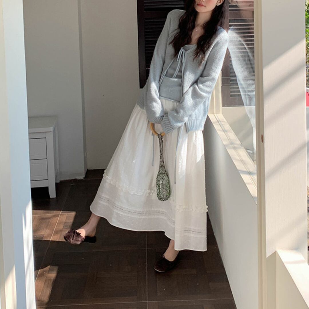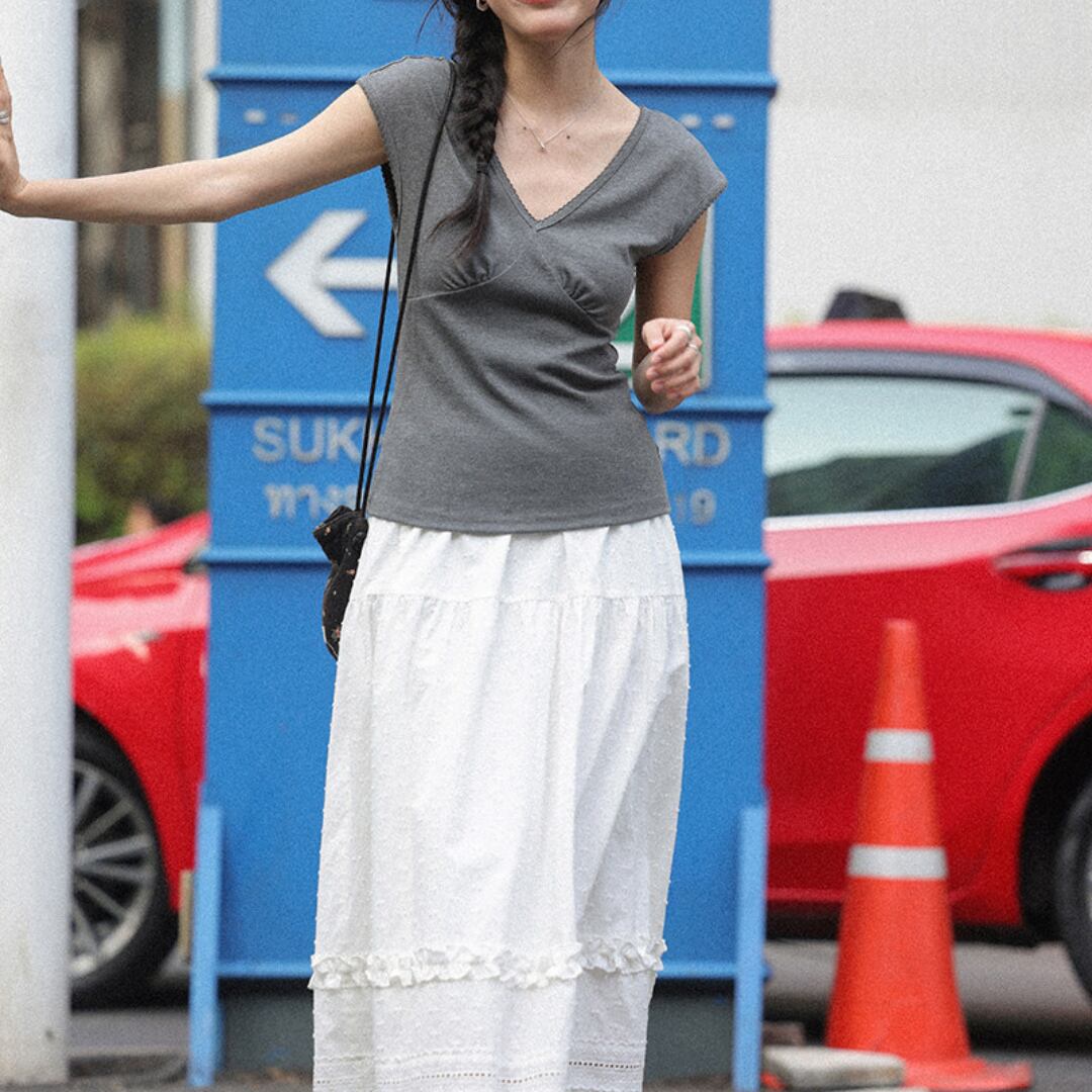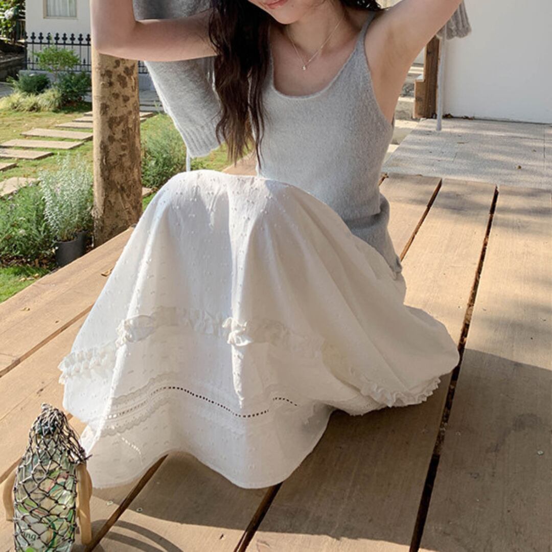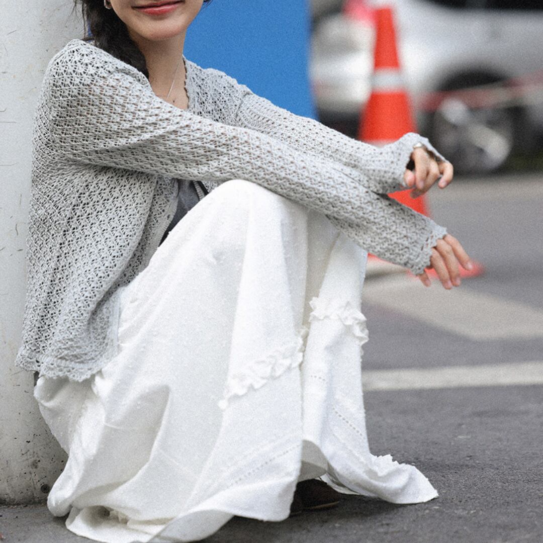 繊細な凹凸感のある生地とティアードデザインが重なり合い、軽やかで女性らしい印象を演出するロングスカート。