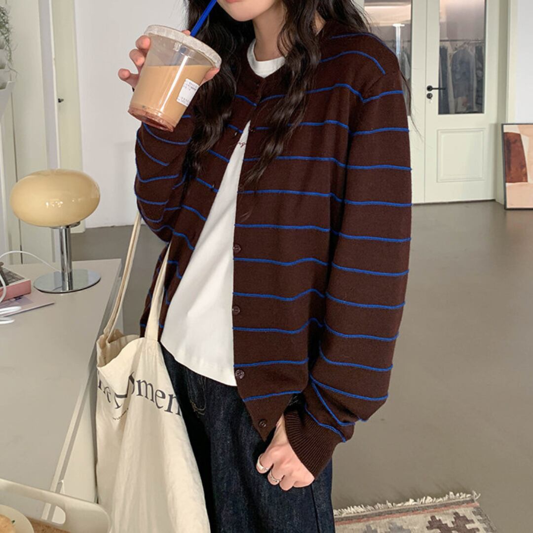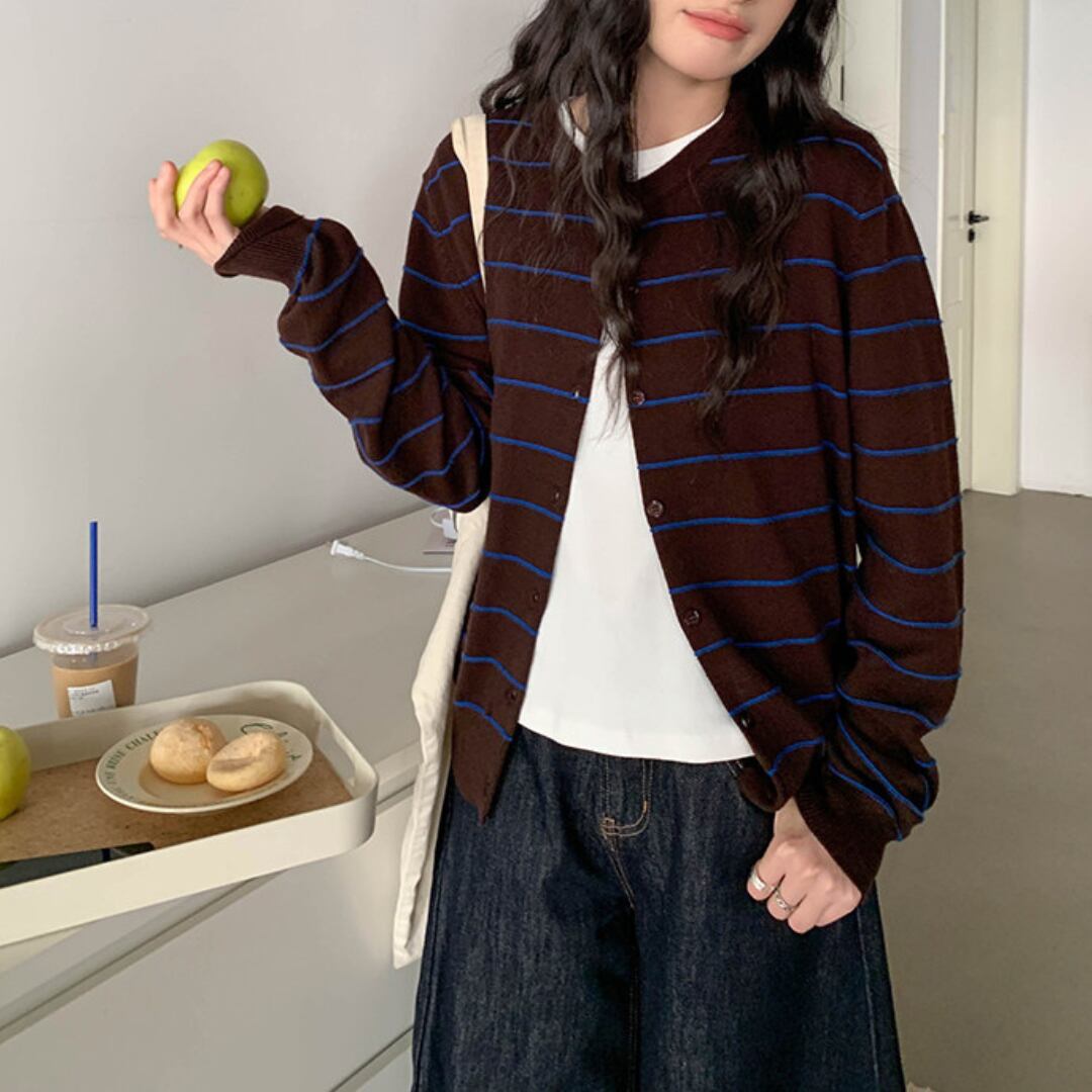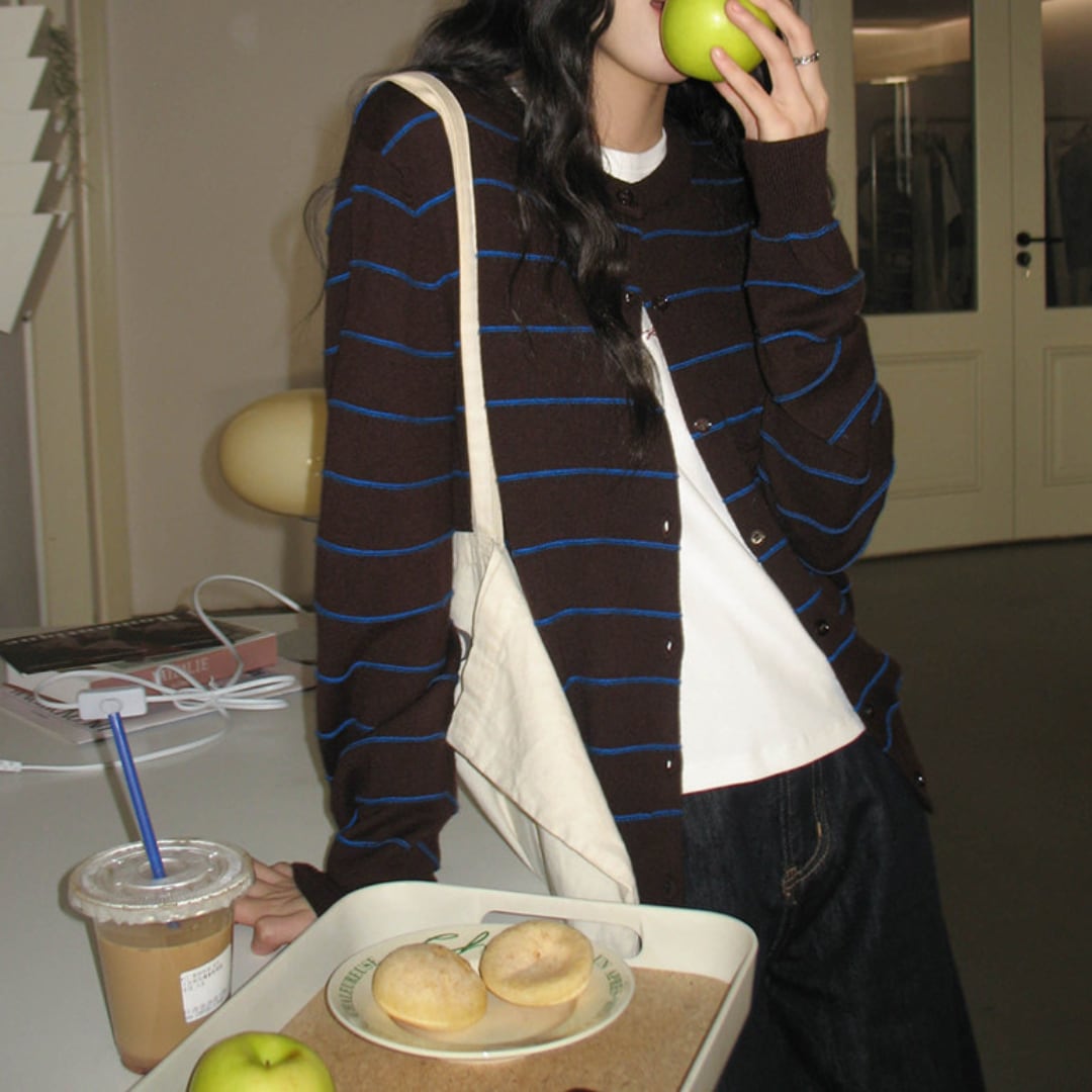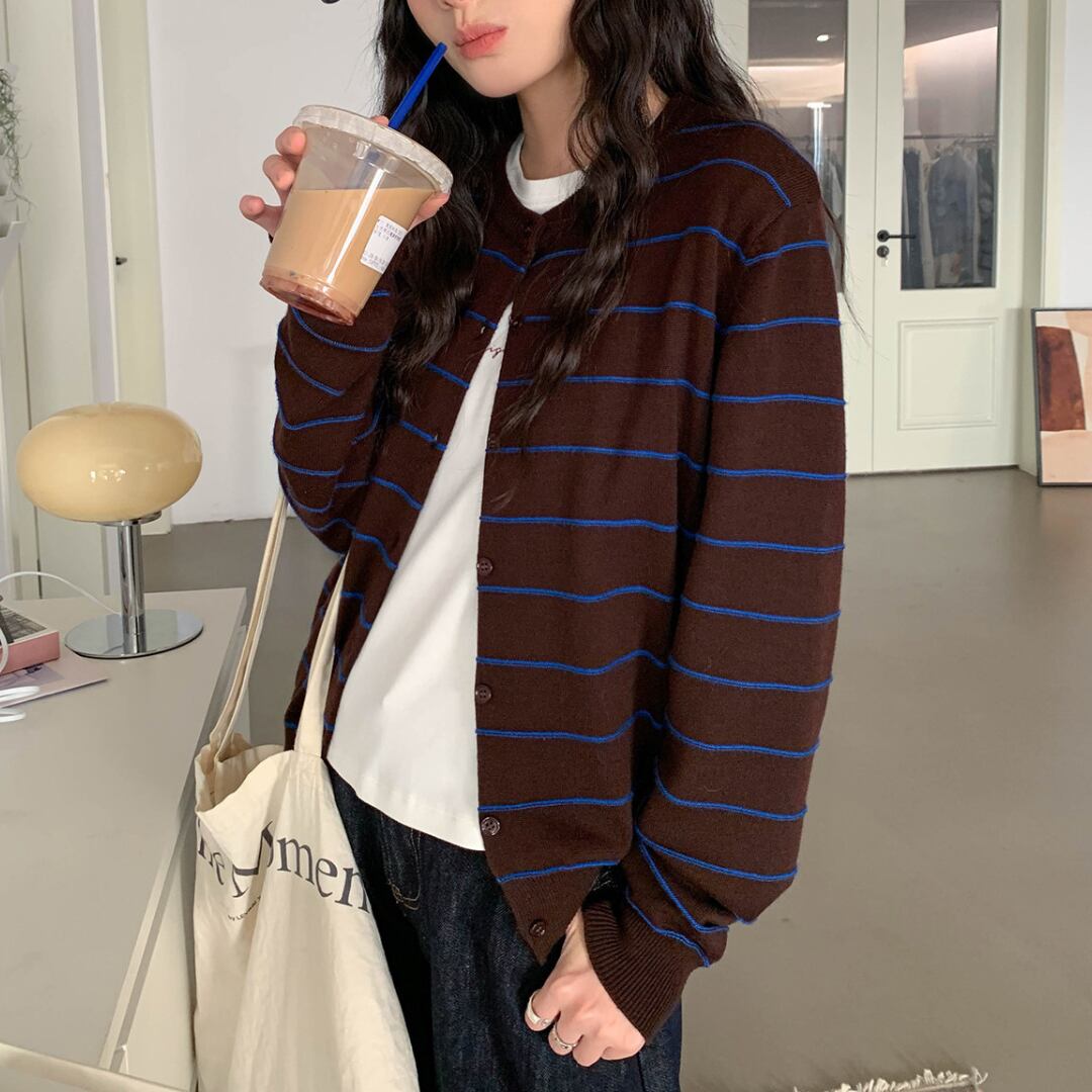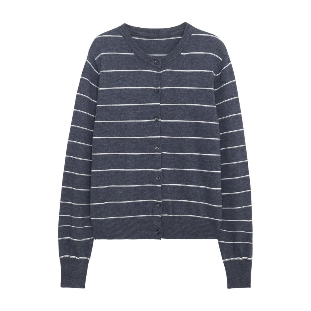 細めのボーダー柄がさりげないアクセントになり、柔らかなニット素材でリラックス感のある着心地に仕上げたカーディガン。