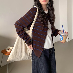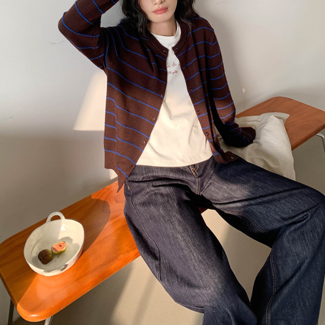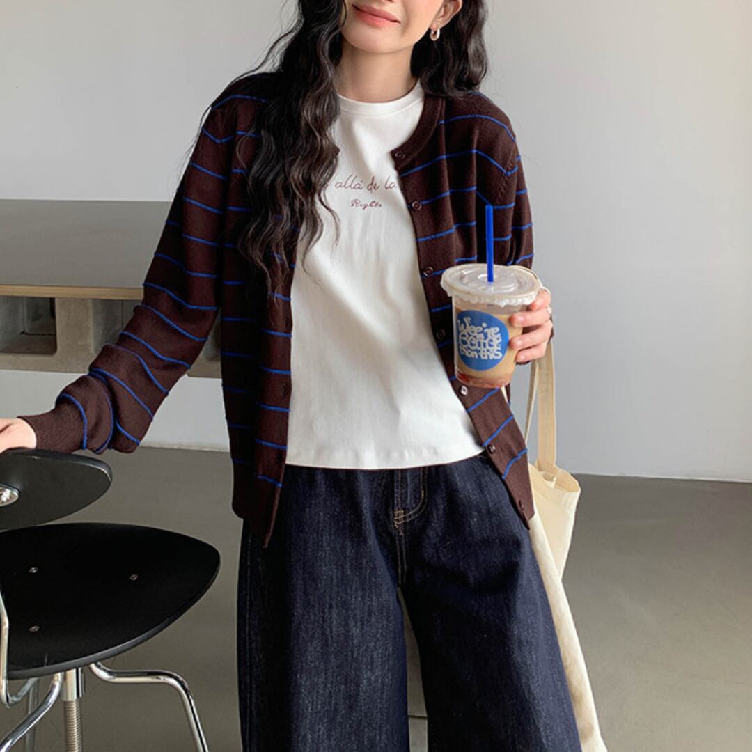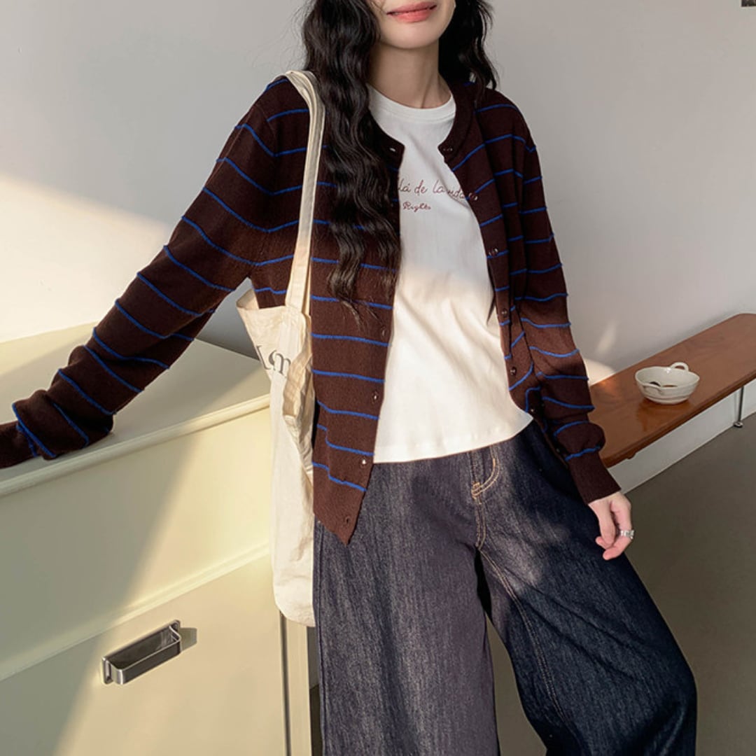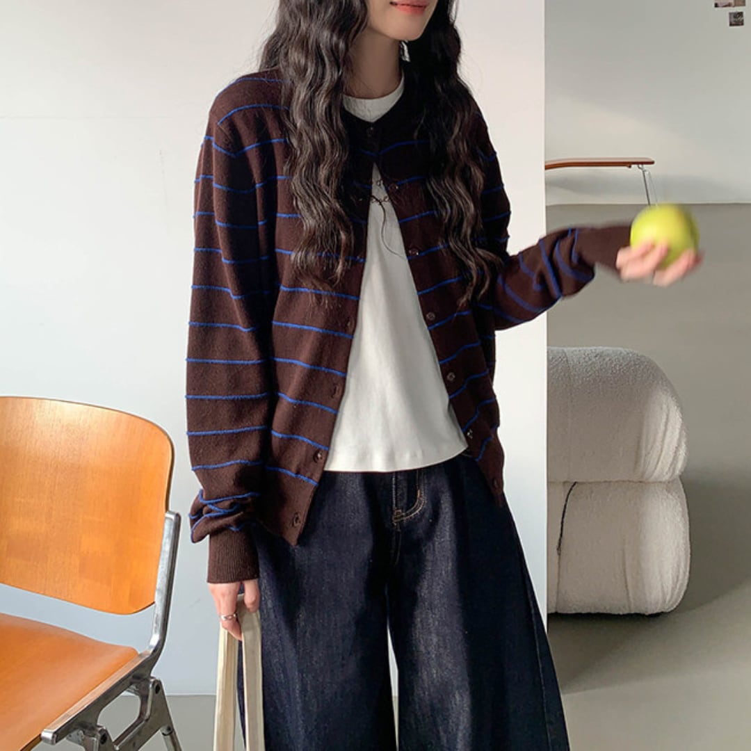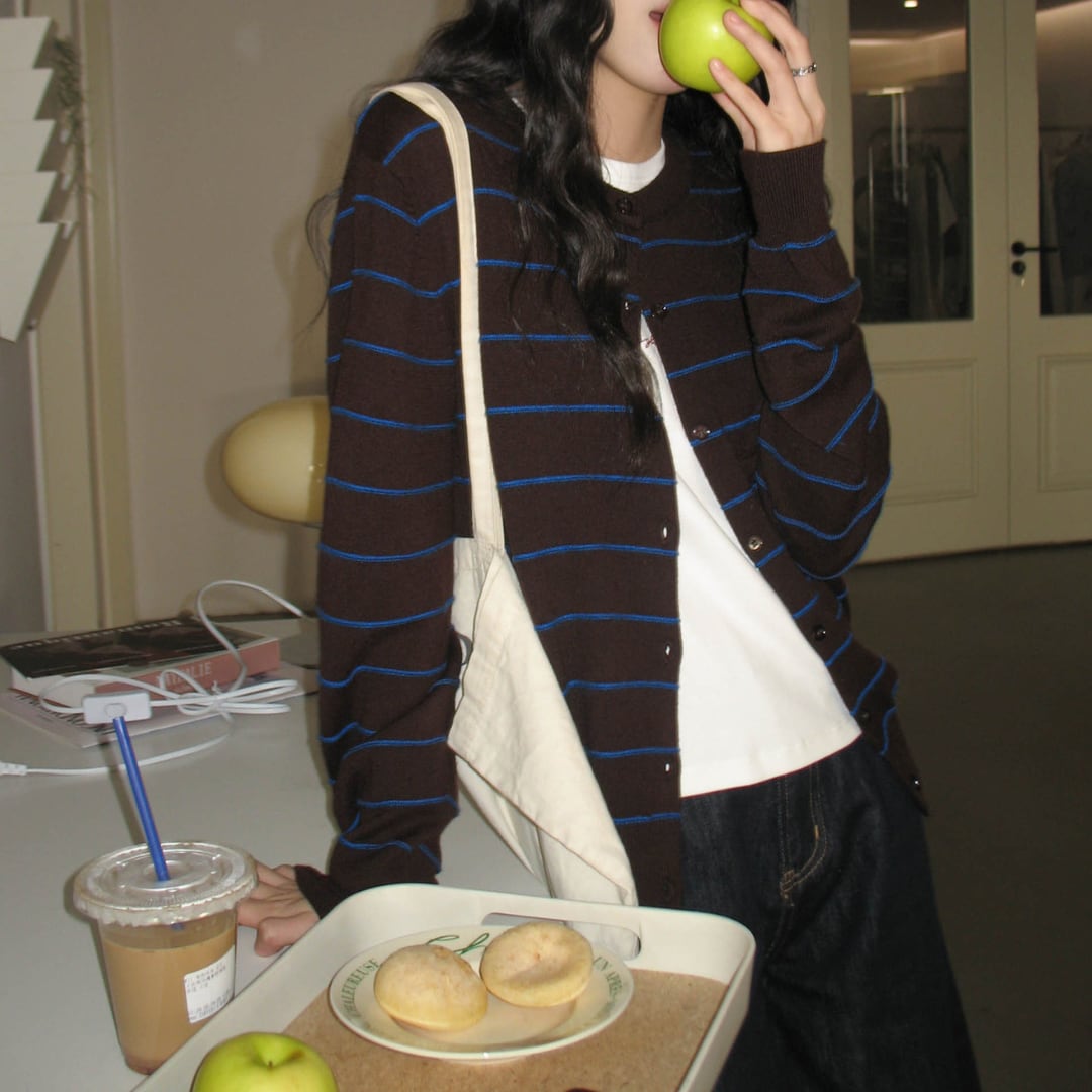 細めのボーダー柄がさりげないアクセントになり、柔らかなニット素材でリラックス感のある着心地に仕上げたカーディガン。