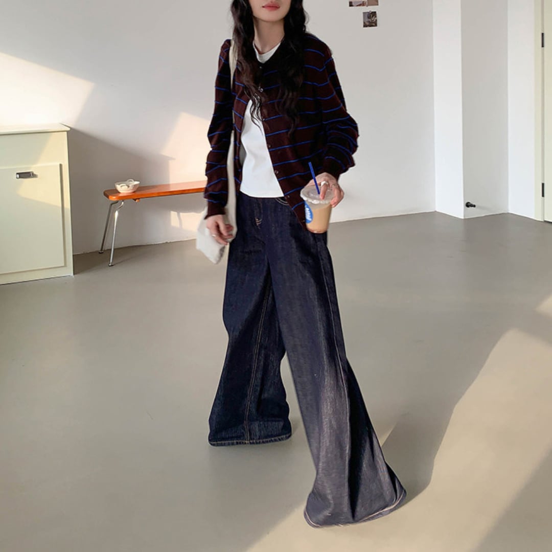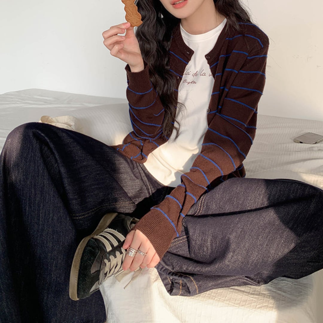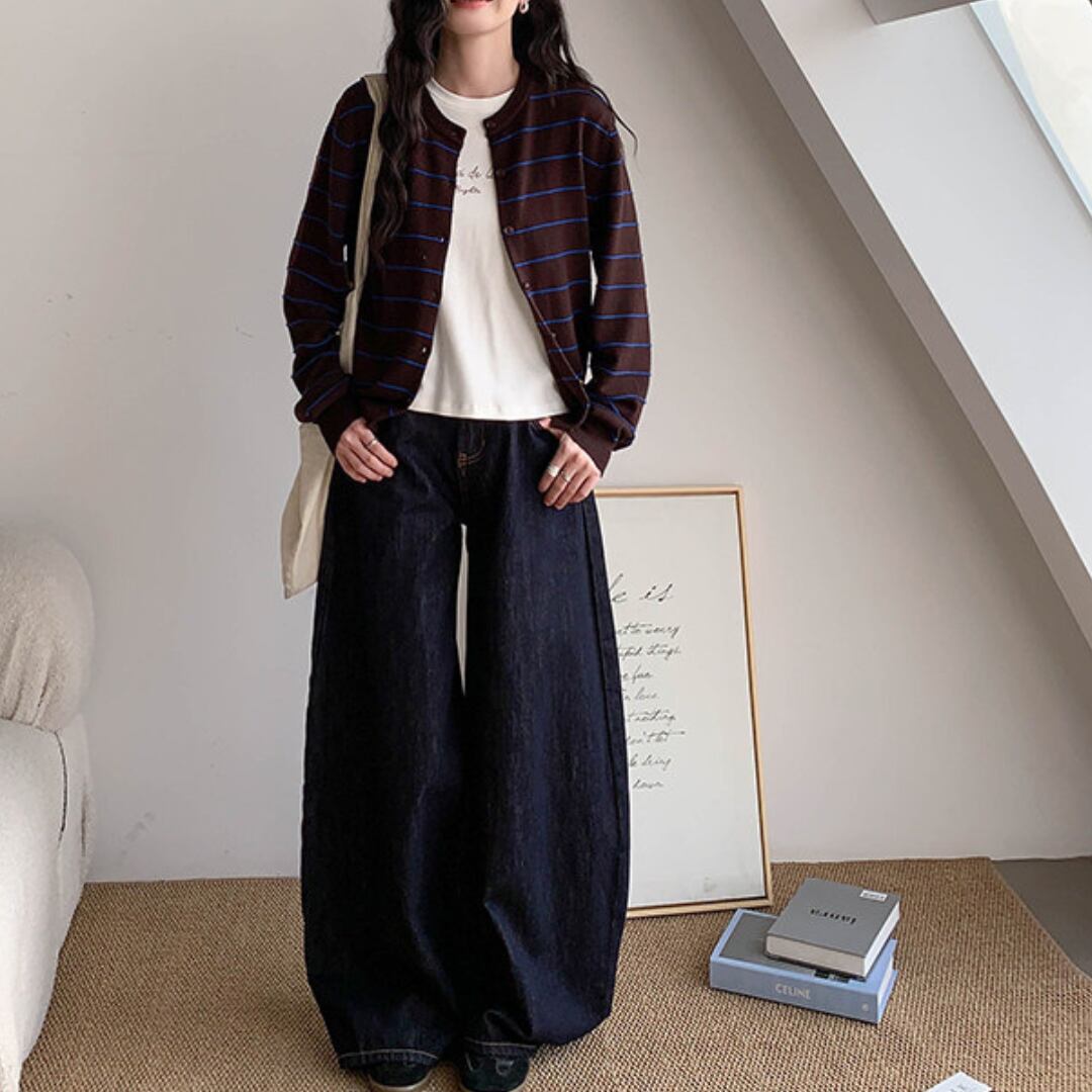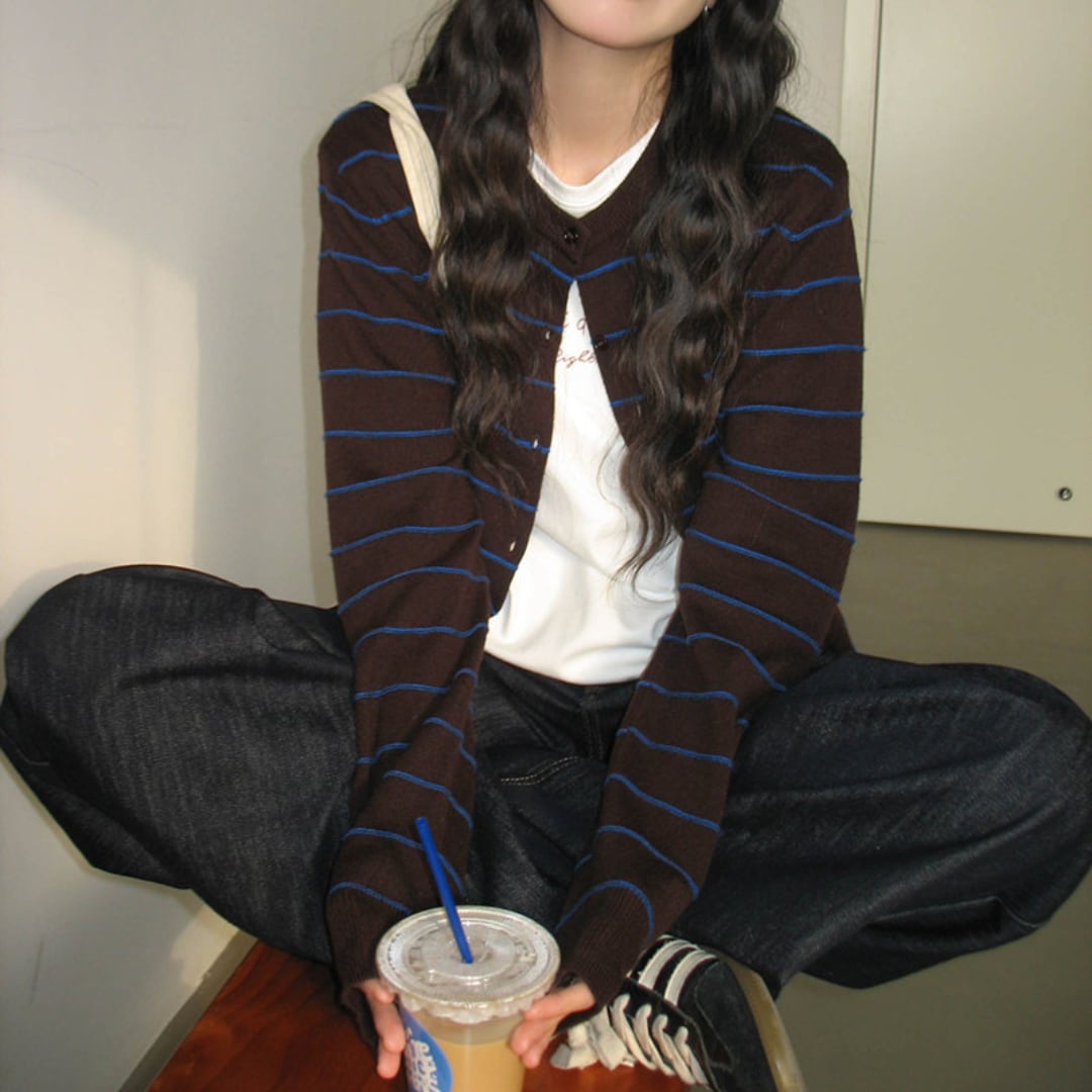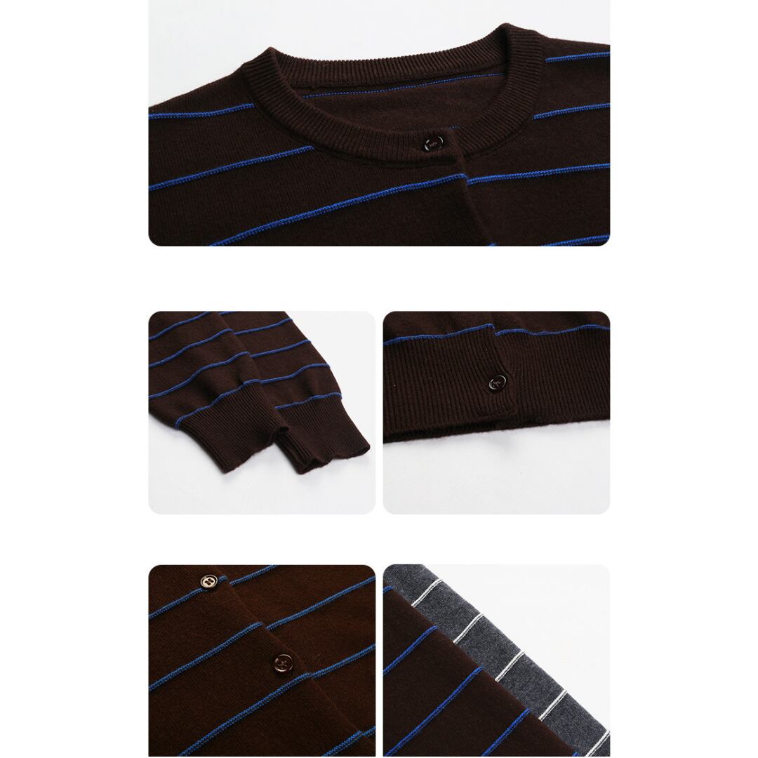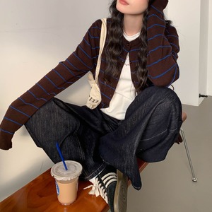 細めのボーダー柄がさりげないアクセントになり、柔らかなニット素材でリラックス感のある着心地に仕上げたカーディガン。