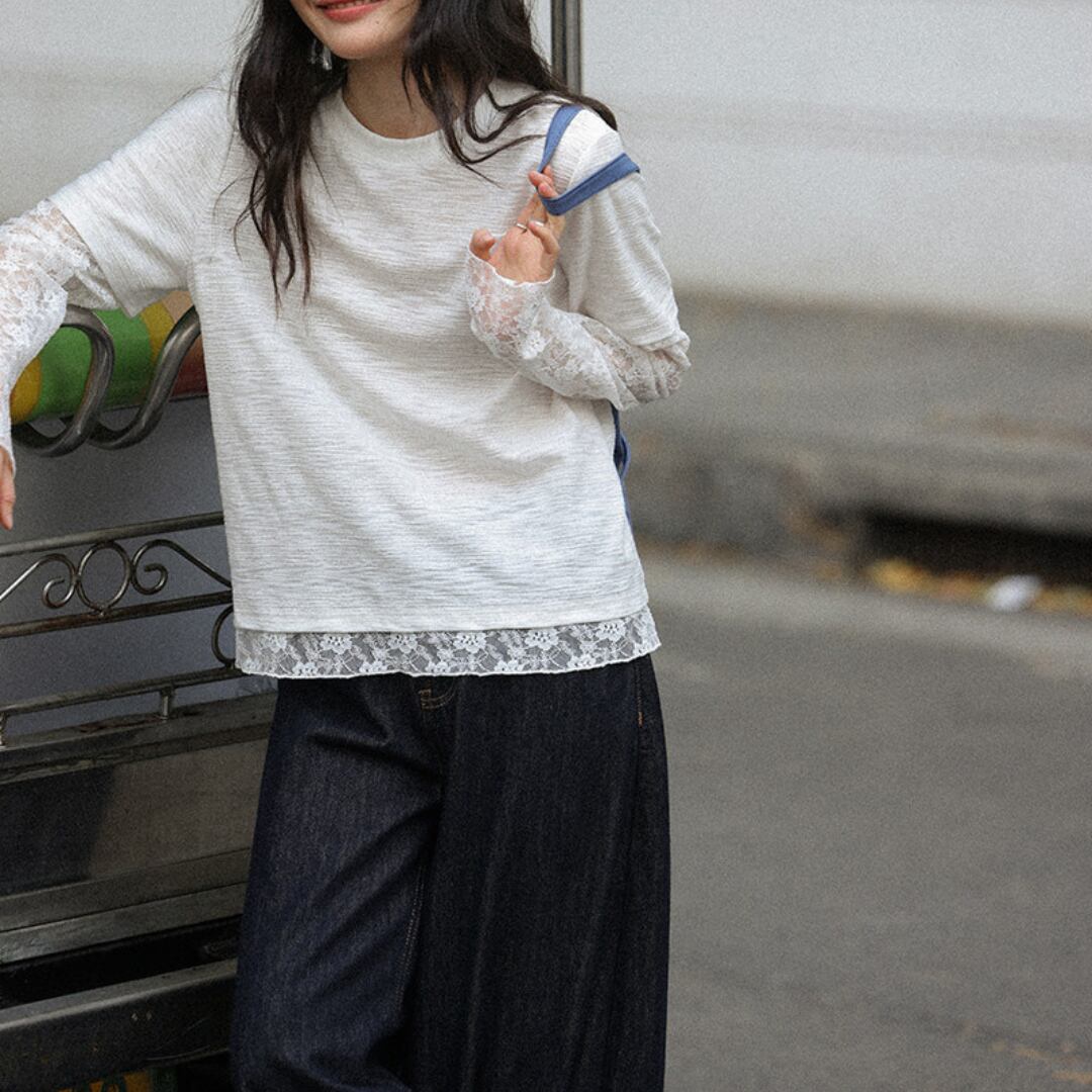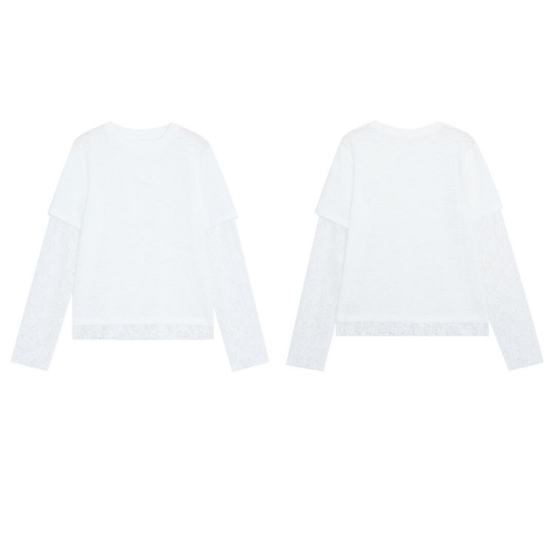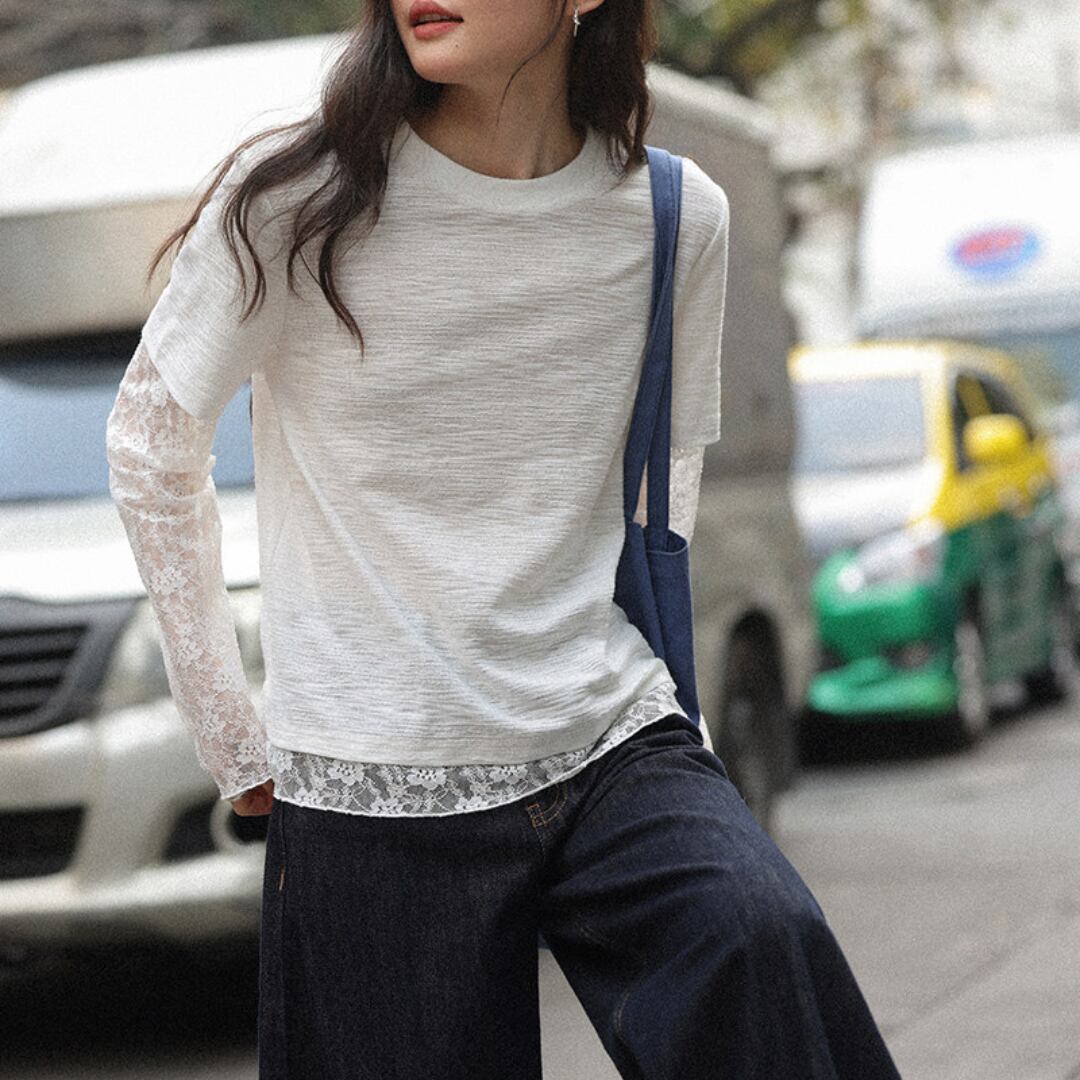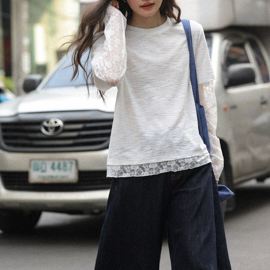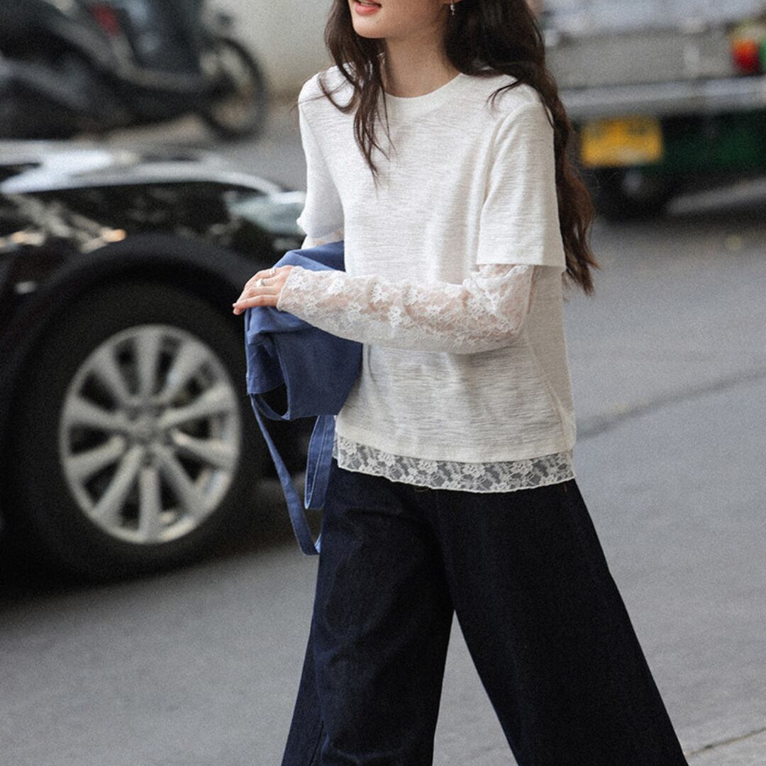 透け感のあるレーススリーブと裾のレイヤードデザインが特徴で、シンプルながらも女性らしい柔らかさを引き立てるトップス。