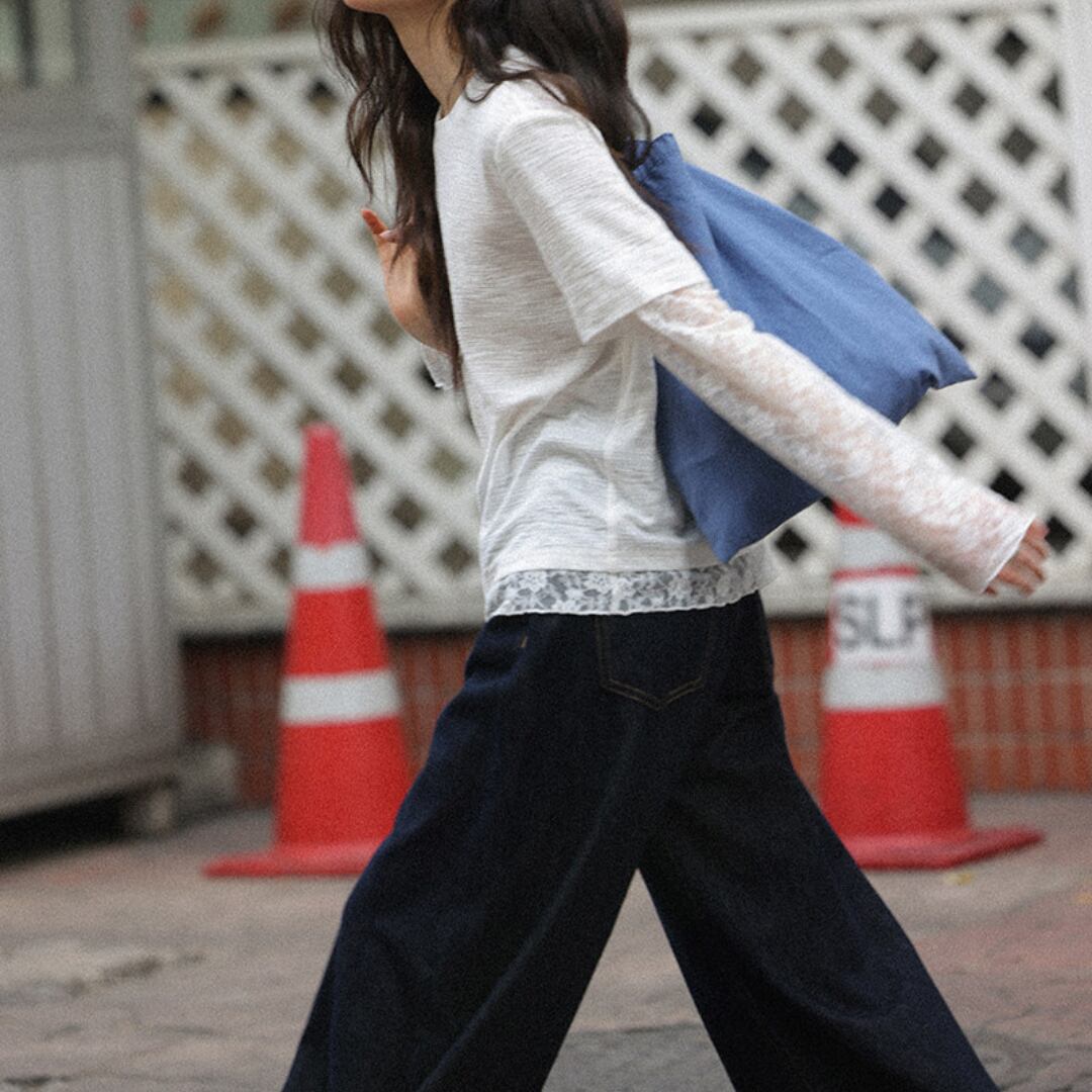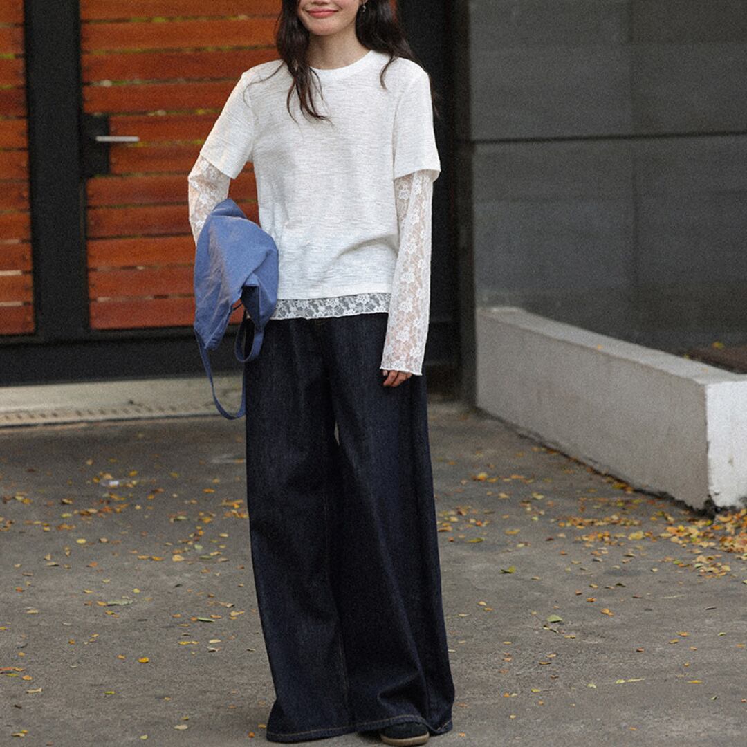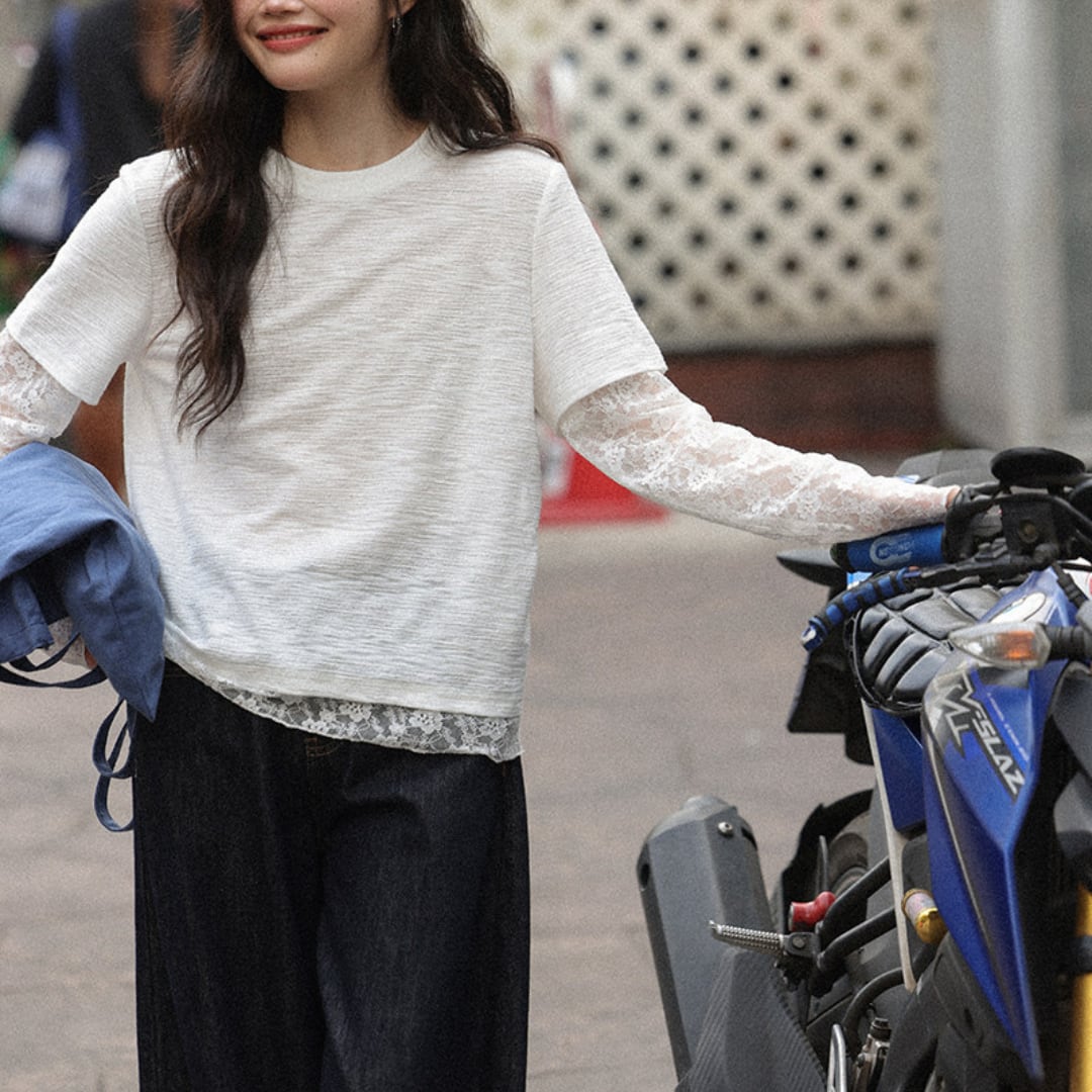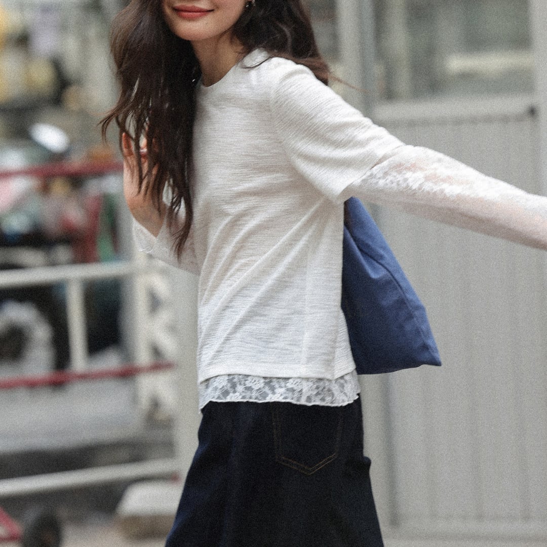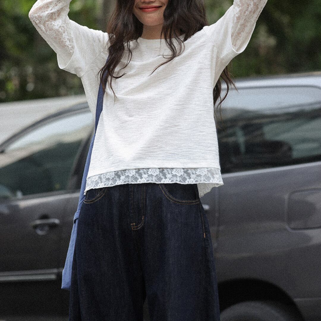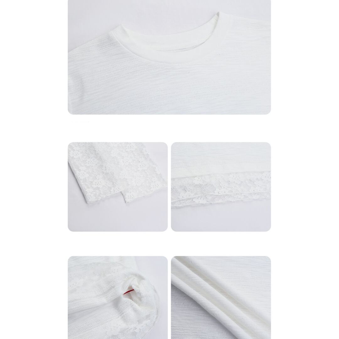 透け感のあるレーススリーブと裾のレイヤードデザインが特徴で、シンプルながらも女性らしい柔らかさを引き立てるトップス。