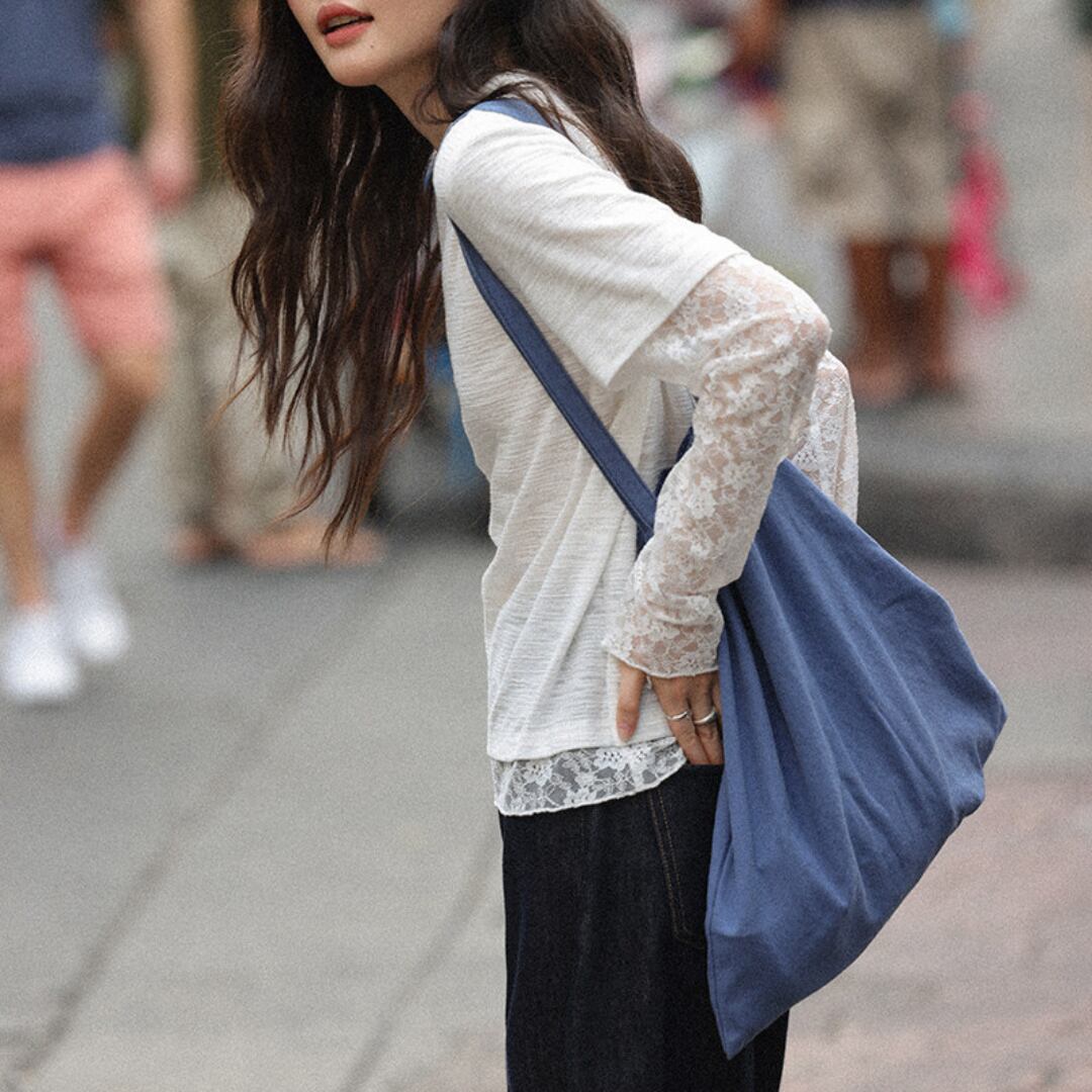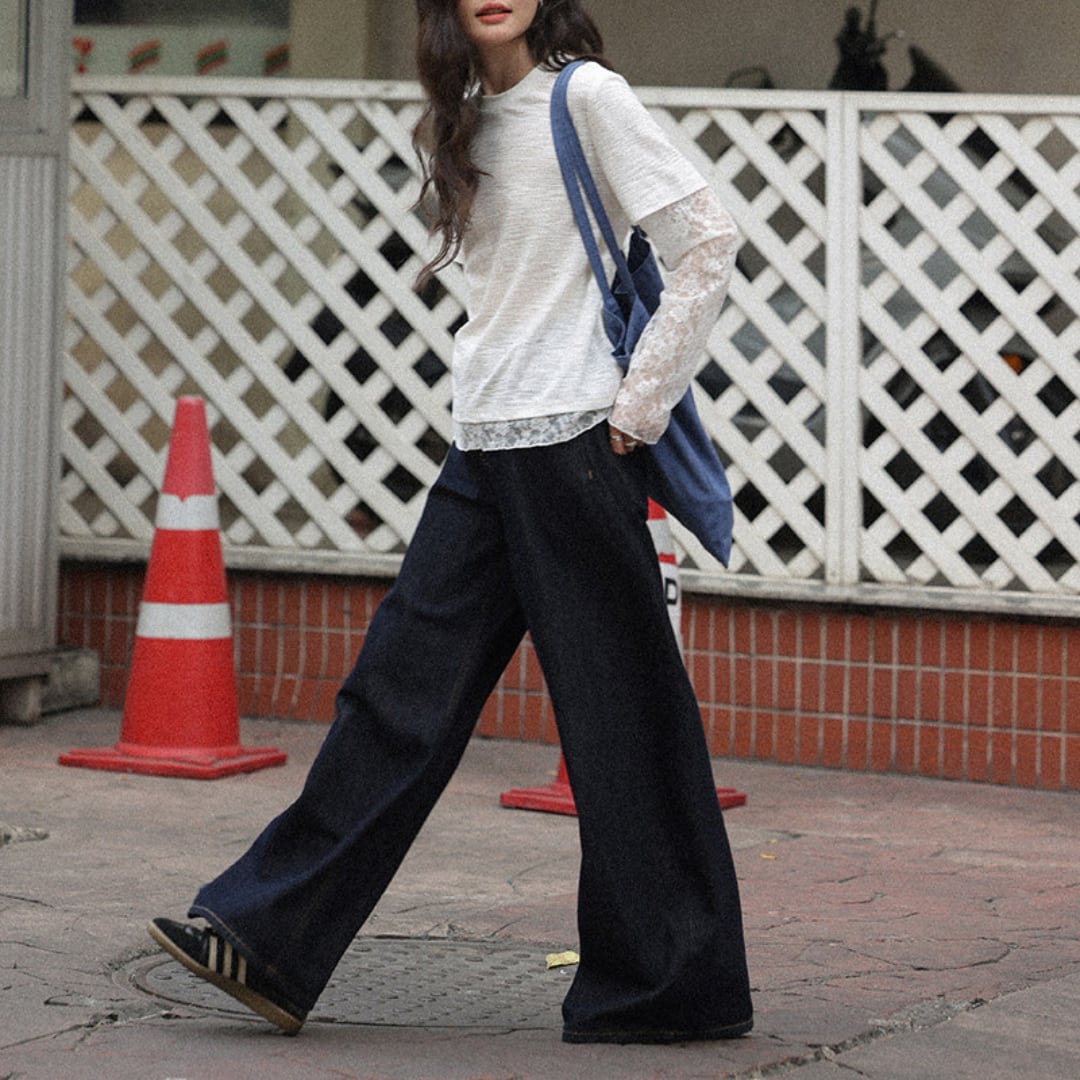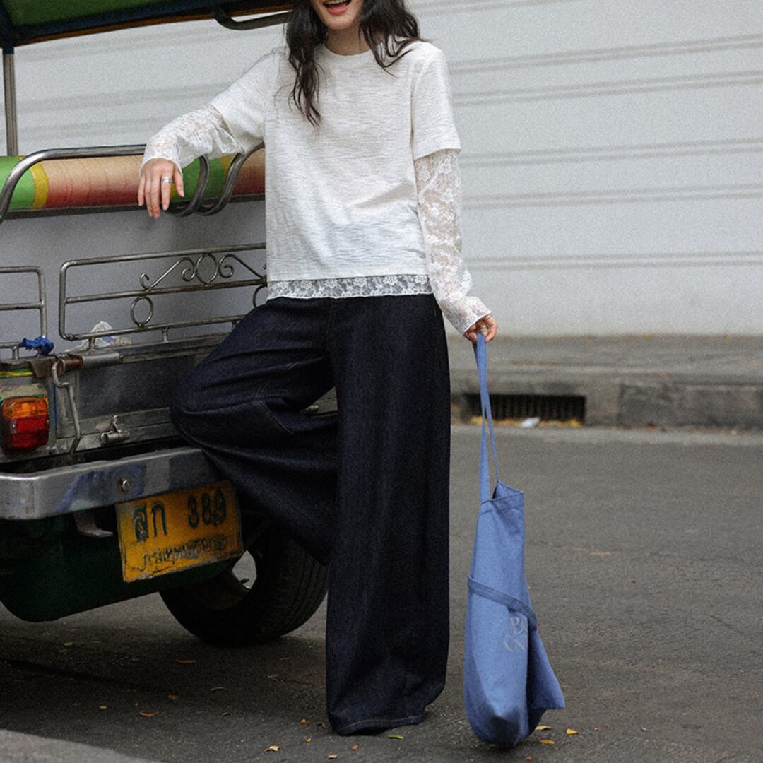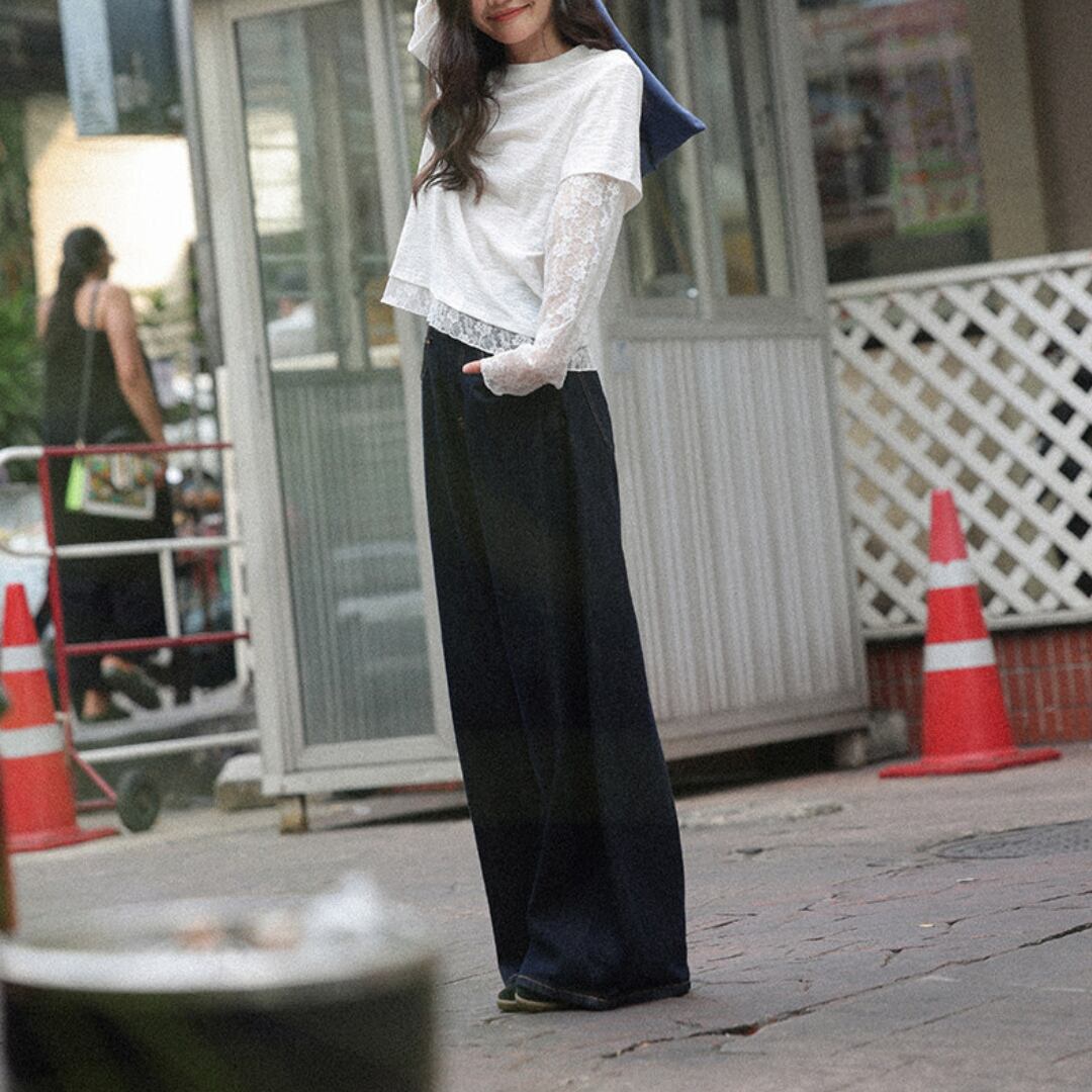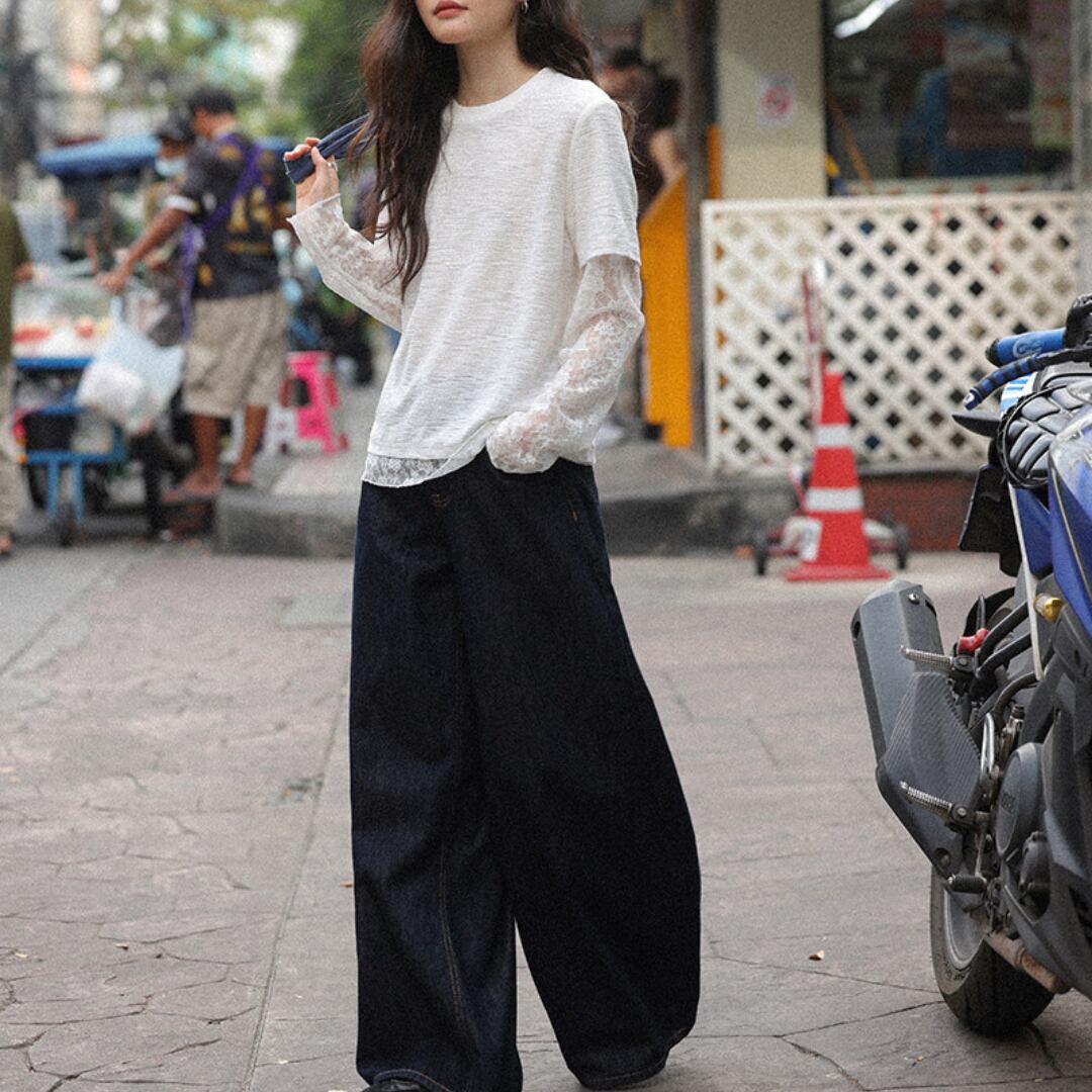 透け感のあるレーススリーブと裾のレイヤードデザインが特徴で、シンプルながらも女性らしい柔らかさを引き立てるトップス。