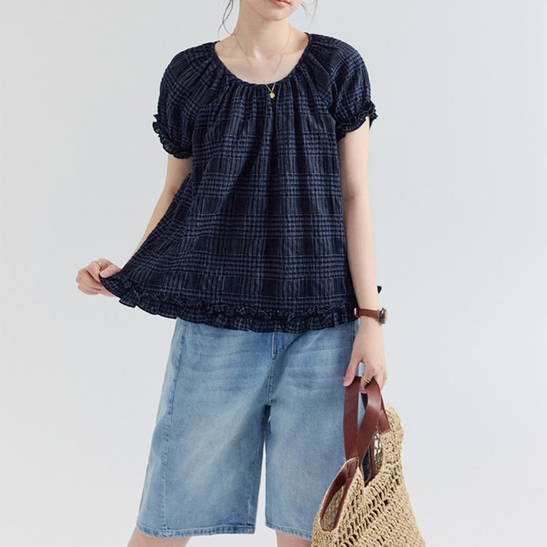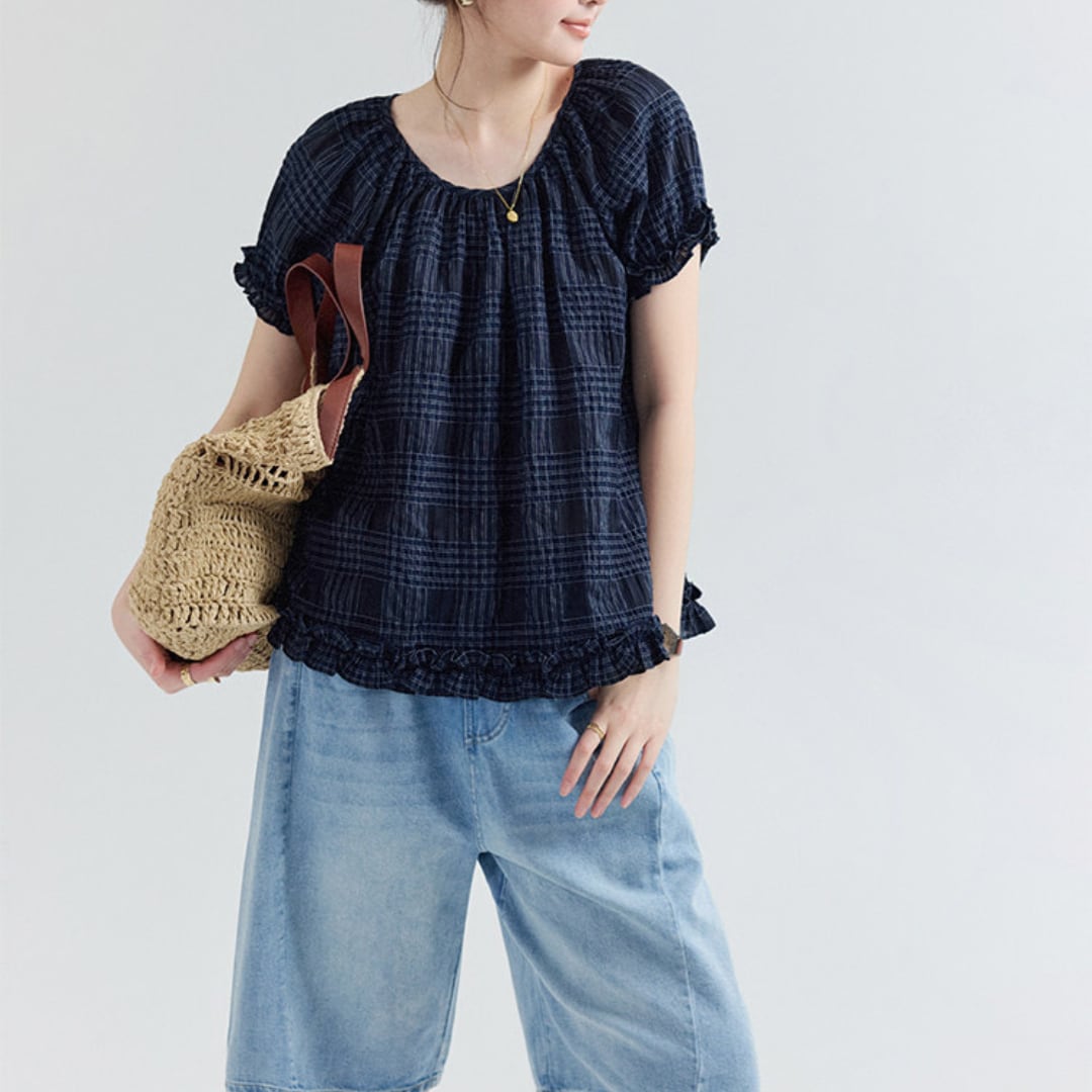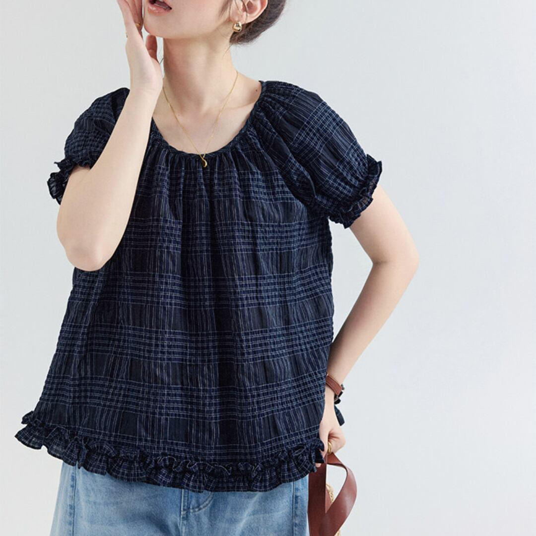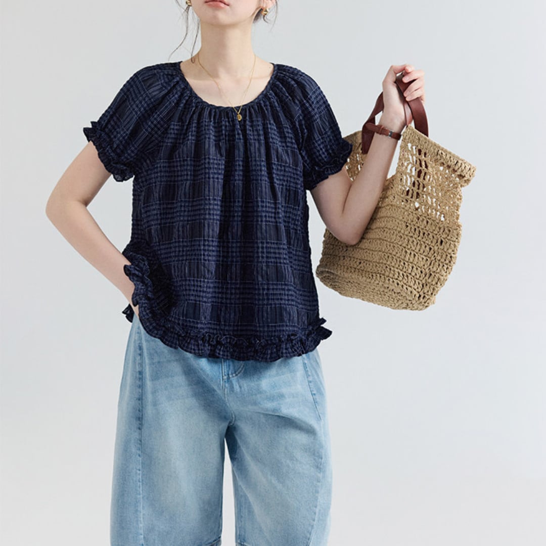 細やかなチェック柄と首元や裾にあしらわれたフリルデザインがやわらかな印象を引き立てる、軽やかなシルエットの半袖ブラウスです。