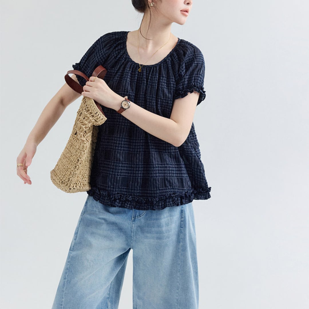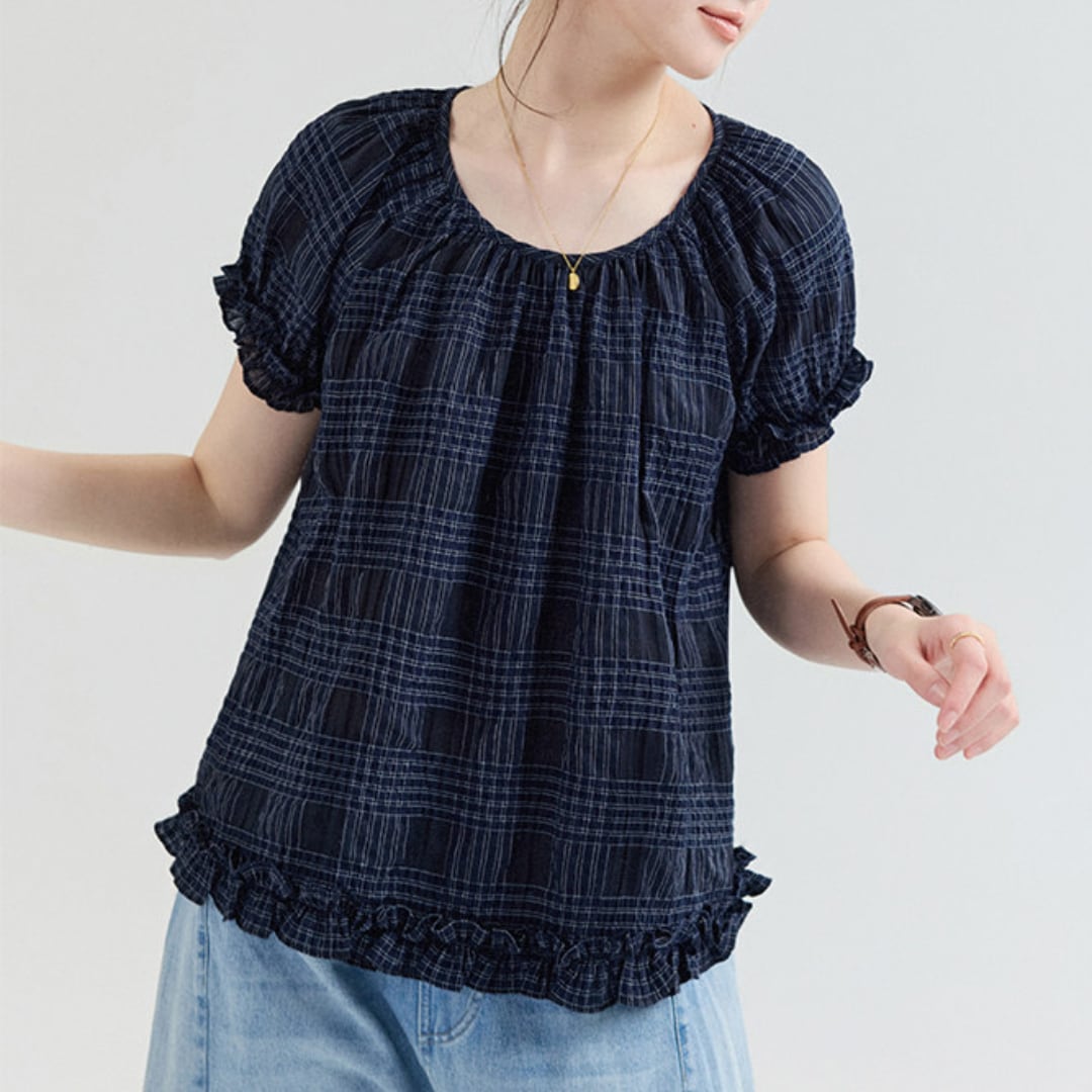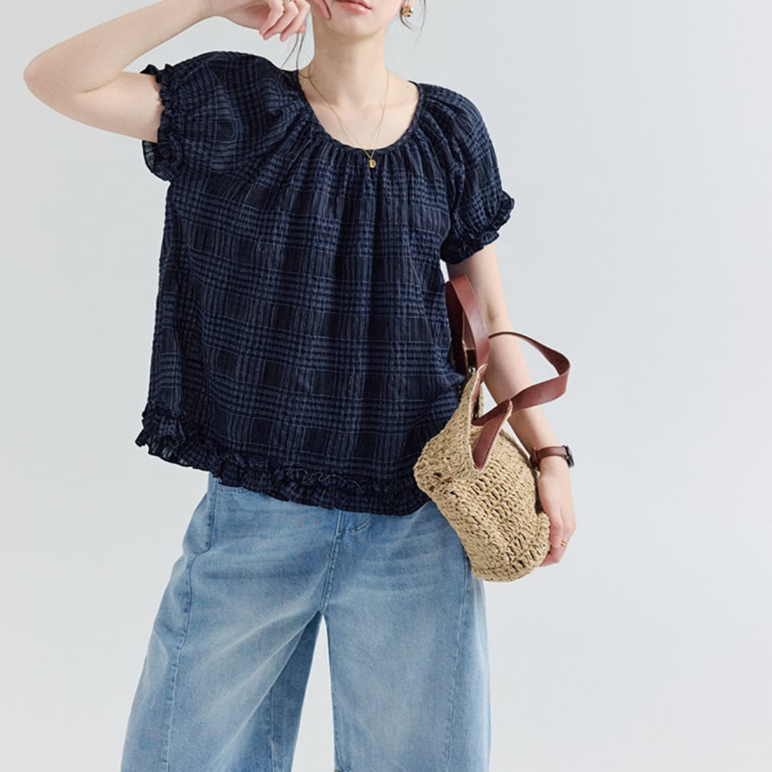 細やかなチェック柄と首元や裾にあしらわれたフリルデザインがやわらかな印象を引き立てる、軽やかなシルエットの半袖ブラウスです。