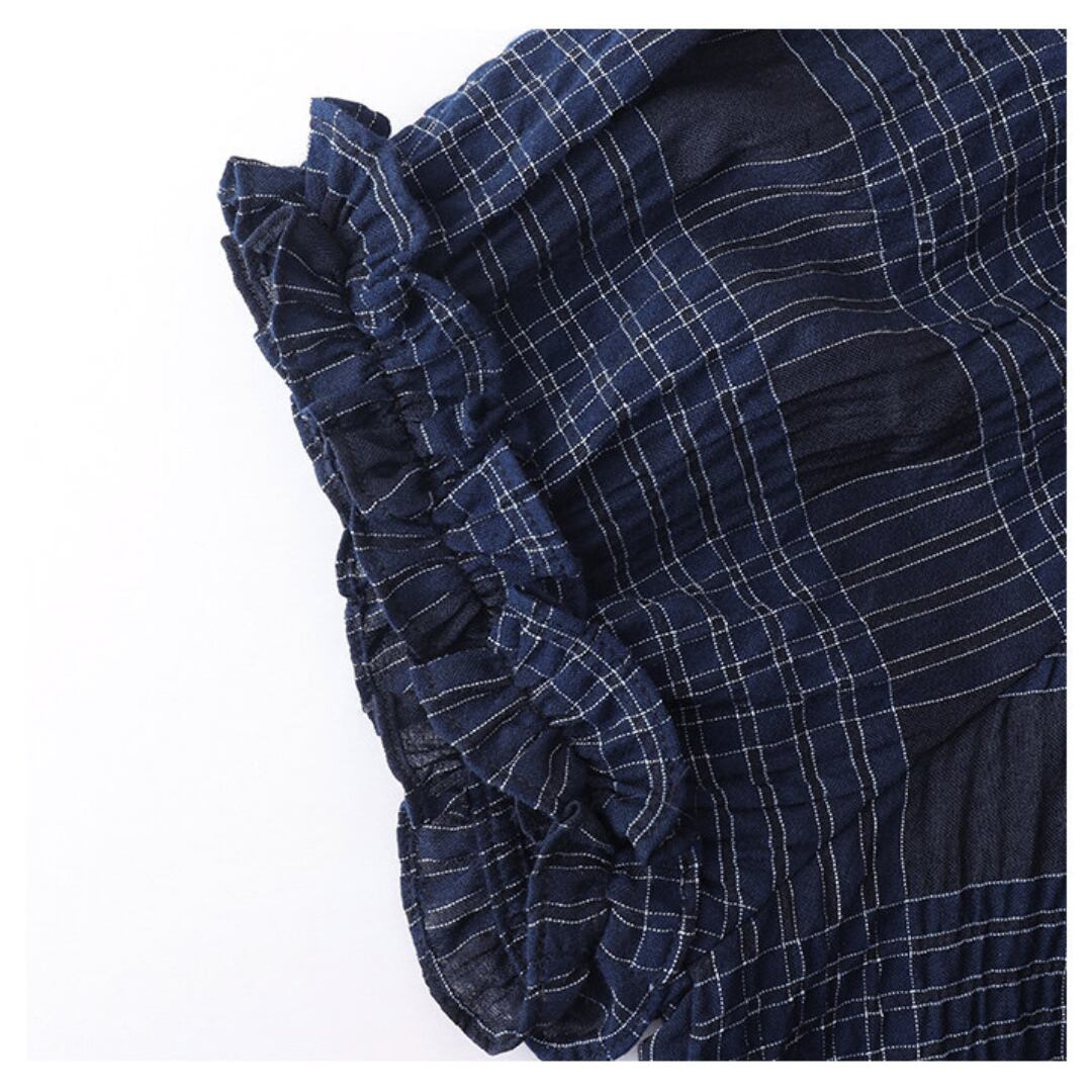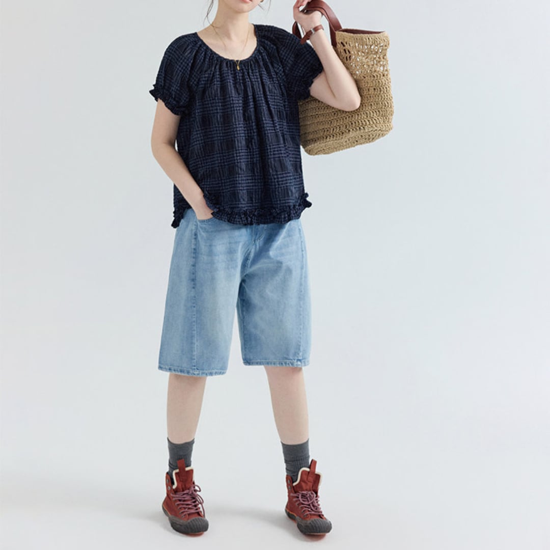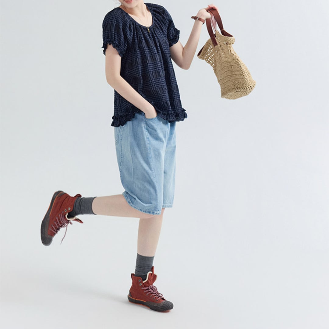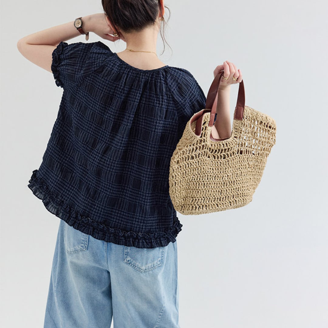 細やかなチェック柄と首元や裾にあしらわれたフリルデザインがやわらかな印象を引き立てる、軽やかなシルエットの半袖ブラウスです。