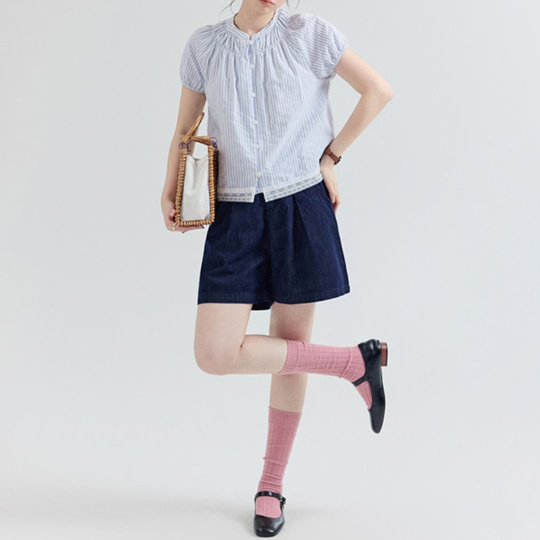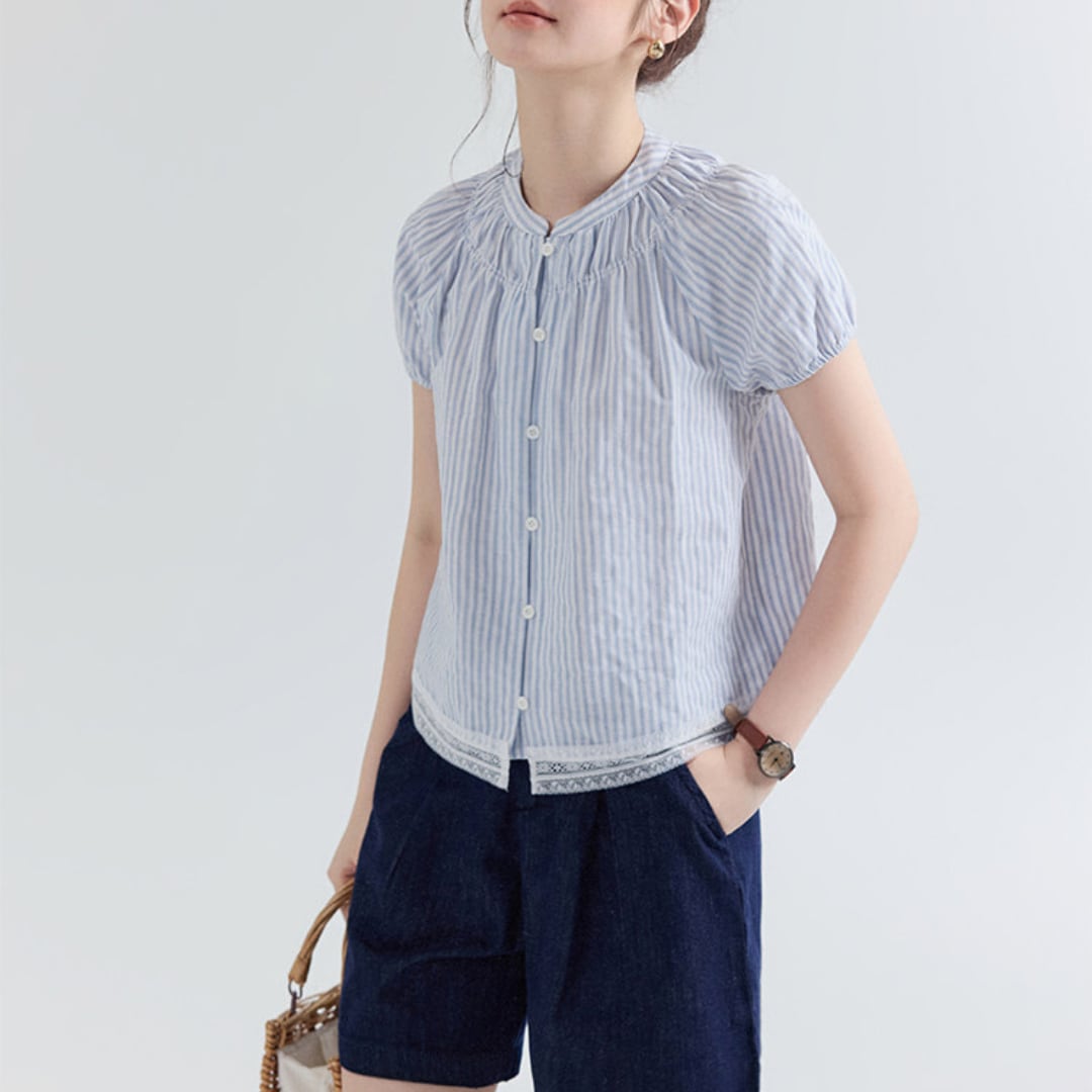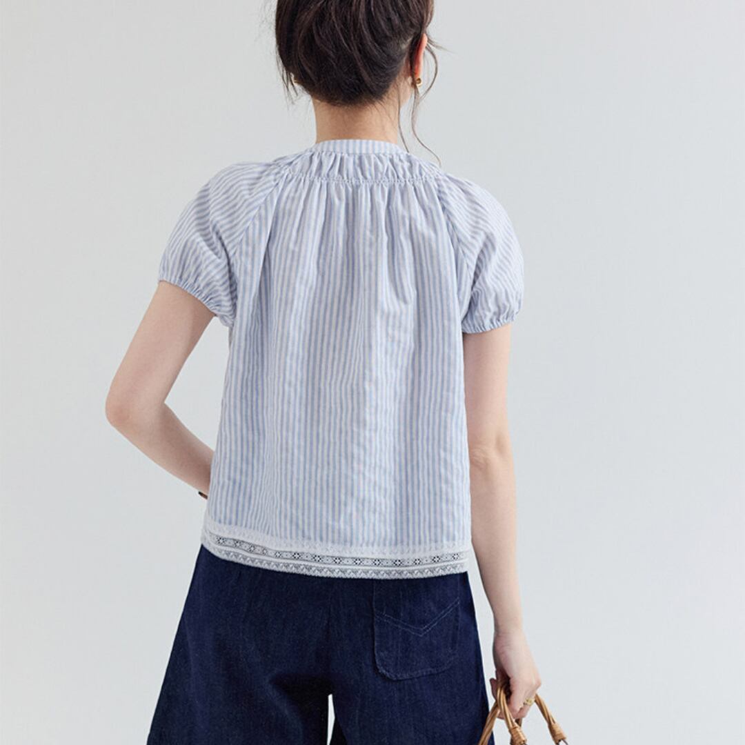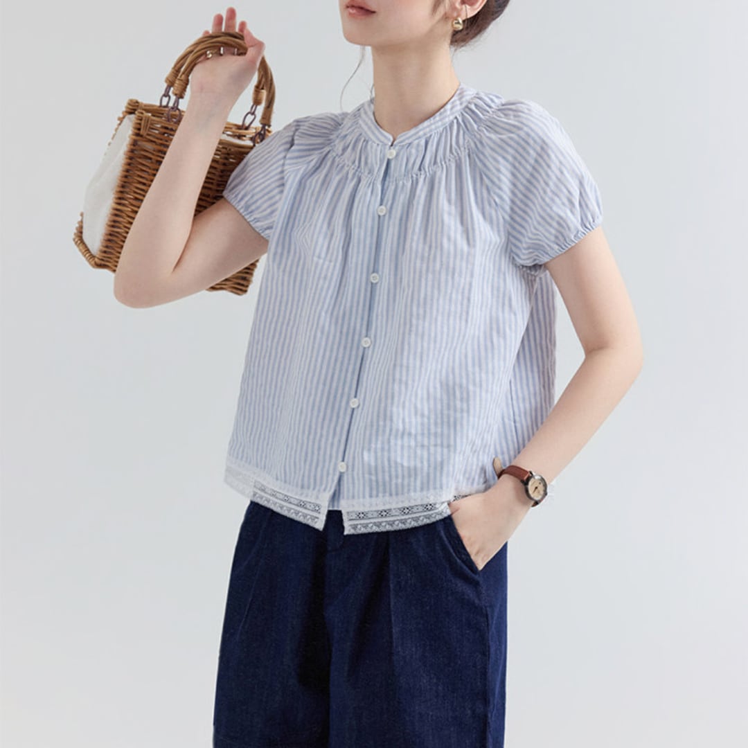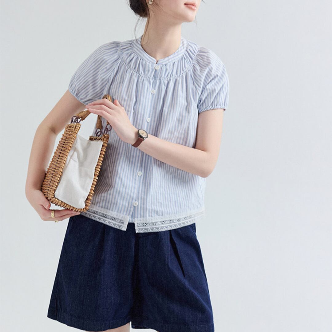 繊細なストライプ柄と首元にたっぷり寄せたギャザーがやわらかな立体感を生み出す、軽やかで上品な印象の半袖ブラウスです。