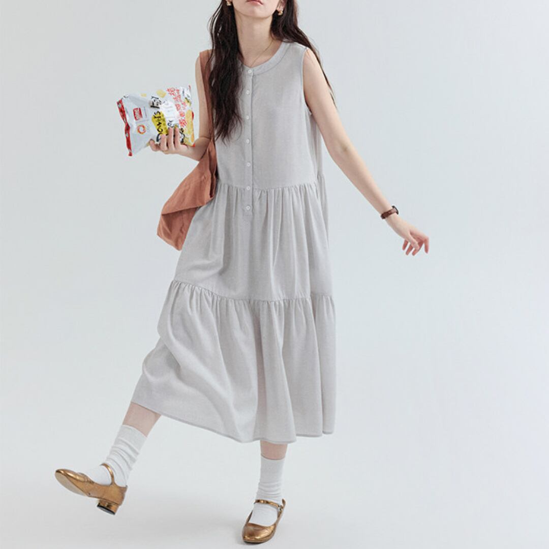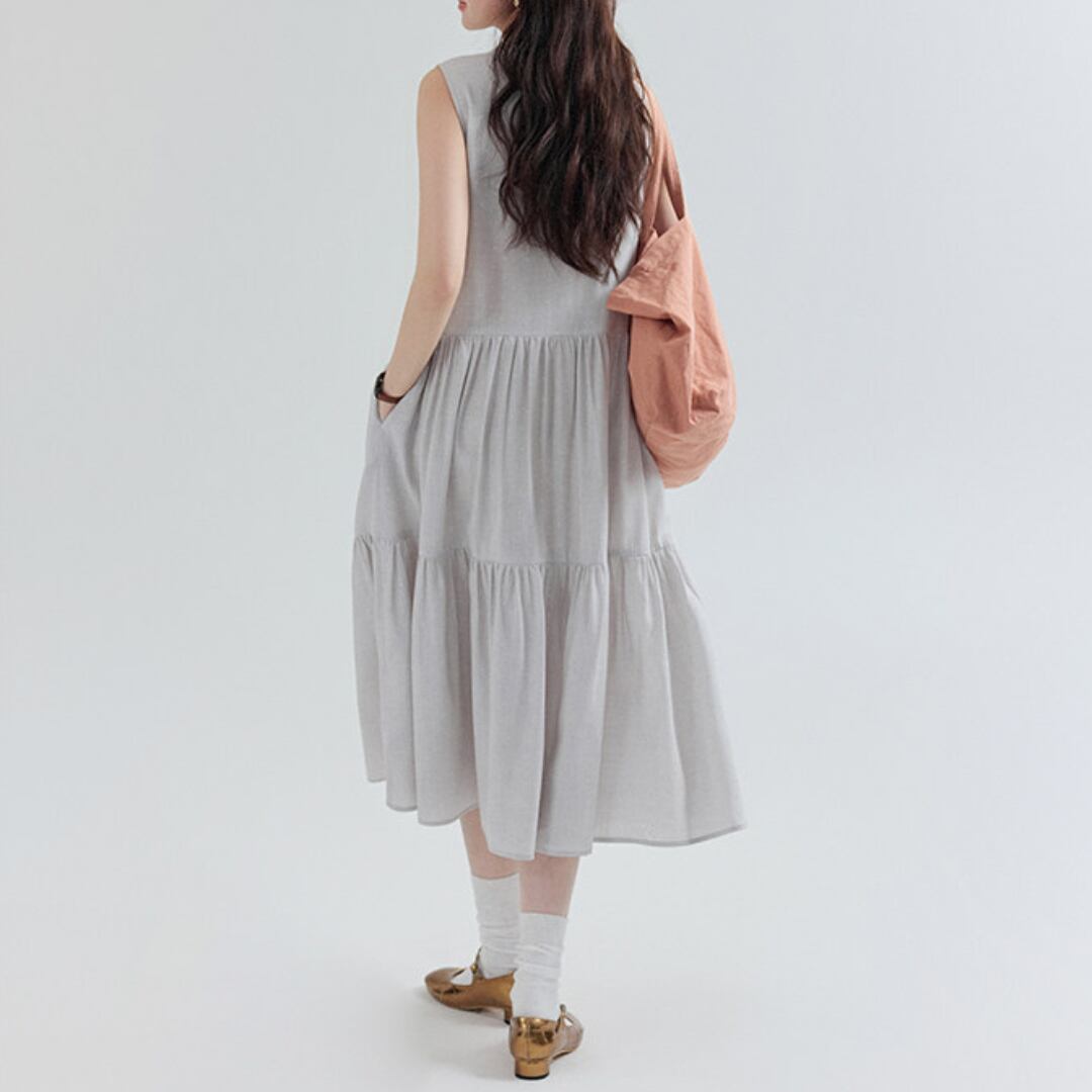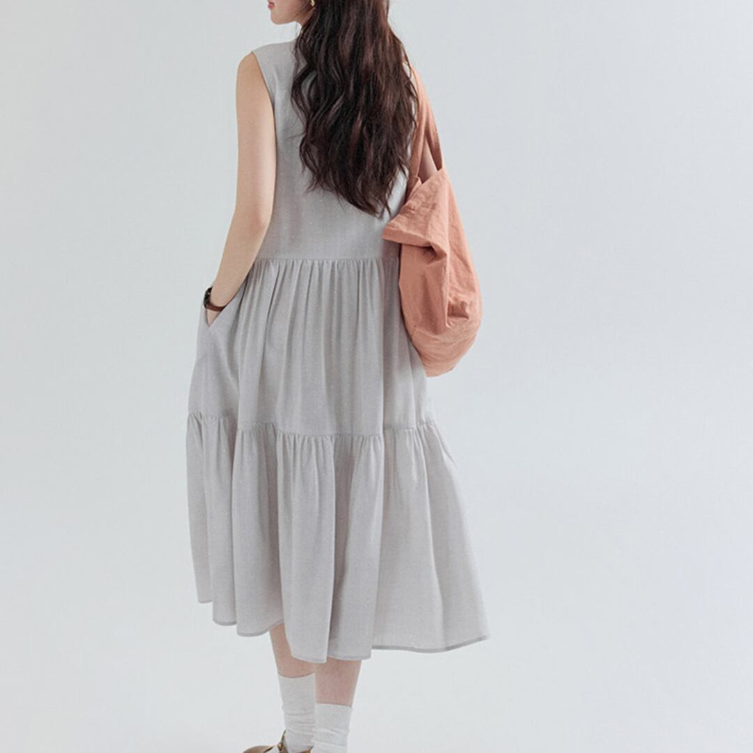 やわらかな生地感とふんわり広がるティアードデザインが軽やかな動きを生み出す、ナチュラルで上品な印象のノースリーブワンピースです。