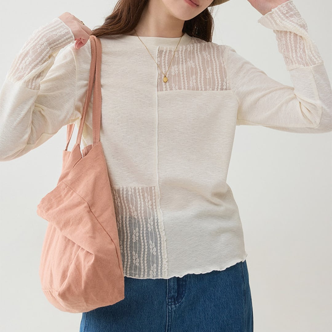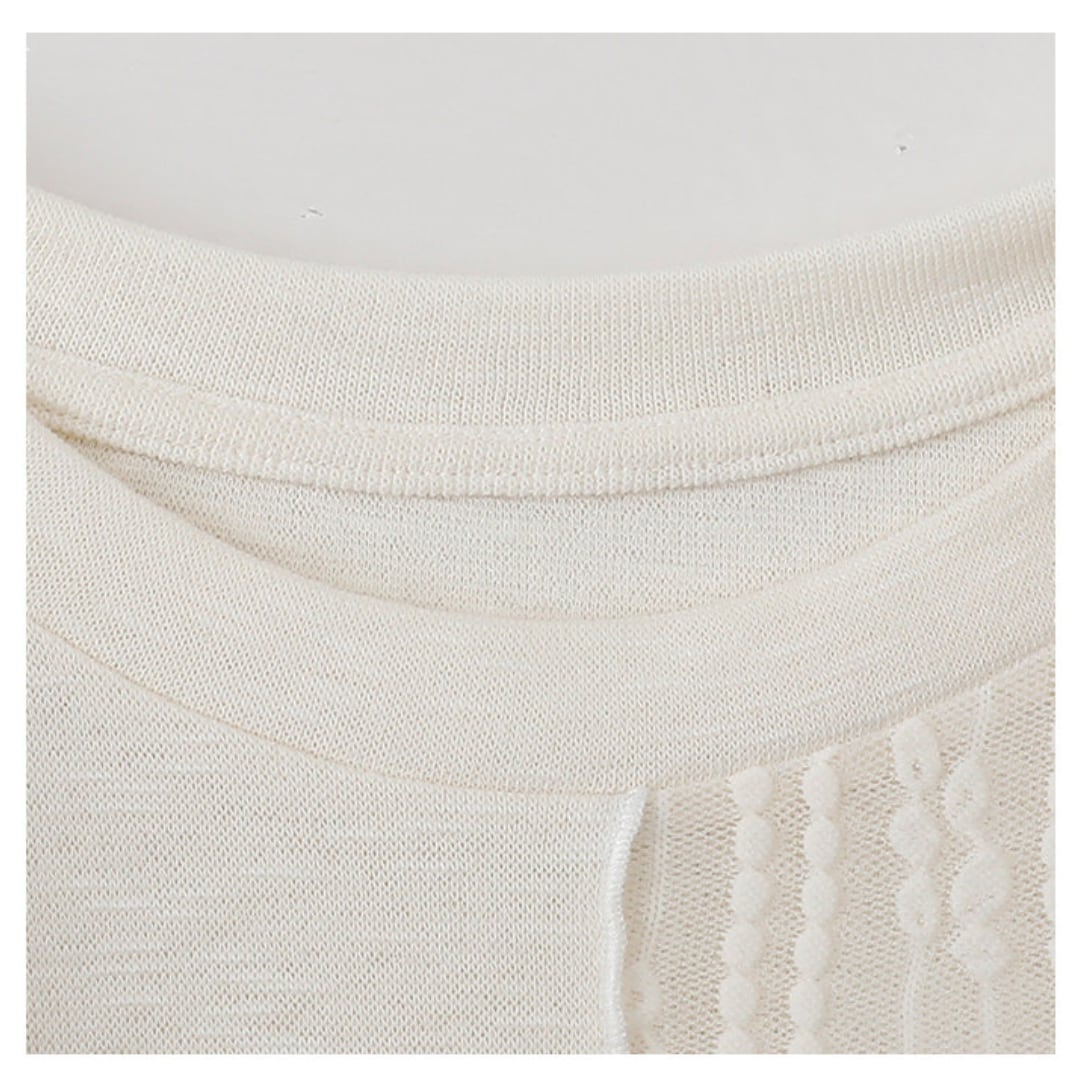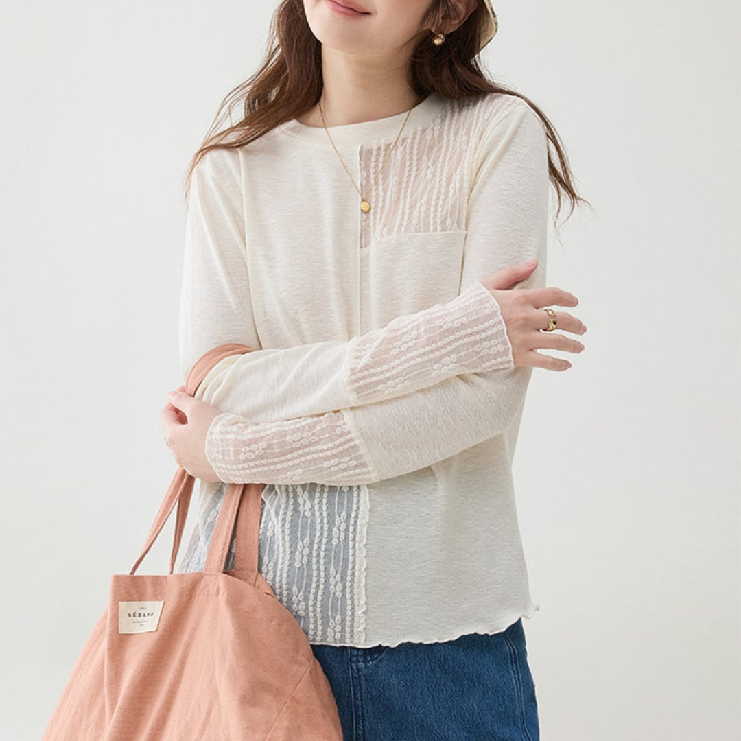 繊細なレース切替デザインが印象的な、やわらかく軽やかな着心地のシアーニットトップスで、異素材の組み合わせが自然な立体感と上品で女性らしい雰囲気を引き立ててくれる一着です。