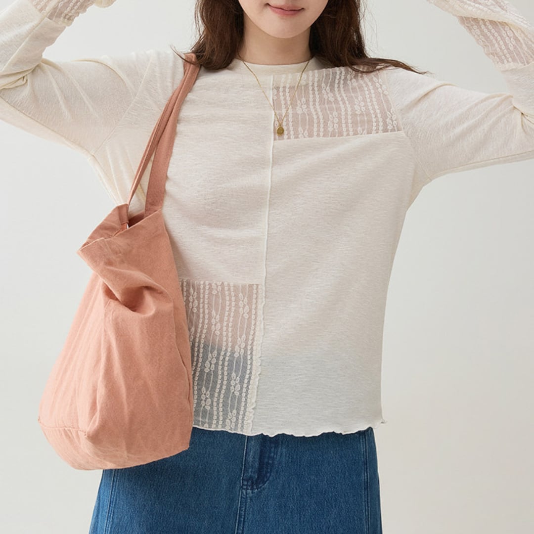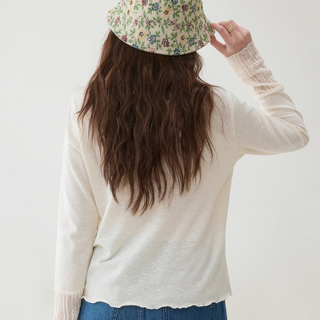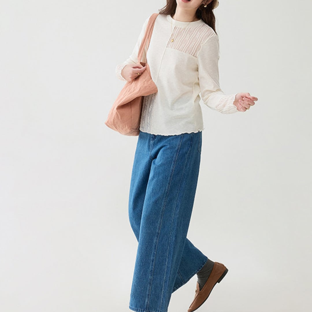 繊細なレース切替デザインが印象的な、やわらかく軽やかな着心地のシアーニットトップスで、異素材の組み合わせが自然な立体感と上品で女性らしい雰囲気を引き立ててくれる一着です。