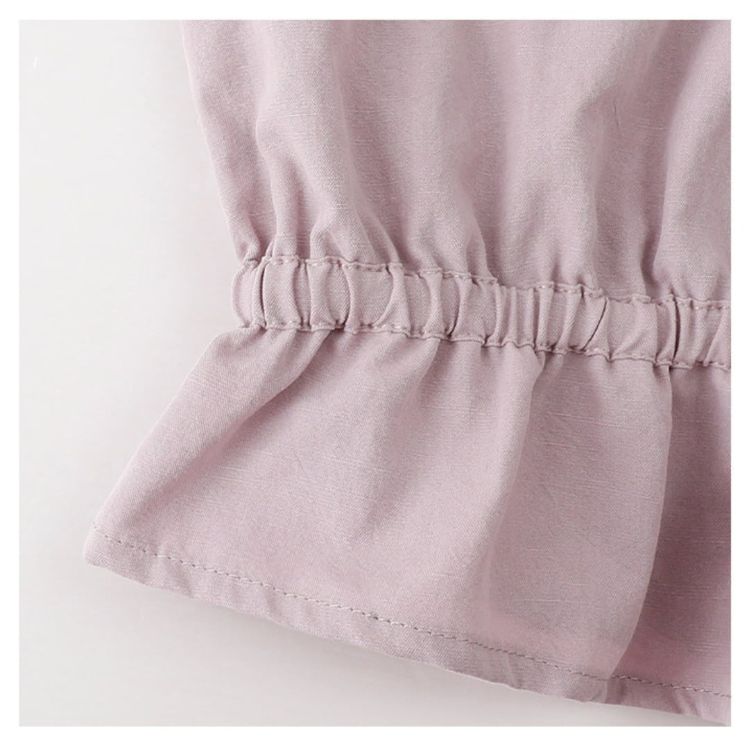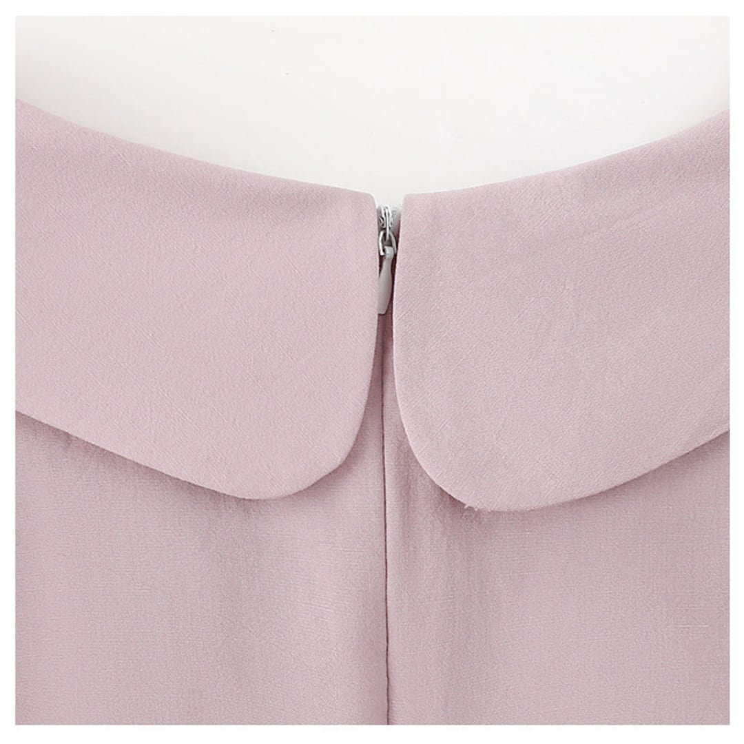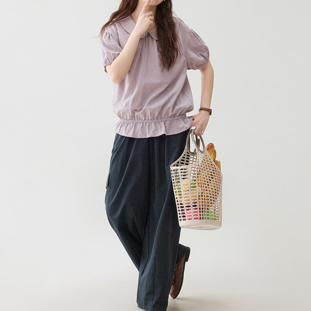 丸みのあるラウンドカラーとふんわりとしたパフスリーブがやさしい印象を与えるブラウスで、ウエストのギャザーデザインが自然な立体感と女性らしいシルエットを引き立ててくれる一着です。