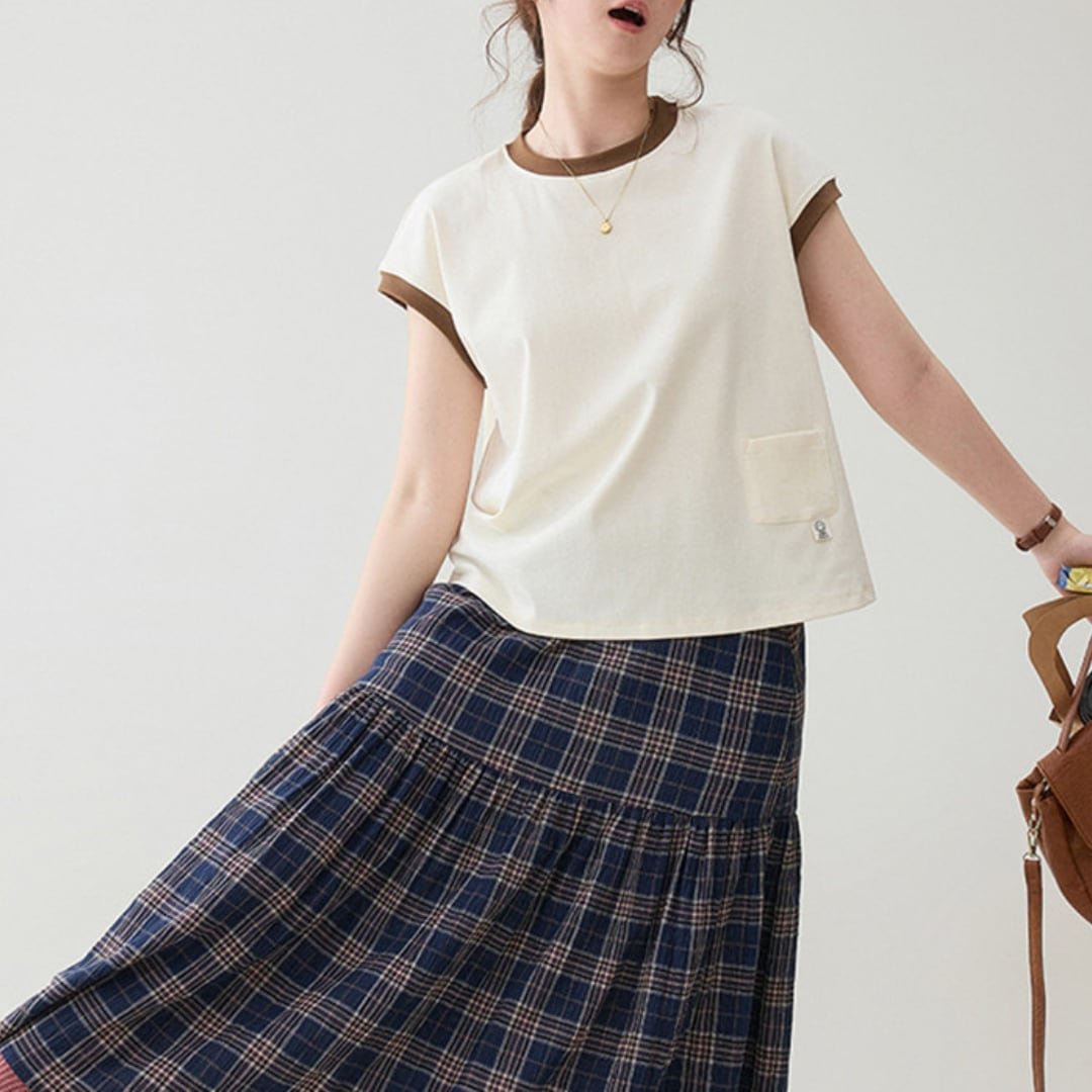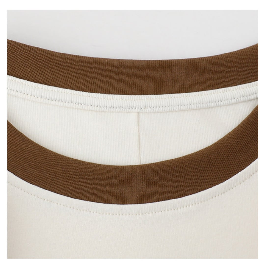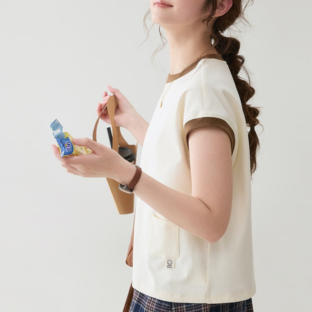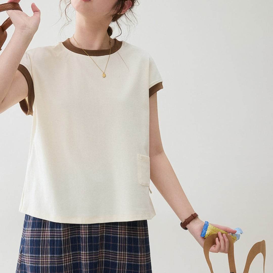 首元と袖口の配色リブがさりげないアクセントになった、シンプルながらもデザイン性のあるフレンチスリーブトップスで、ゆとりのあるシルエットがリラックス感とこなれた雰囲気を演出してくれる一着です。
