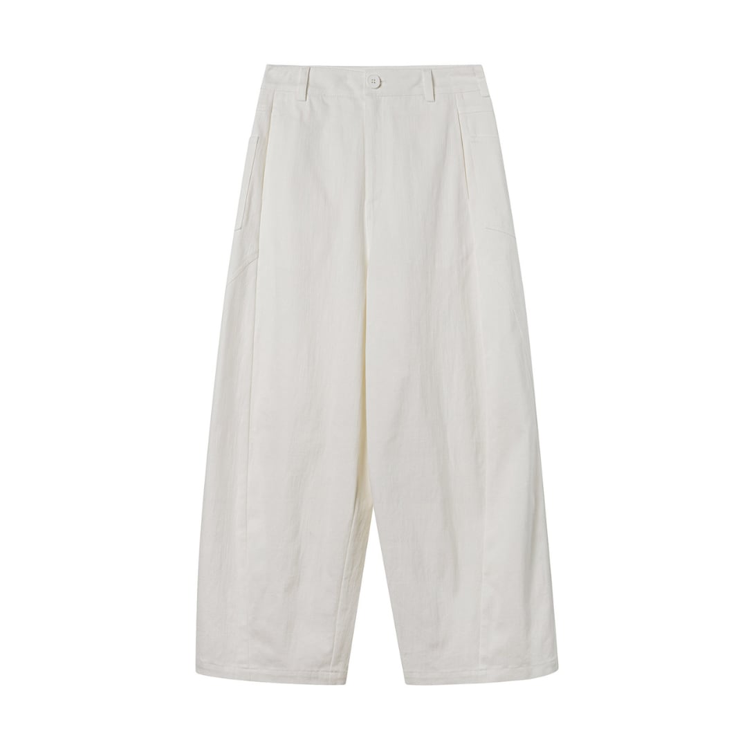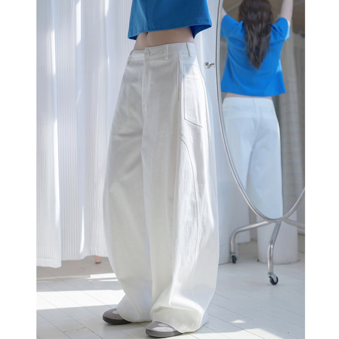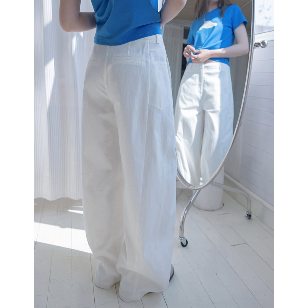 ゆったりとしたワイドシルエットが特徴のストレートパンツで、シンプルなデザインと程よいハリ感のある素材が、リラックス感と上品さを兼ね備えたバランスの良い一着です。