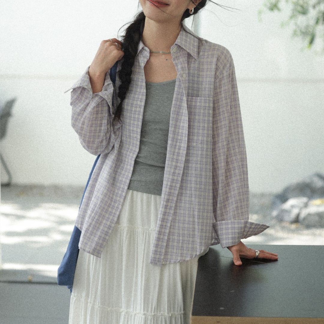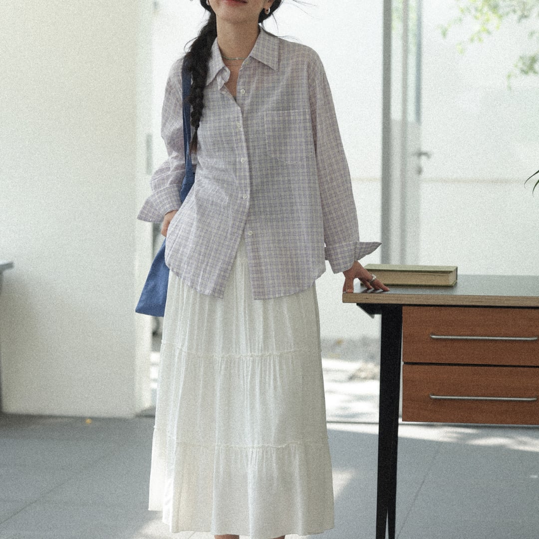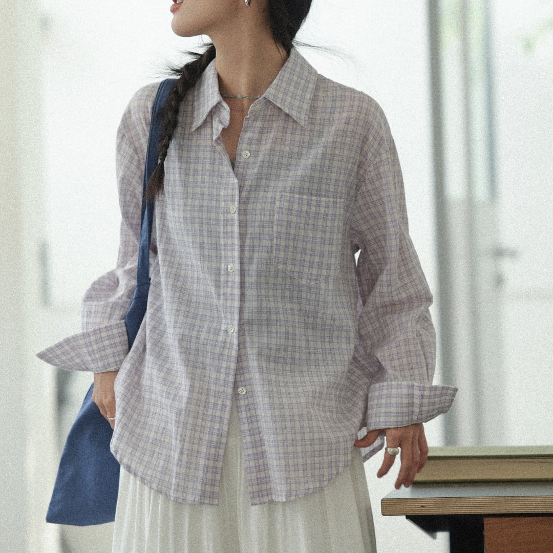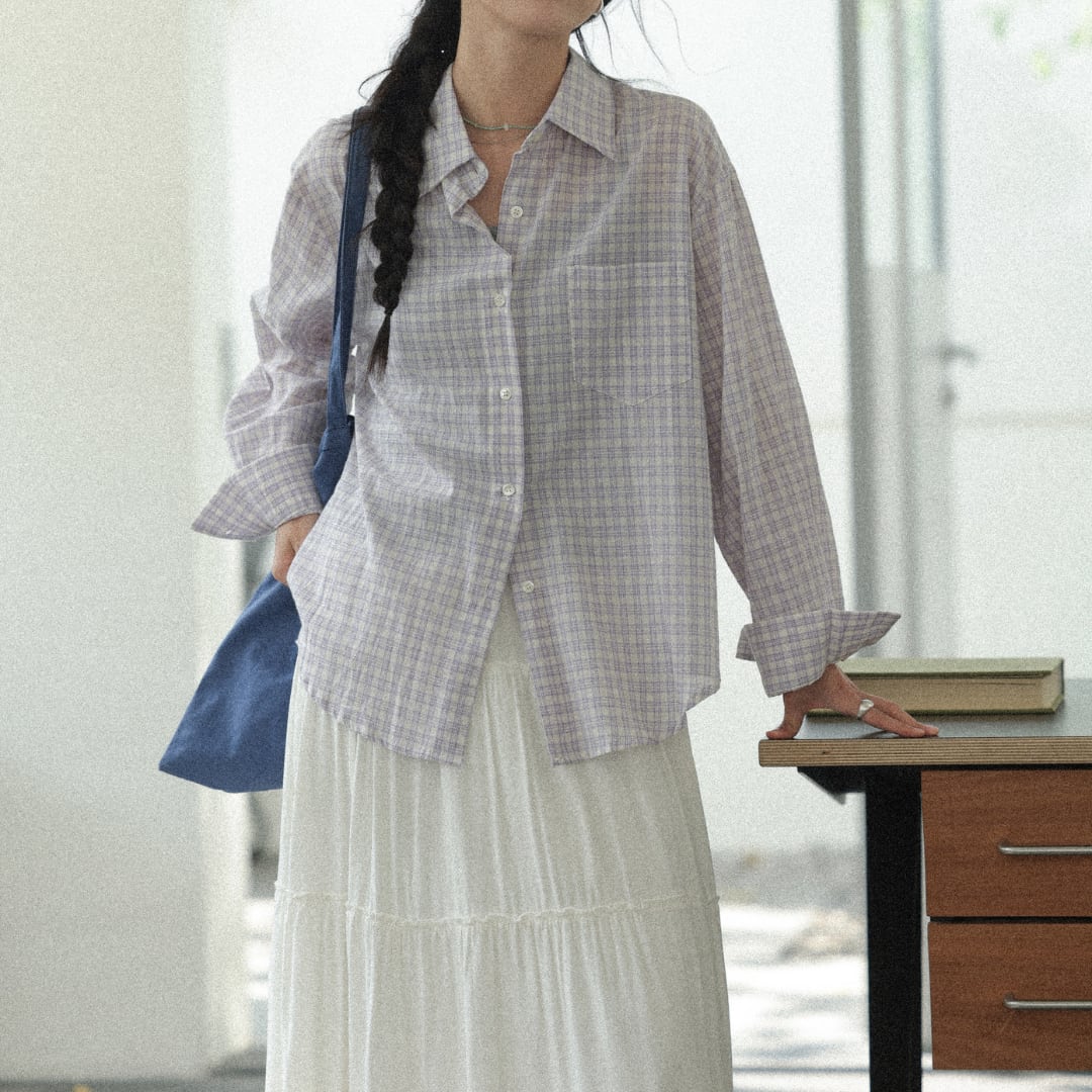 やわらかなコットン素材に細やかなチェック柄をあしらい、軽やかでナチュラルな雰囲気を演出する長袖シャツ。