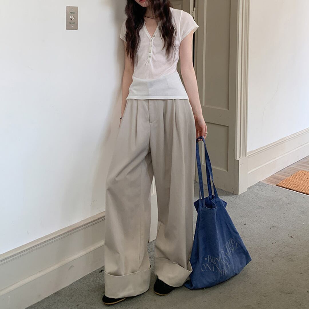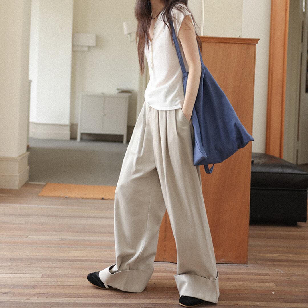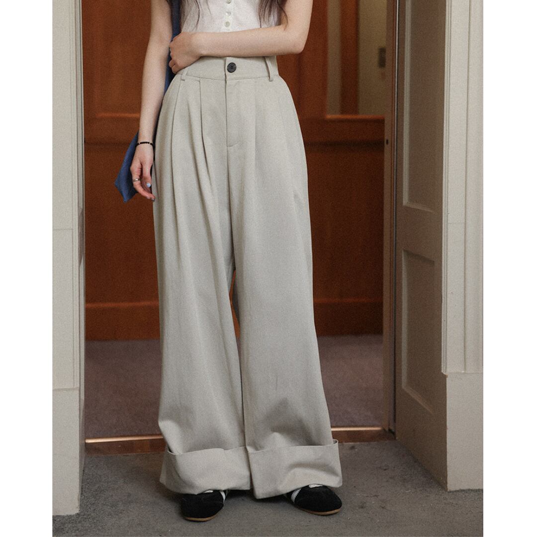 フロントタックが立体感を生み出し、すっきりとした腰まわりからワイドに広がるシルエットが上品な印象を与えるパンツ。