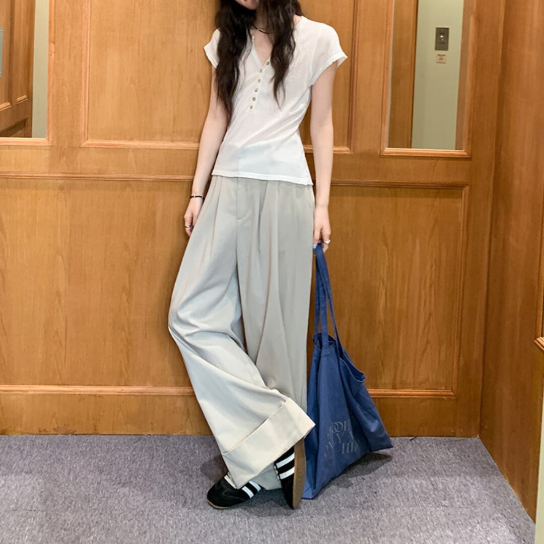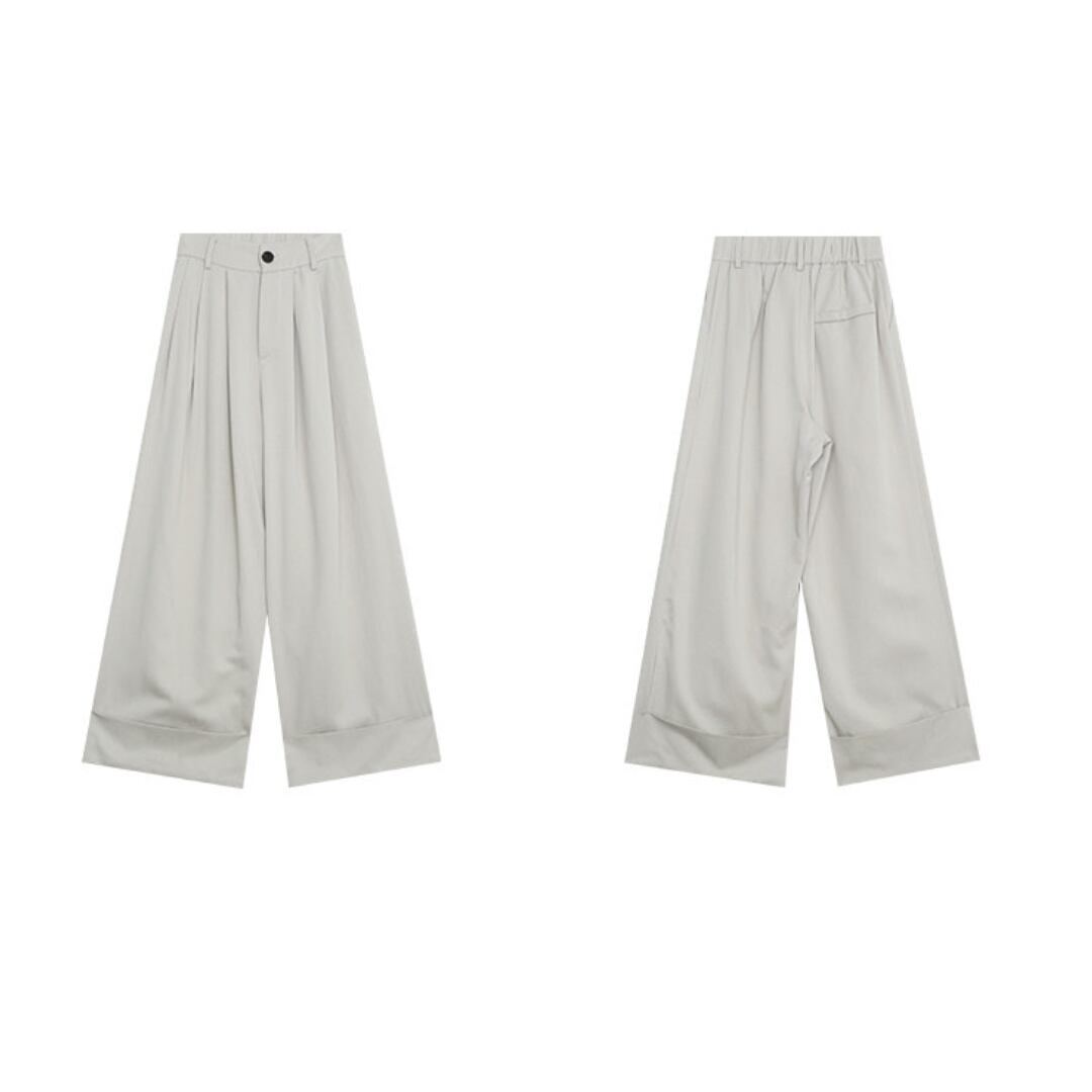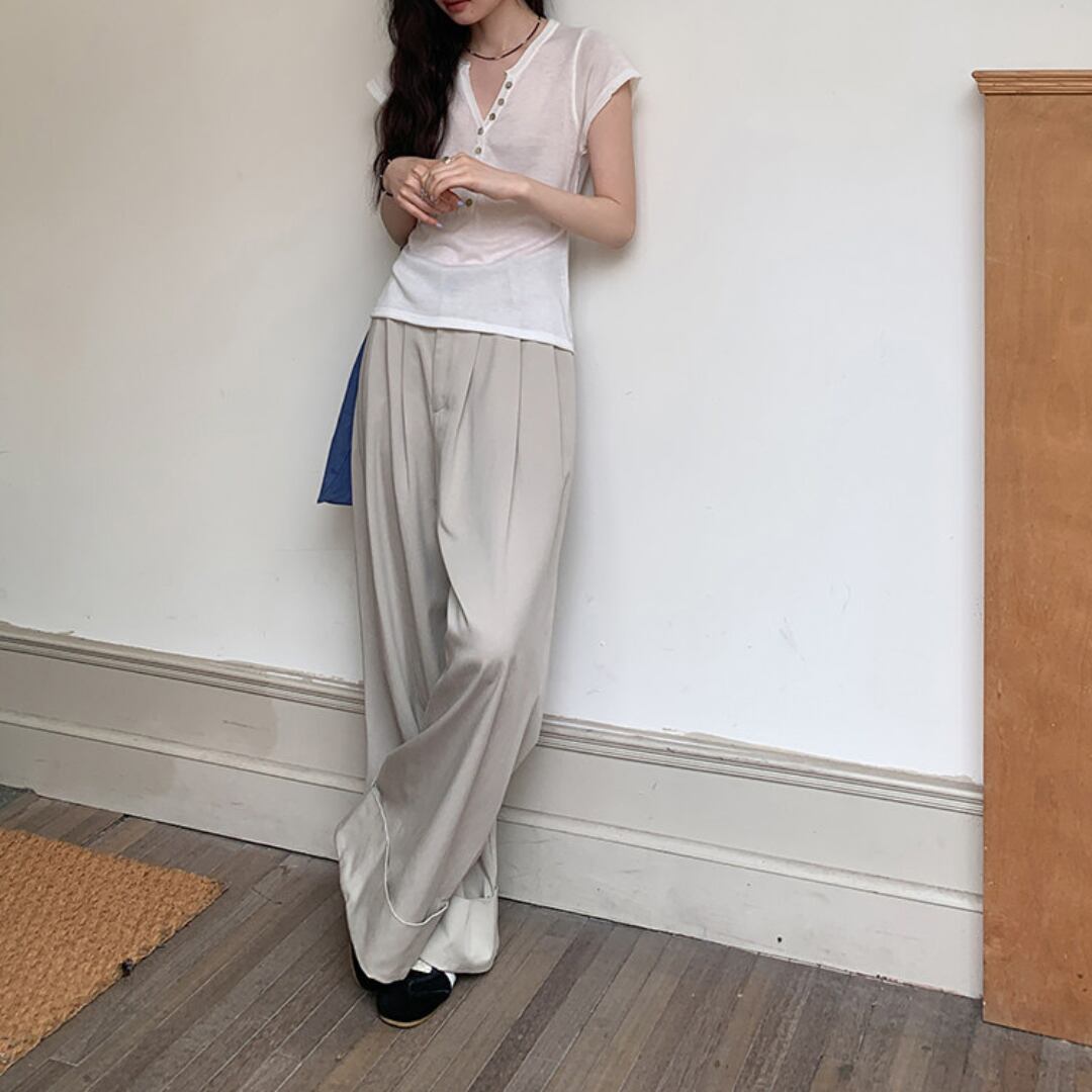 フロントタックが立体感を生み出し、すっきりとした腰まわりからワイドに広がるシルエットが上品な印象を与えるパンツ。