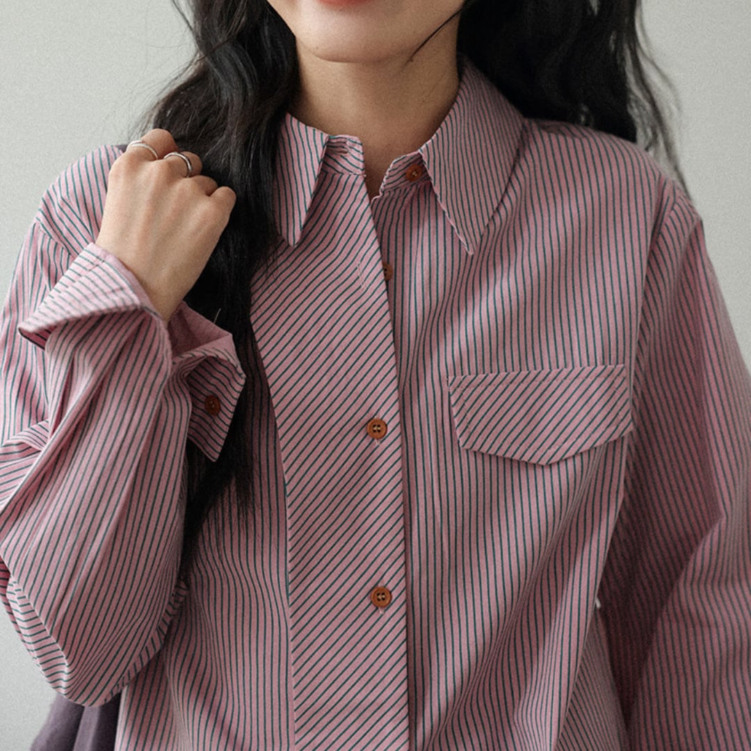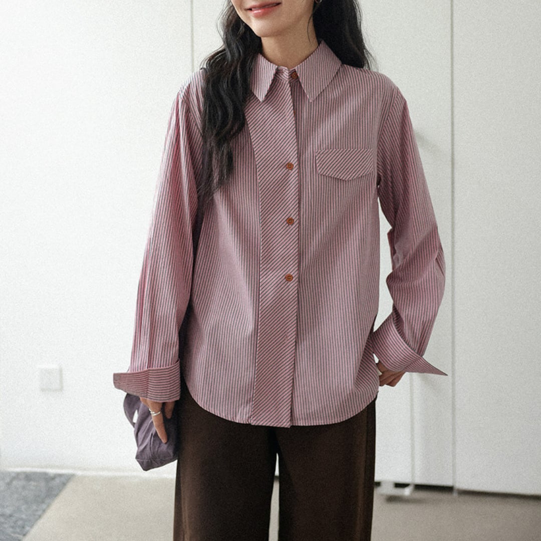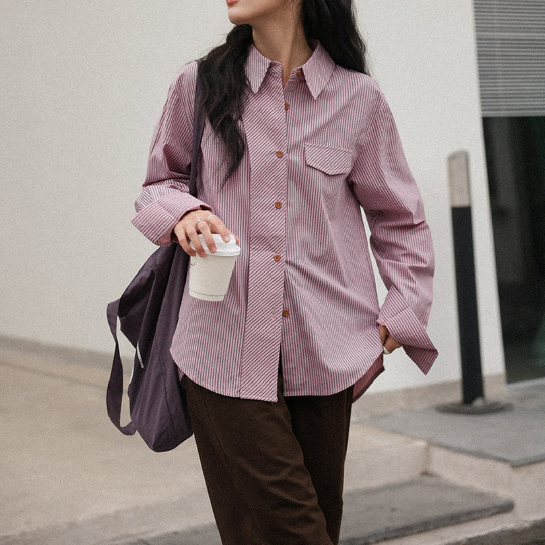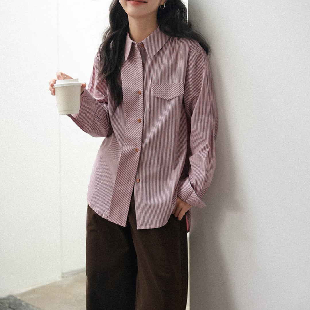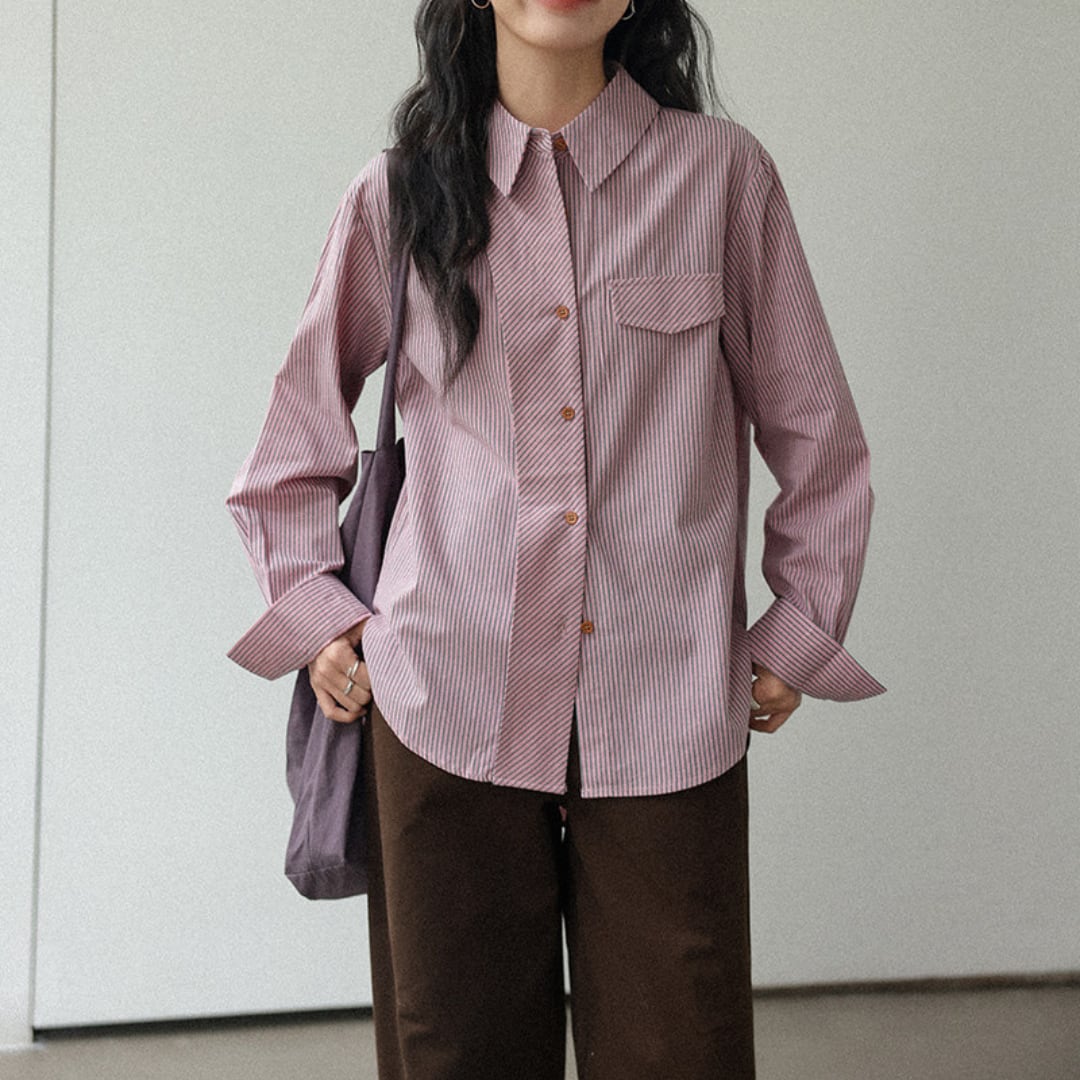 やわらかなコットン素材に細めのストライプ柄を施し、ナチュラルで落ち着いた印象に仕上げた長袖シャツ。