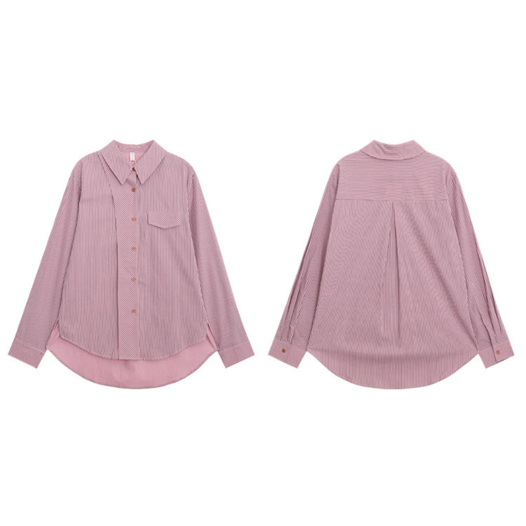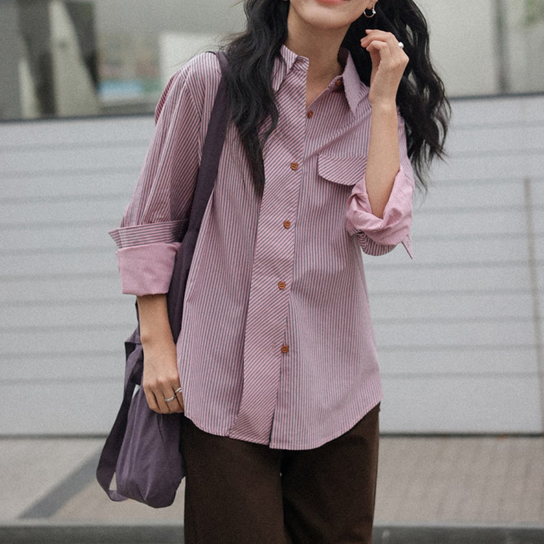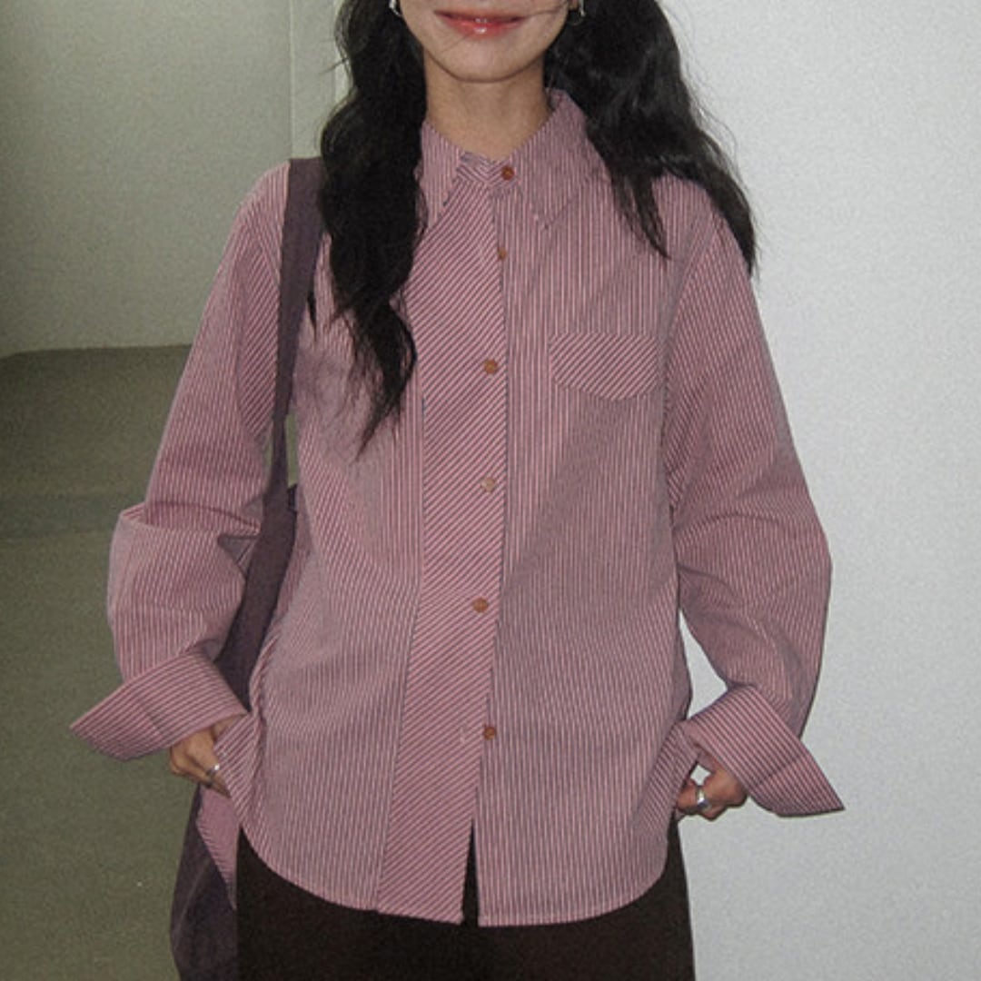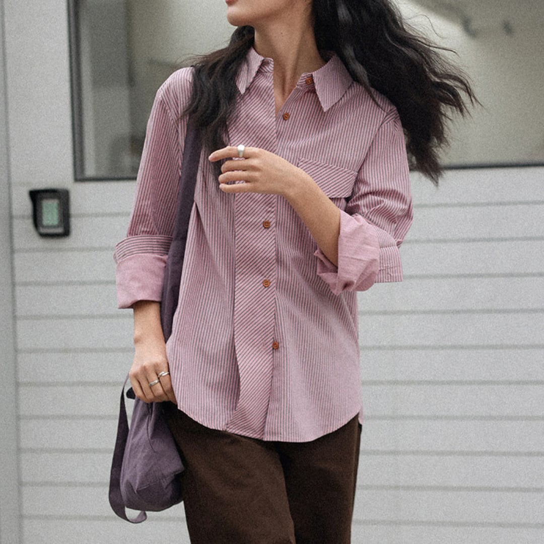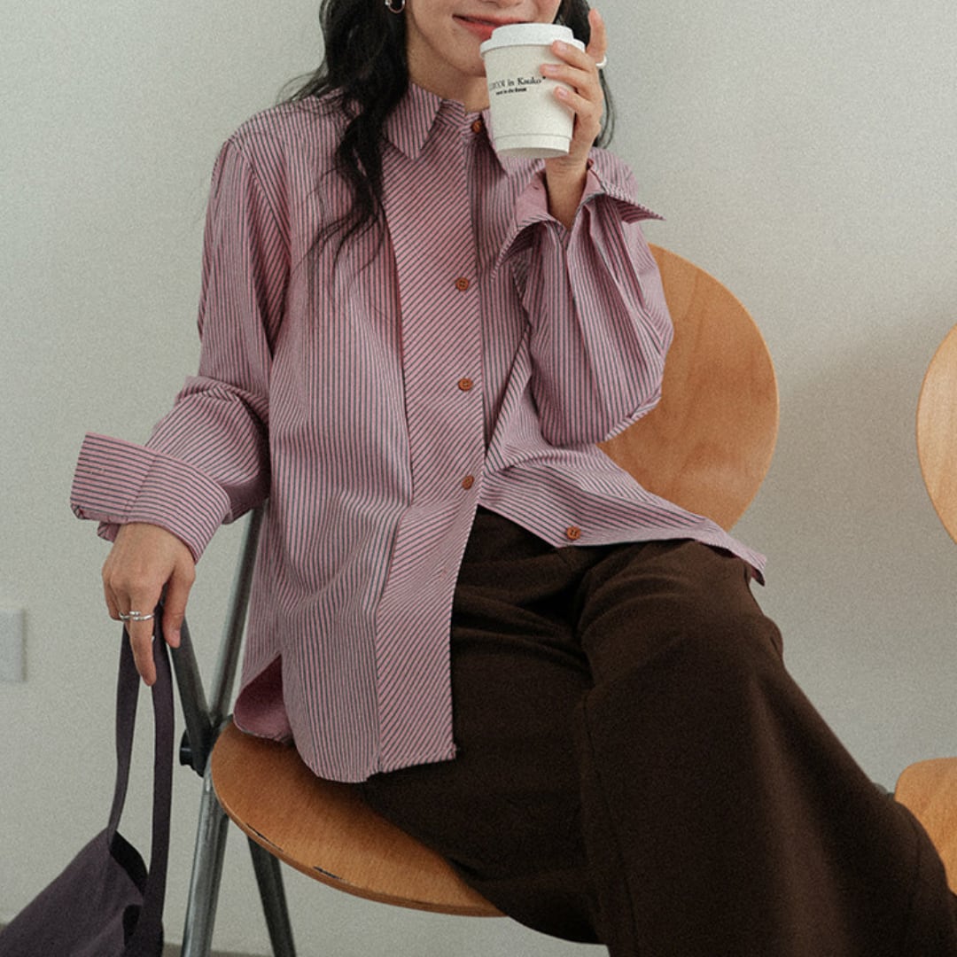 やわらかなコットン素材に細めのストライプ柄を施し、ナチュラルで落ち着いた印象に仕上げた長袖シャツ。