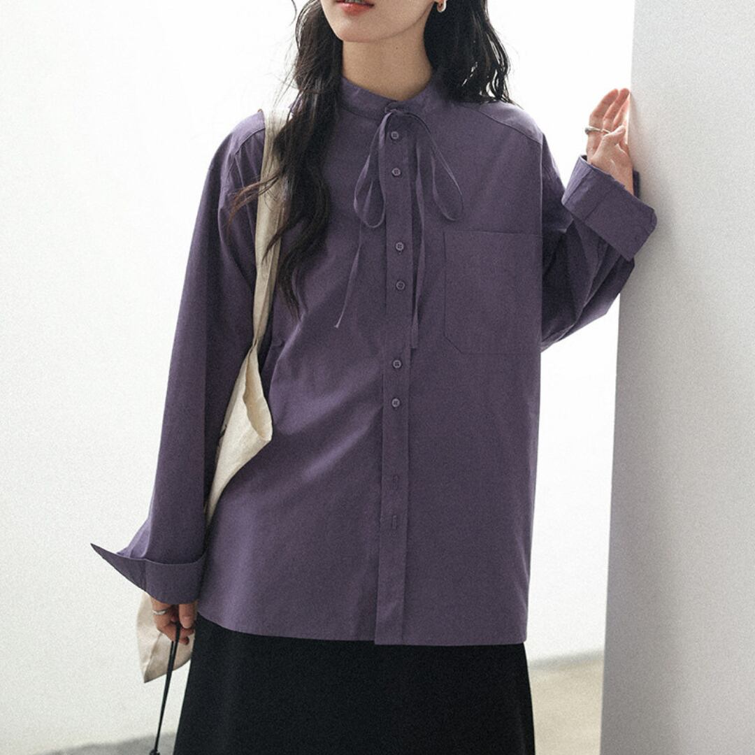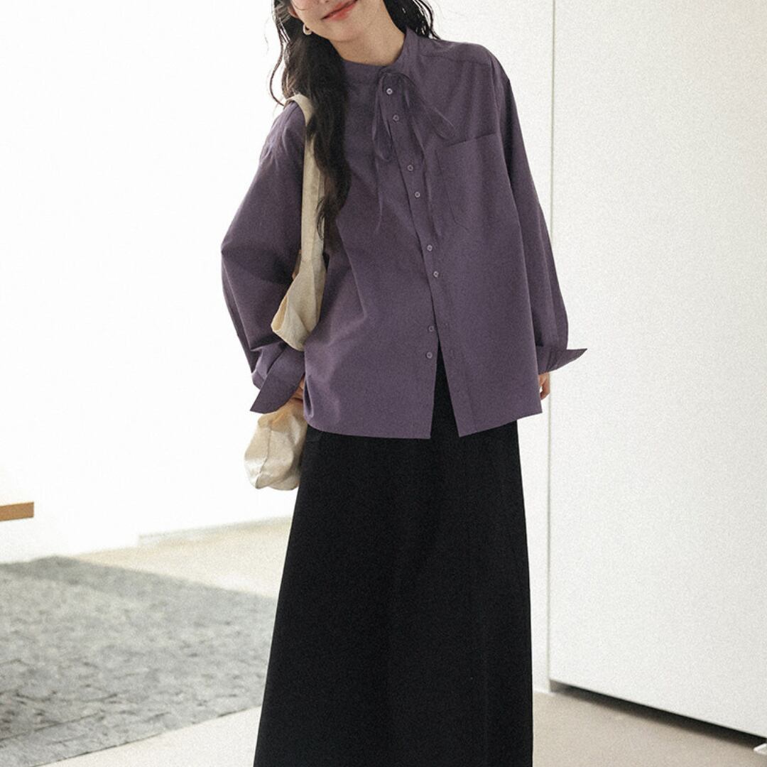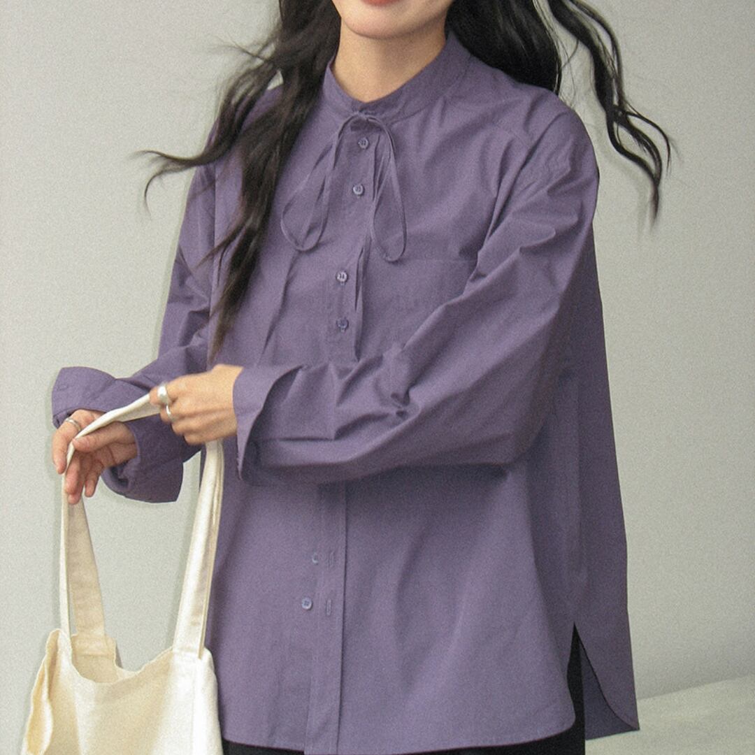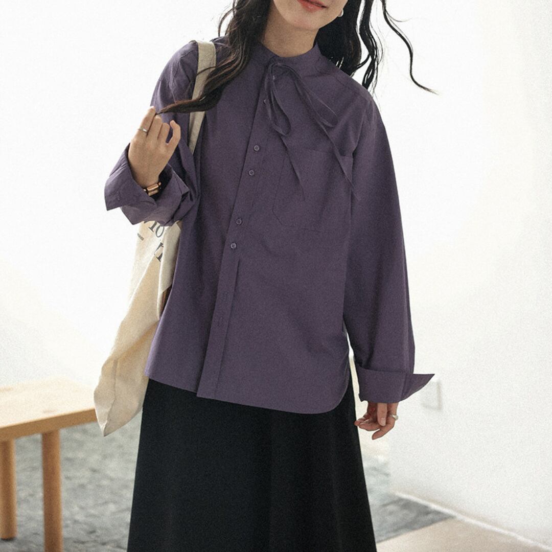 やわらかなコットン素材にリボンネックデザインを取り入れ、上品さと可愛らしさを兼ね備えた印象に仕上げた長袖シャツ。