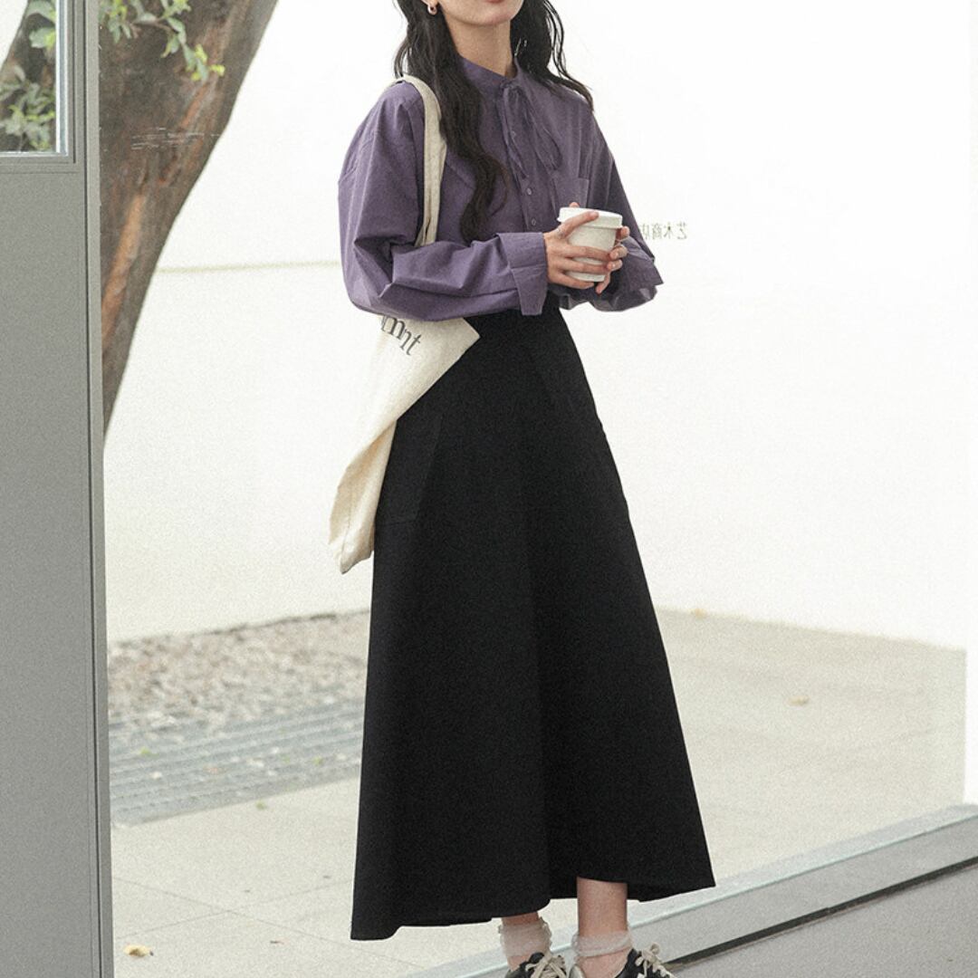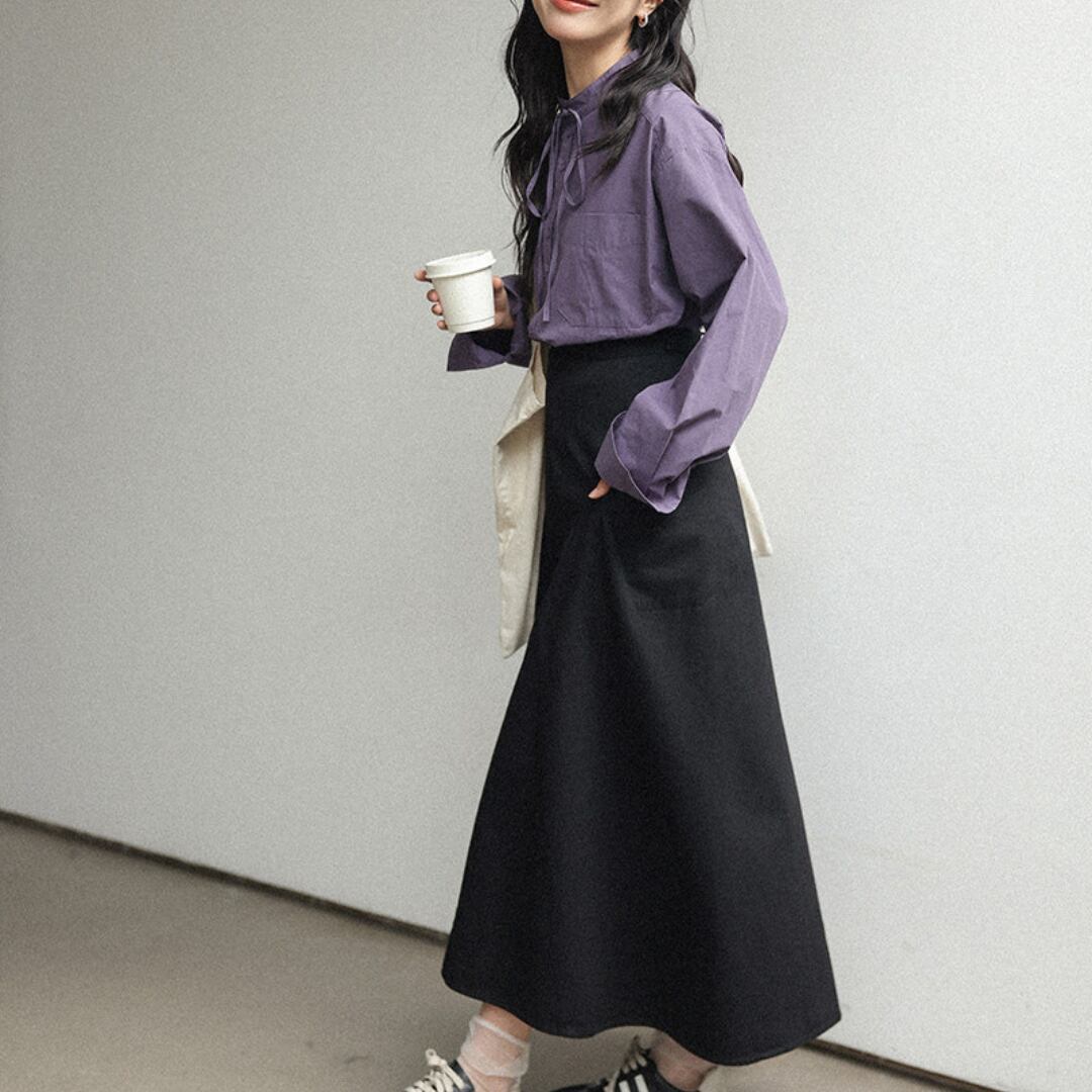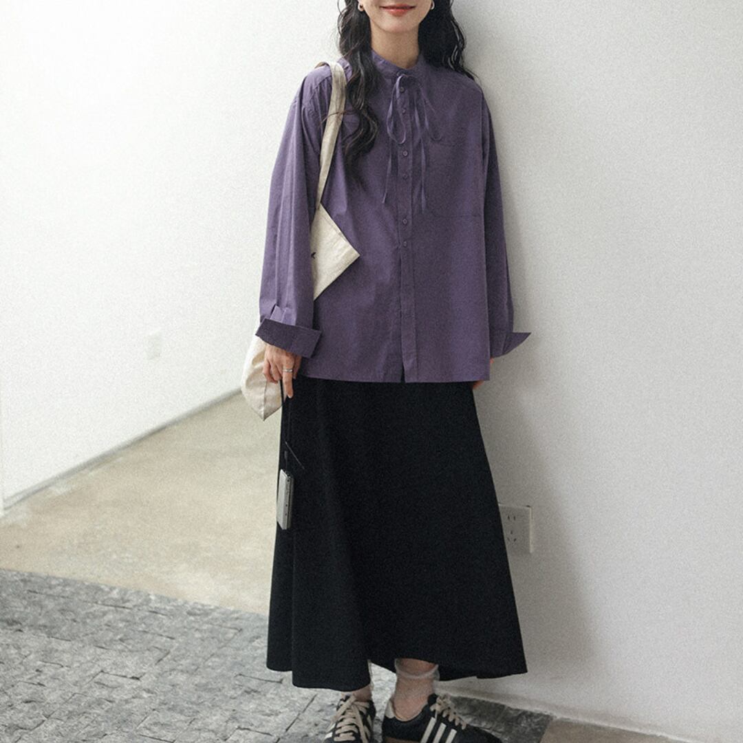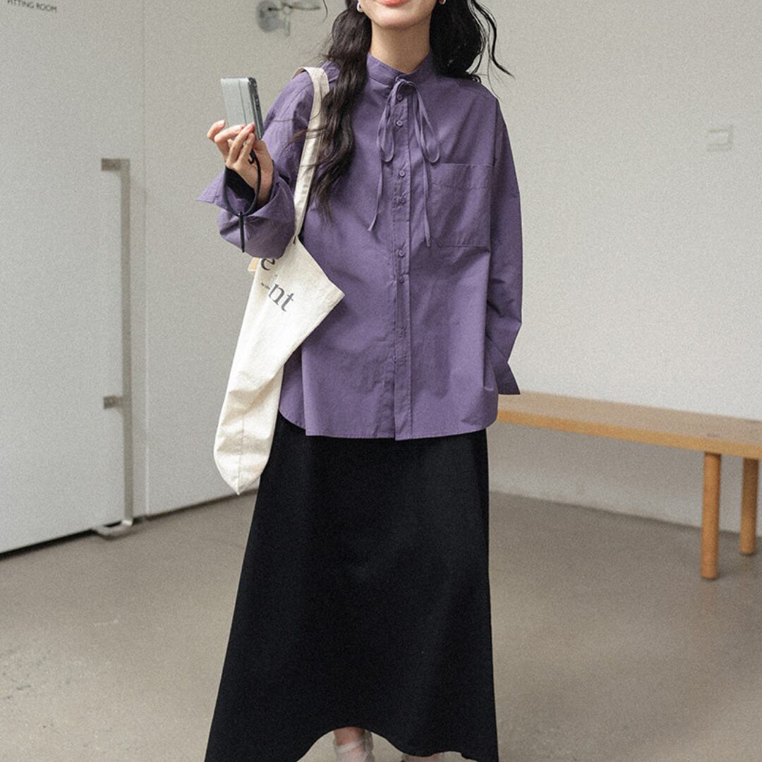 やわらかなコットン素材にリボンネックデザインを取り入れ、上品さと可愛らしさを兼ね備えた印象に仕上げた長袖シャツ。