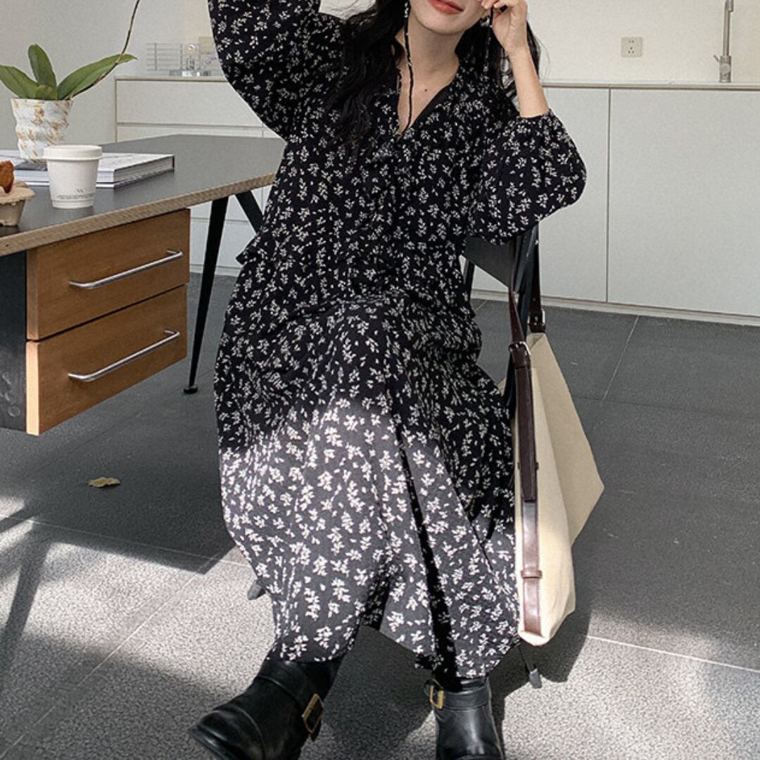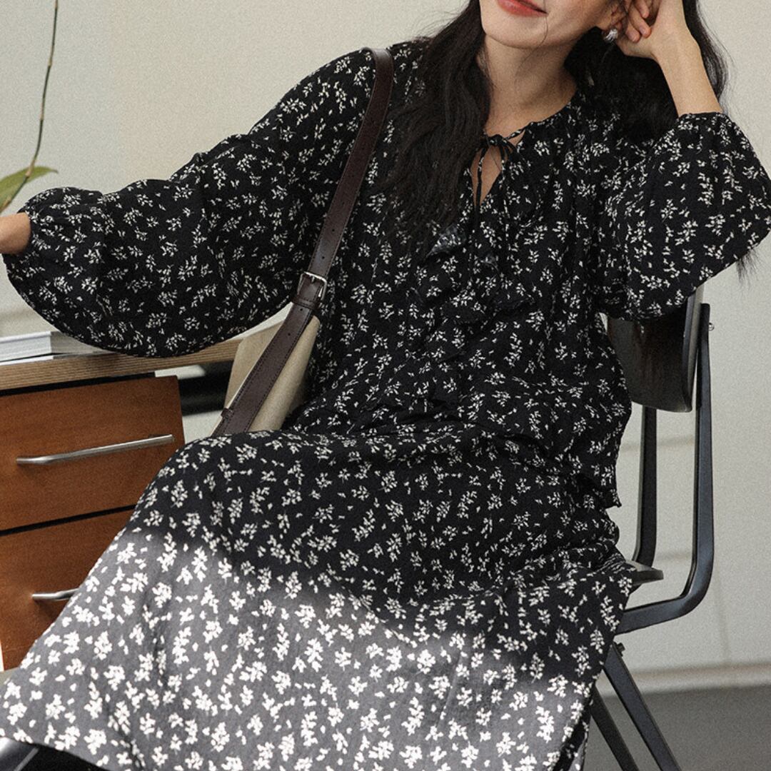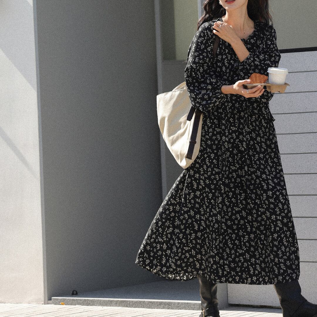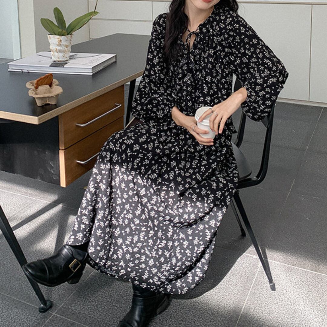 繊細な小花柄とティアードデザインが魅力のロングワンピースで、軽やかな素材感と柔らかな揺れ感が女性らしい雰囲気を引き立てます。