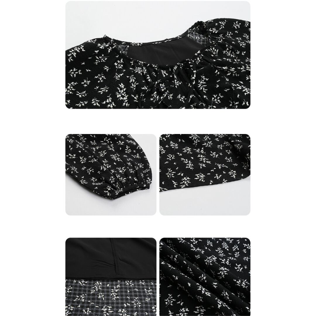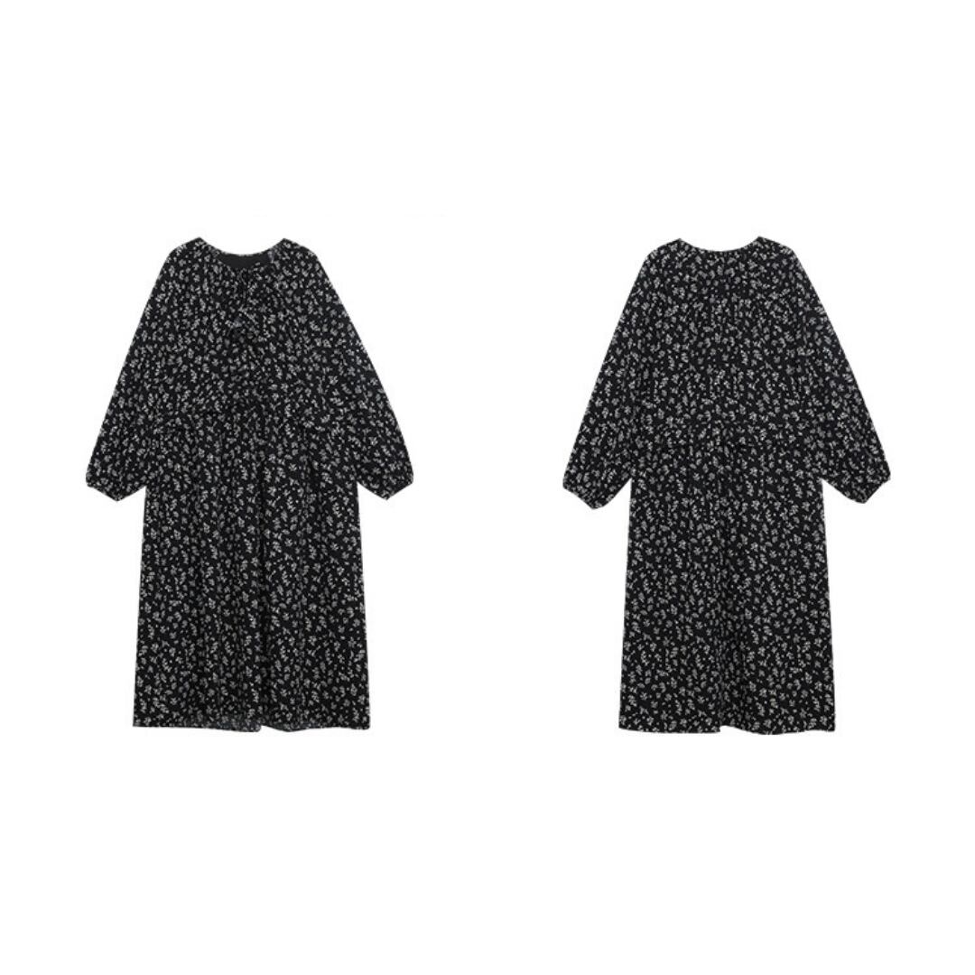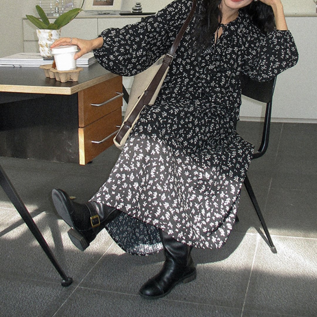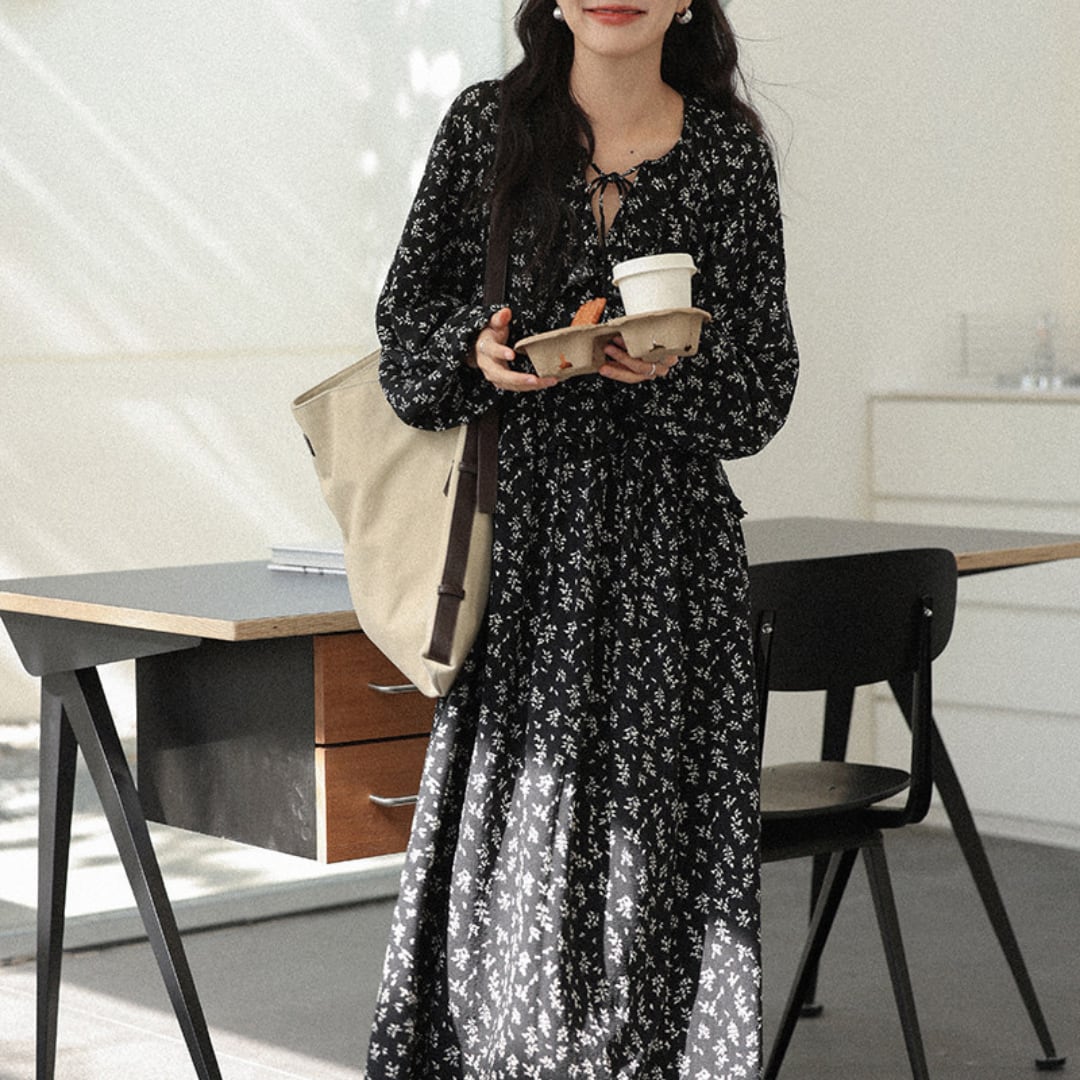 繊細な小花柄とティアードデザインが魅力のロングワンピースで、軽やかな素材感と柔らかな揺れ感が女性らしい雰囲気を引き立てます。