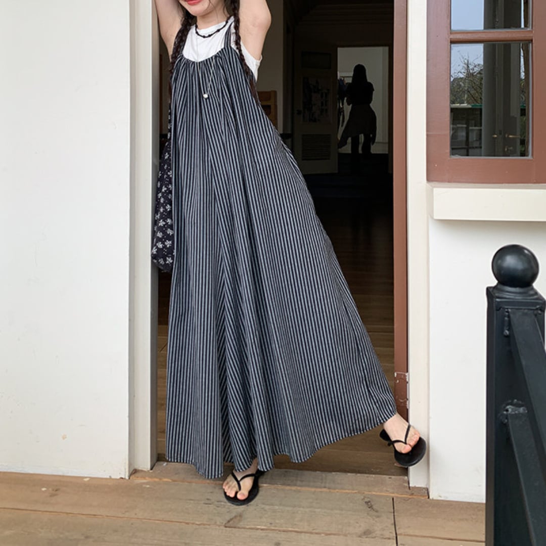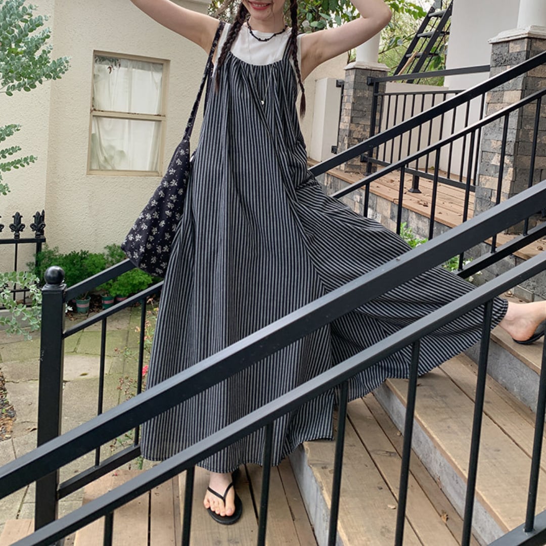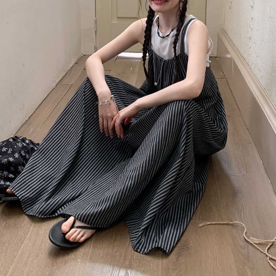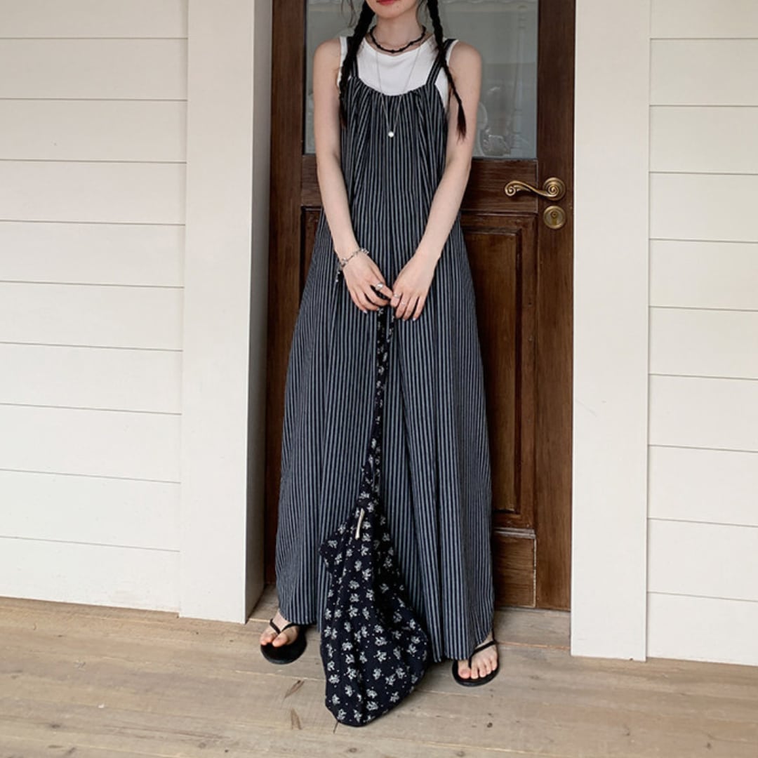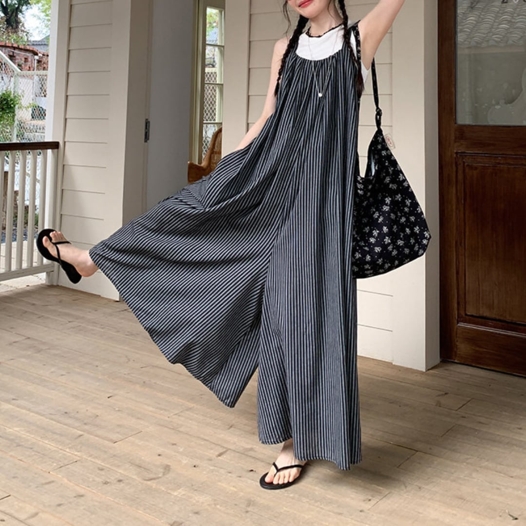 細かなストライプ柄と、裾までゆったり広がるワイドシルエットが印象的なキャミソールオールインワン。