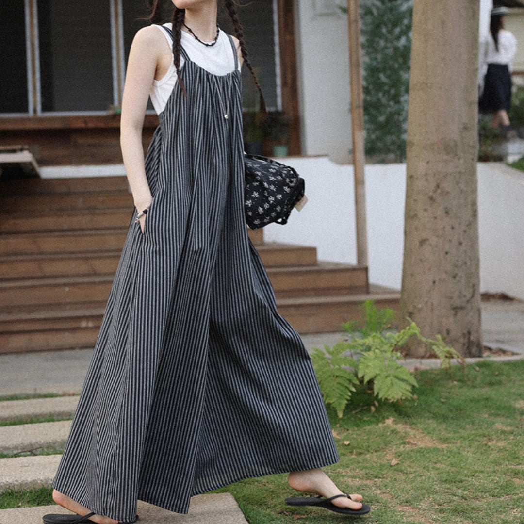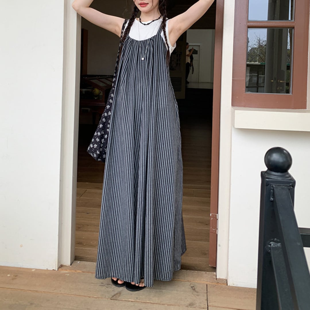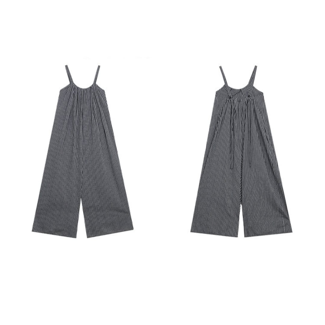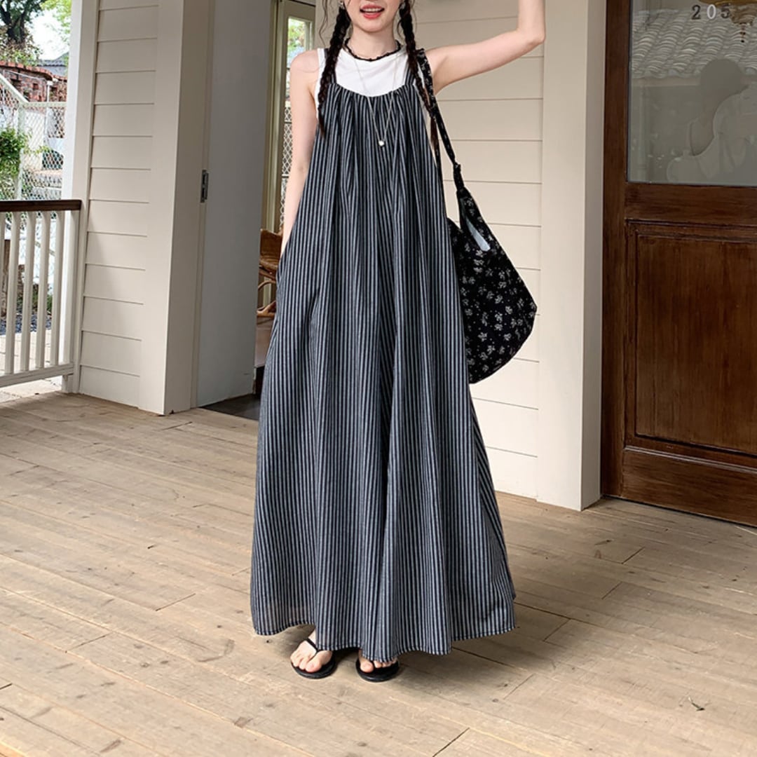細かなストライプ柄と、裾までゆったり広がるワイドシルエットが印象的なキャミソールオールインワン。
