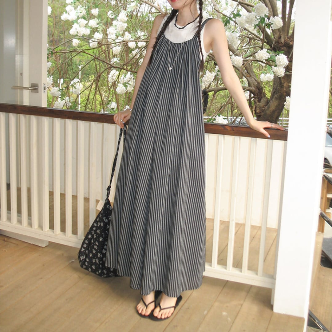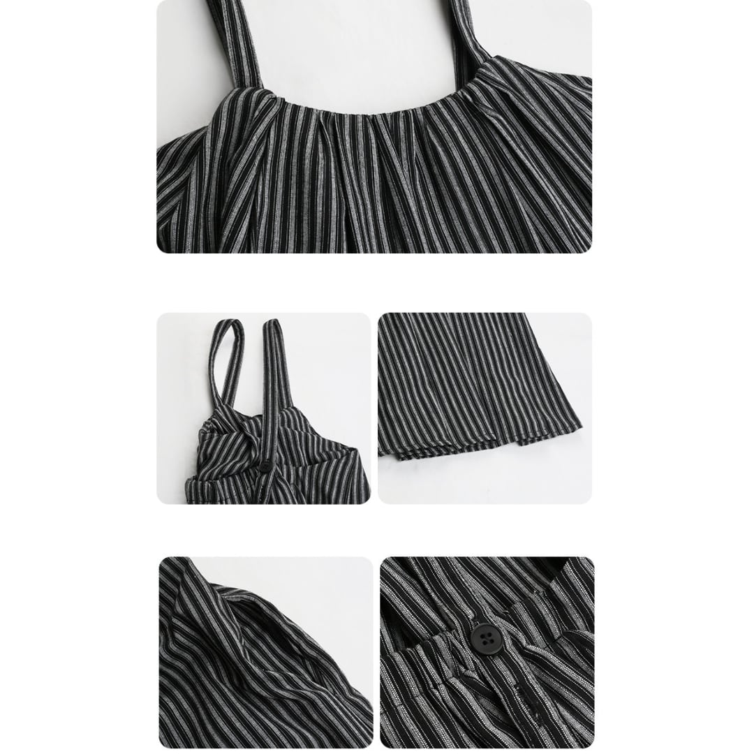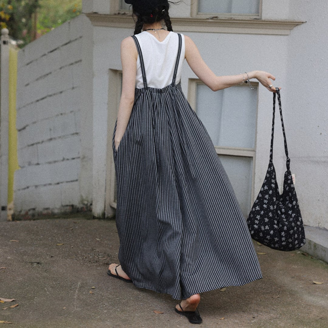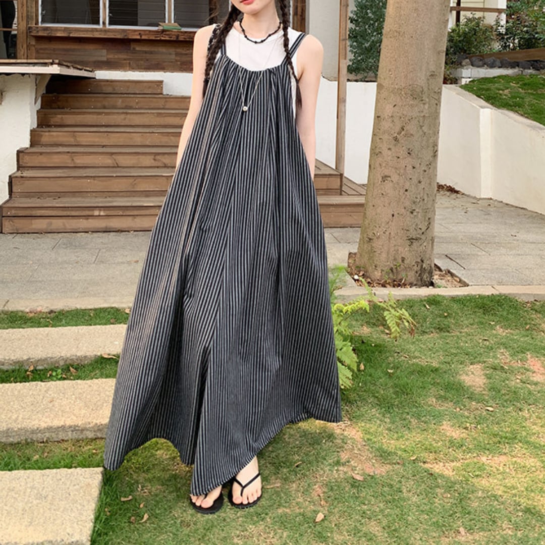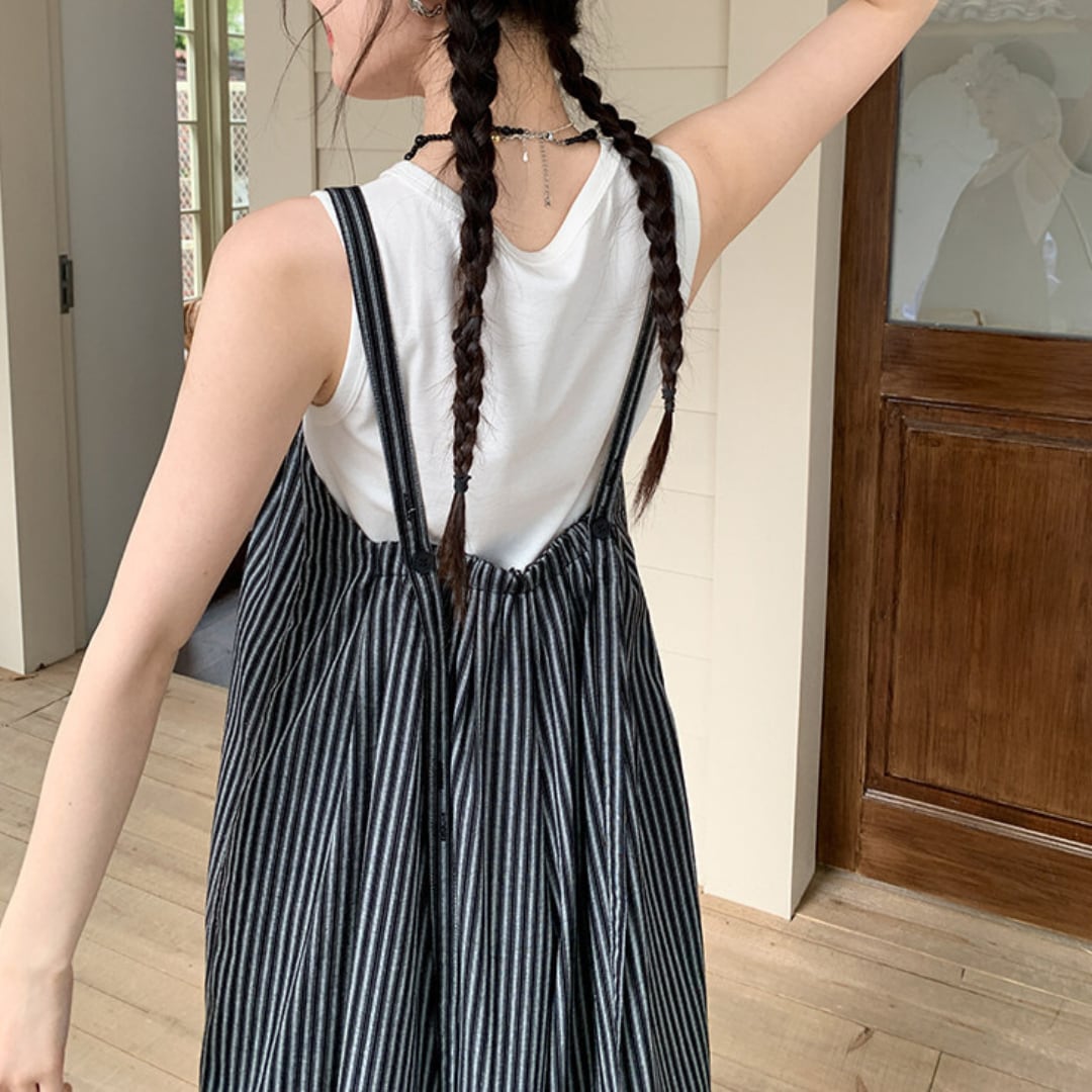 細かなストライプ柄と、裾までゆったり広がるワイドシルエットが印象的なキャミソールオールインワン。