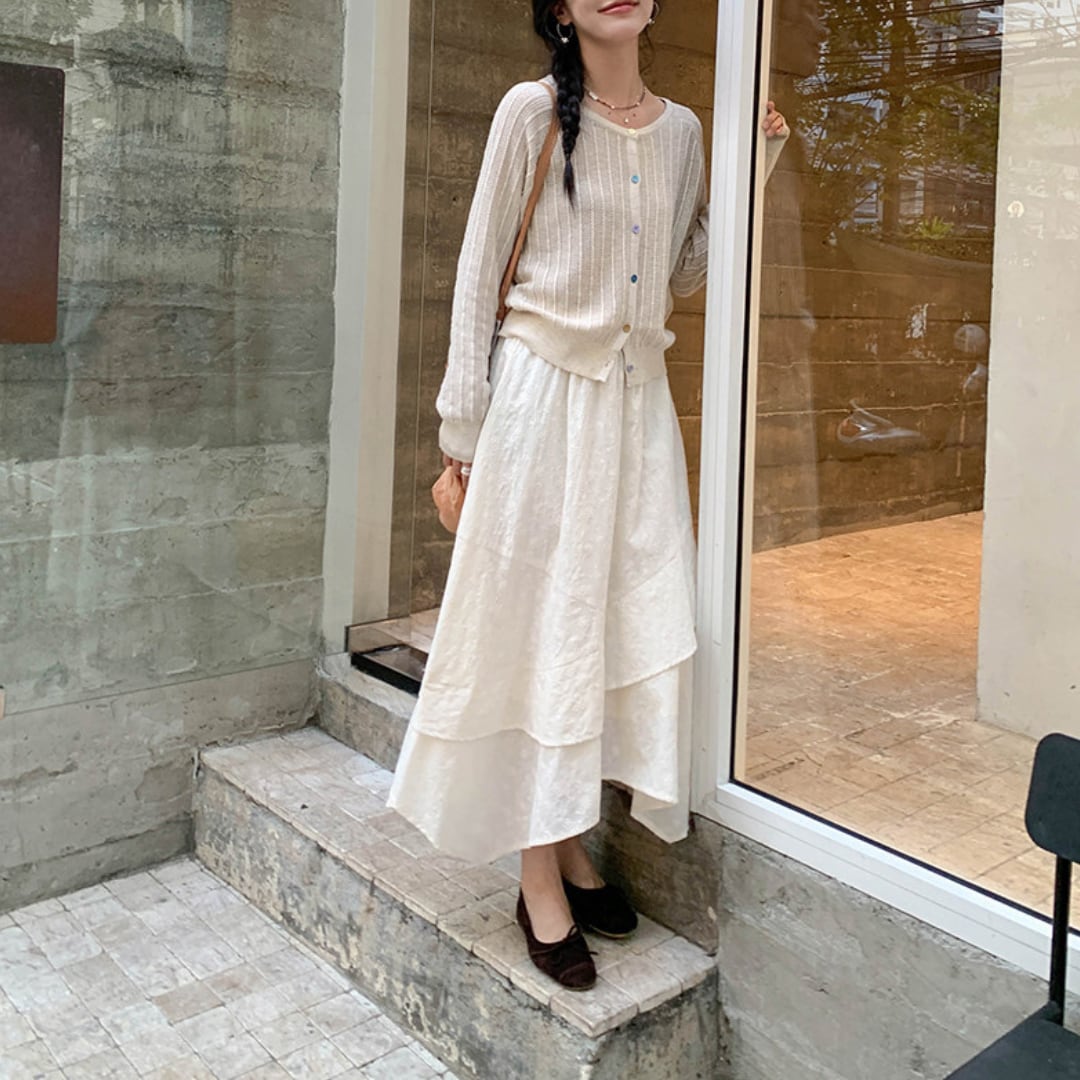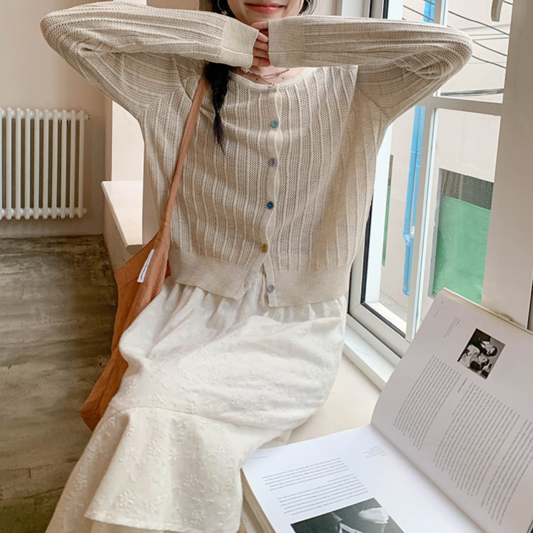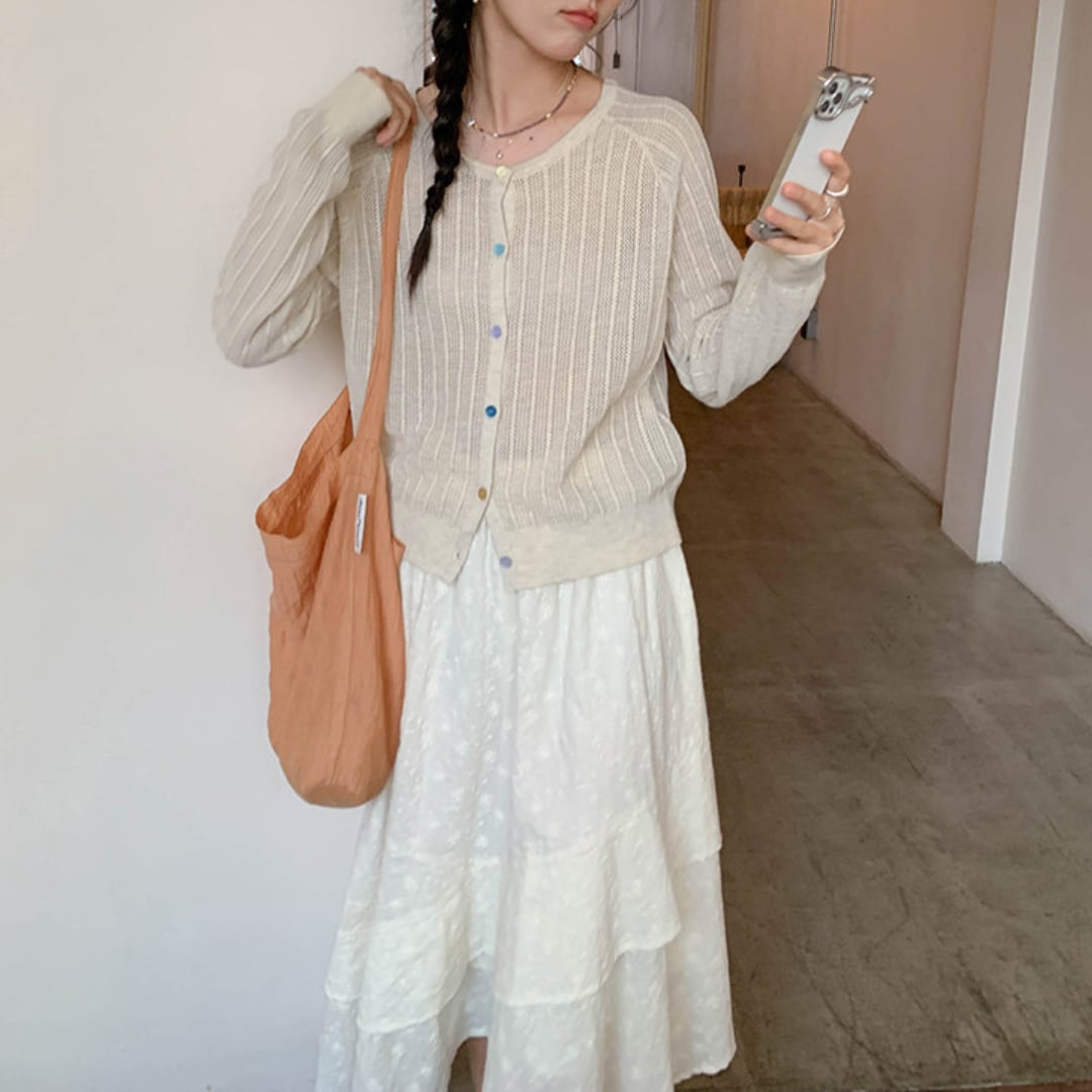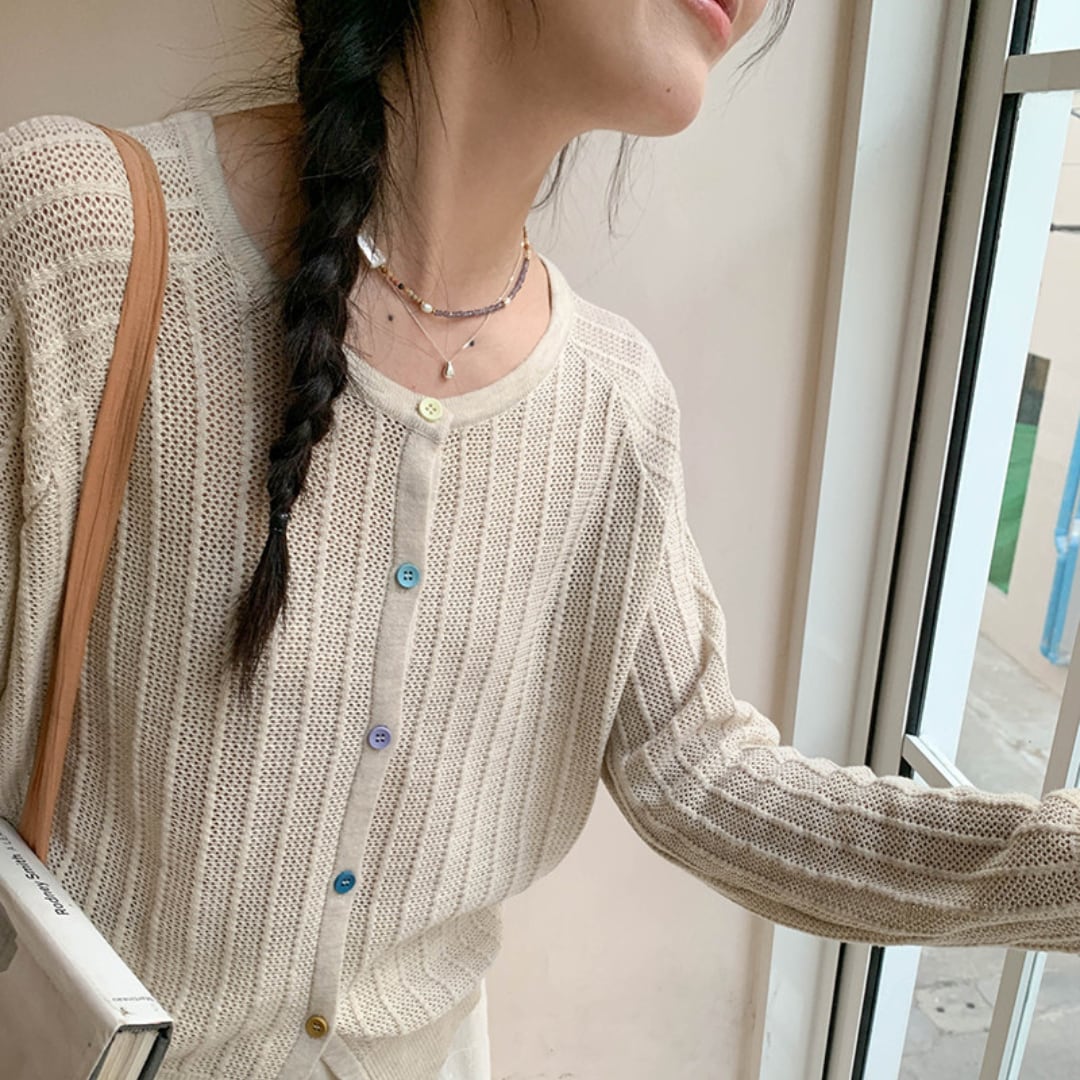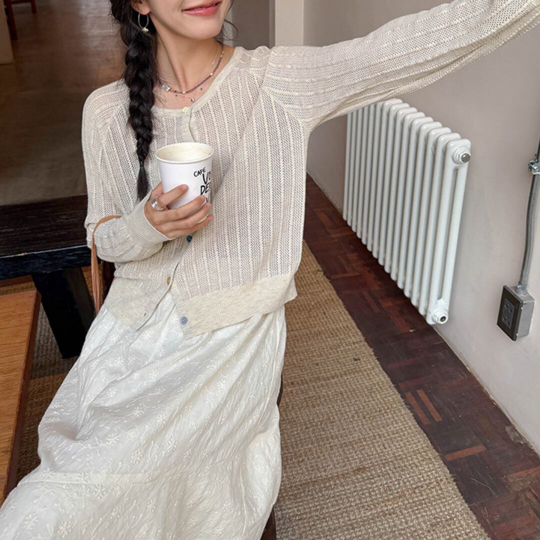 透け感のある軽やかな編み地と繊細なリブデザインが特徴で、ナチュラルで柔らかな雰囲気を演出してくれるニットカーディガン。