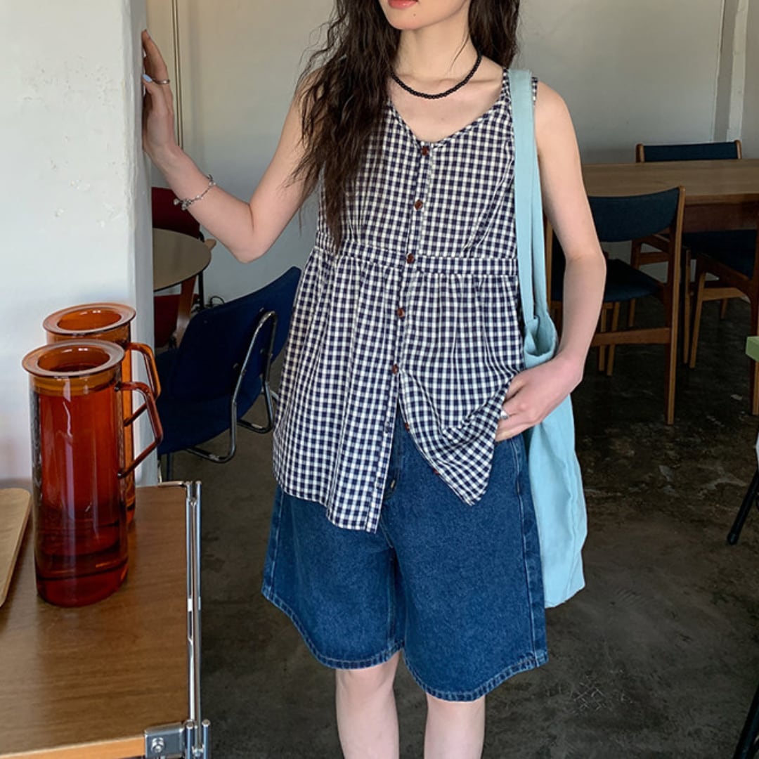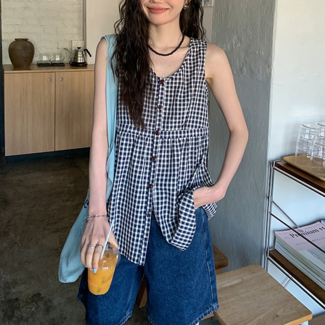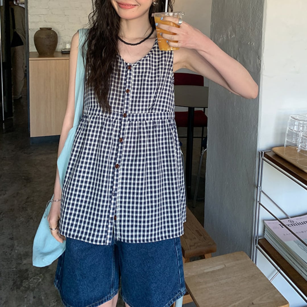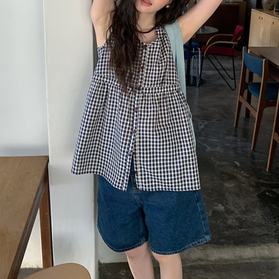 細かなギンガムチェック柄とフロントボタンのデザインがやさしいアクセントになり、ふんわりと広がるシルエットで軽やかに着こなせるノースリーブブラウス。