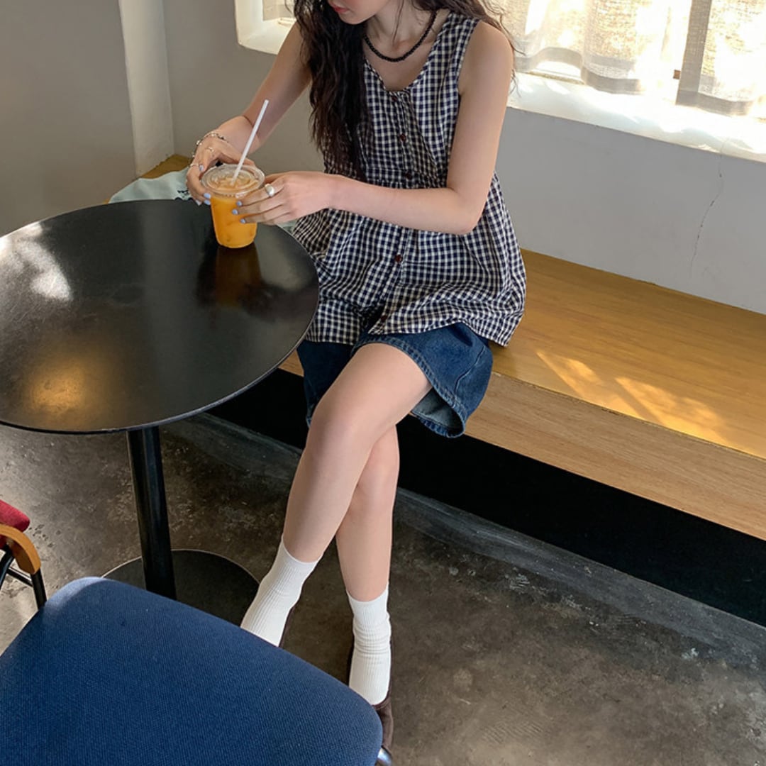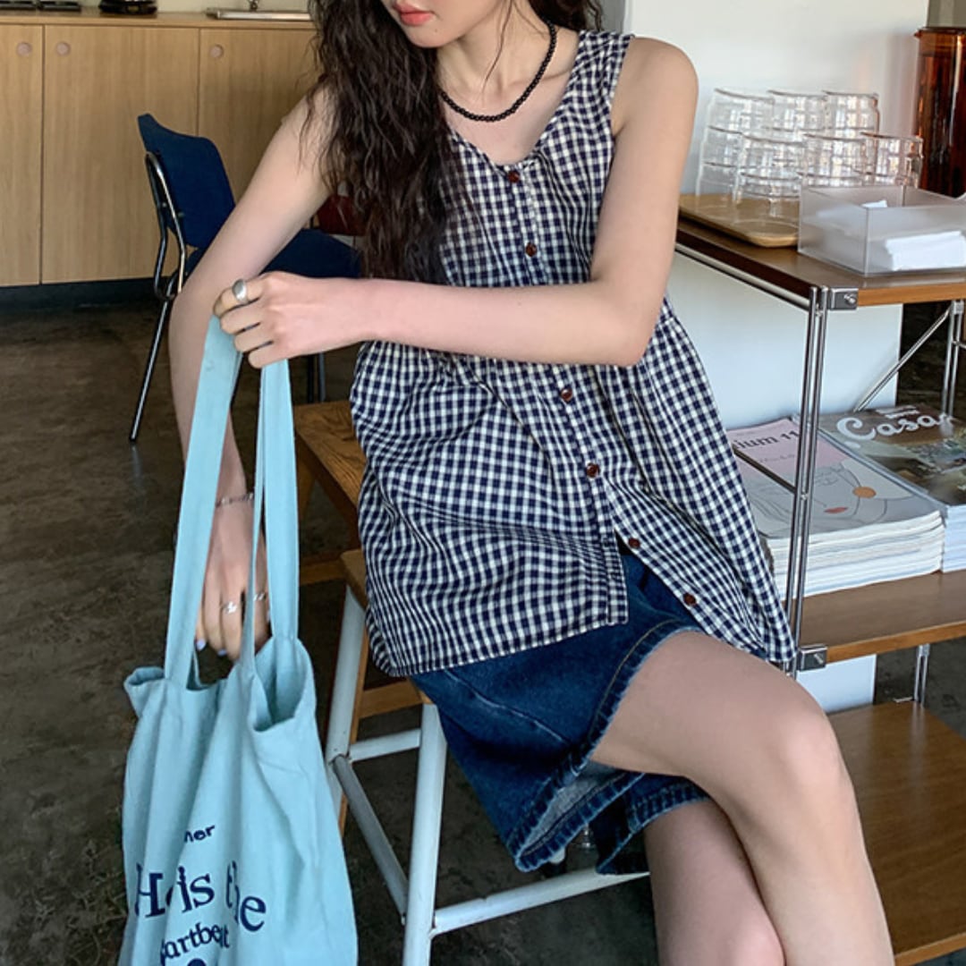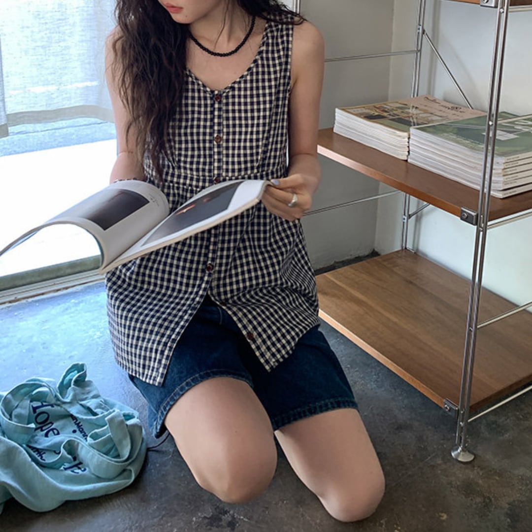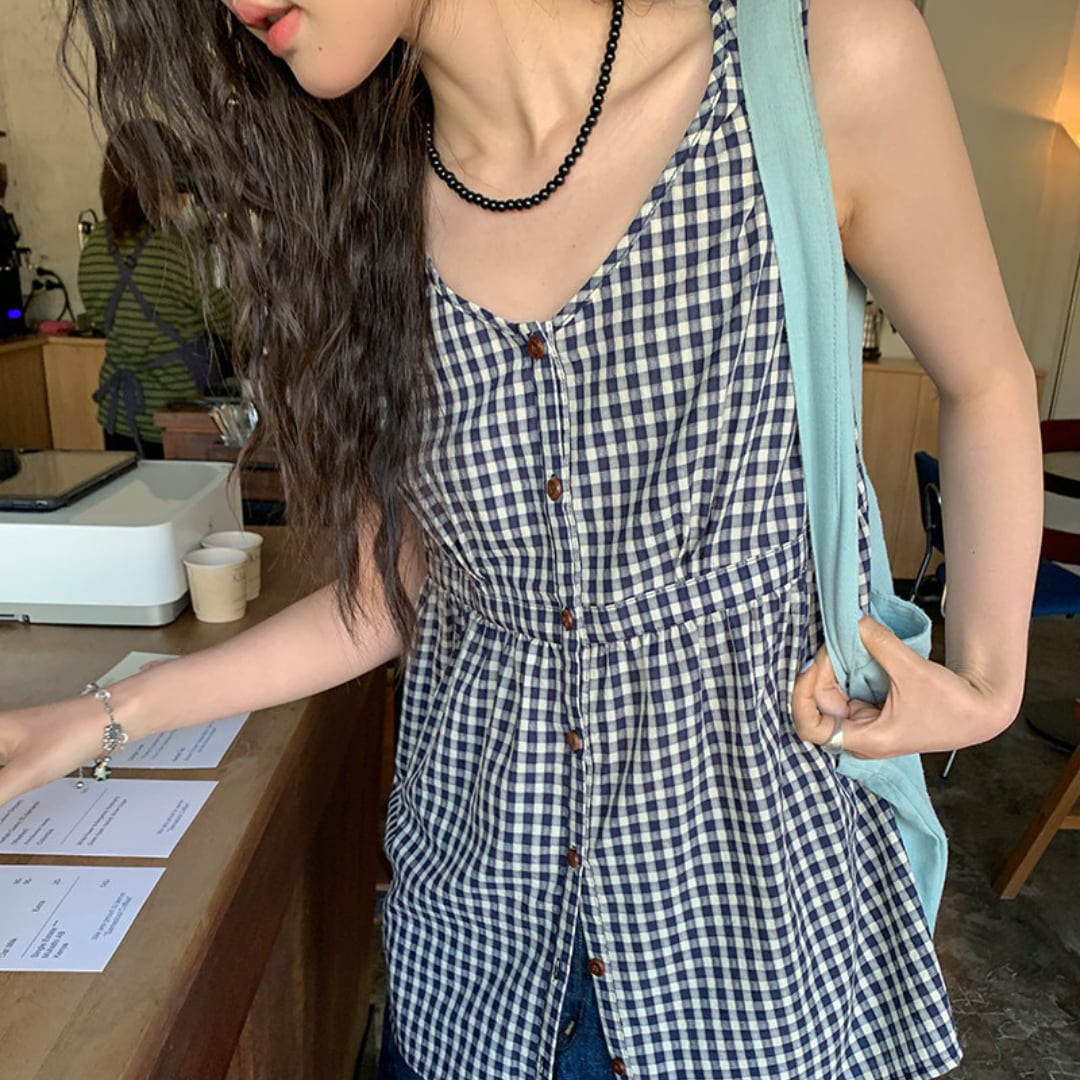 細かなギンガムチェック柄とフロントボタンのデザインがやさしいアクセントになり、ふんわりと広がるシルエットで軽やかに着こなせるノースリーブブラウス。