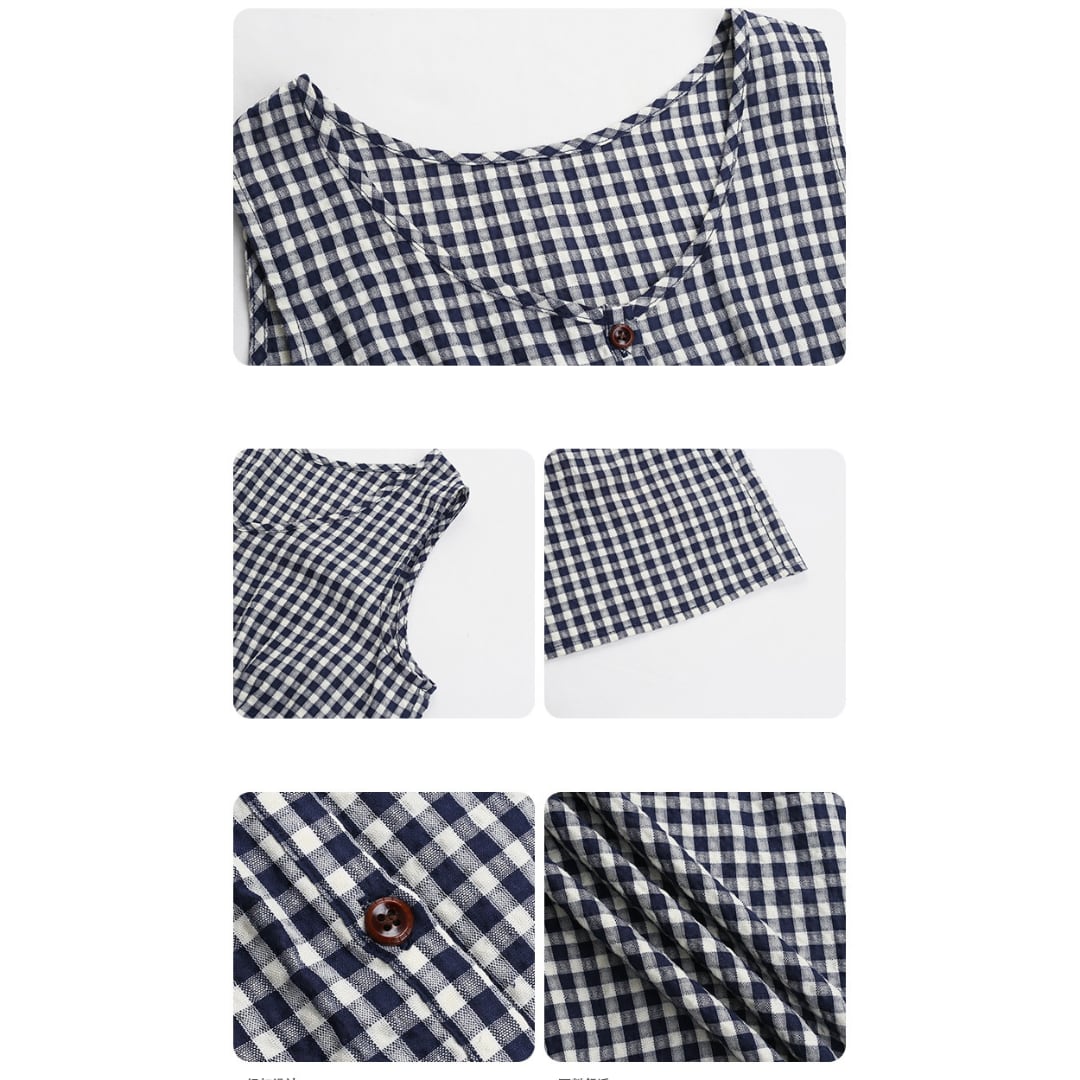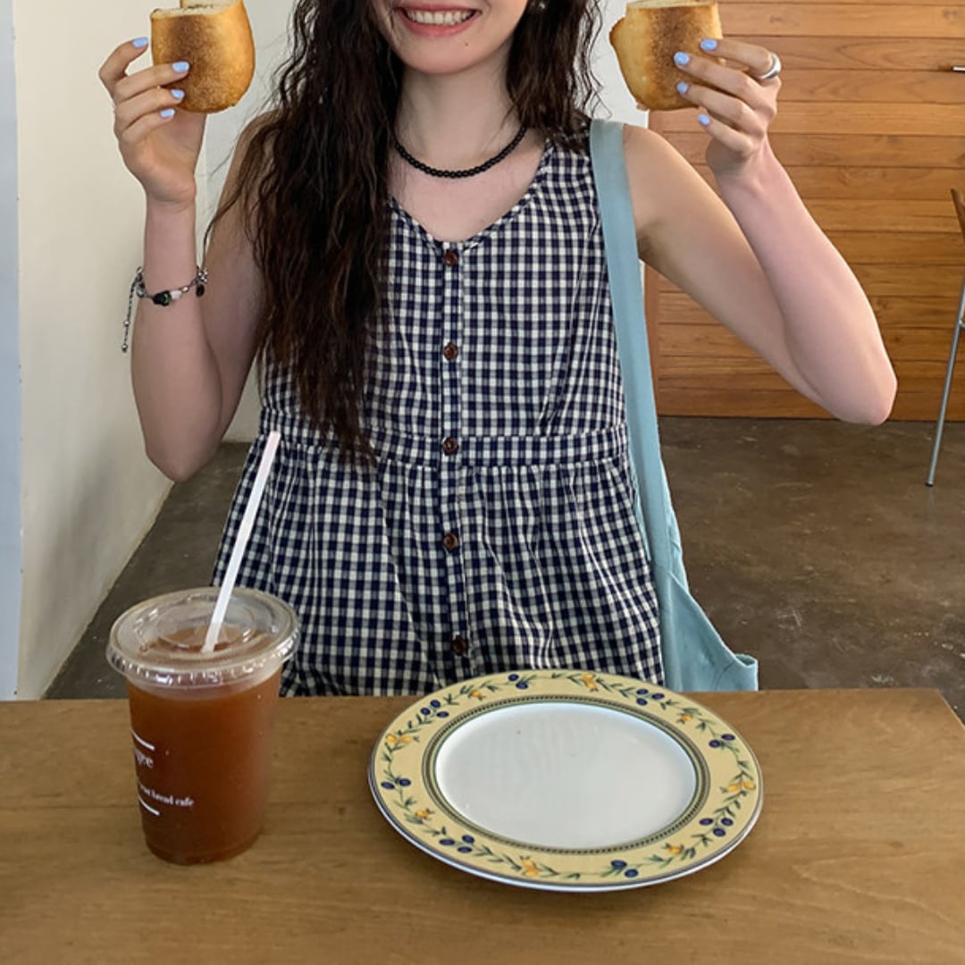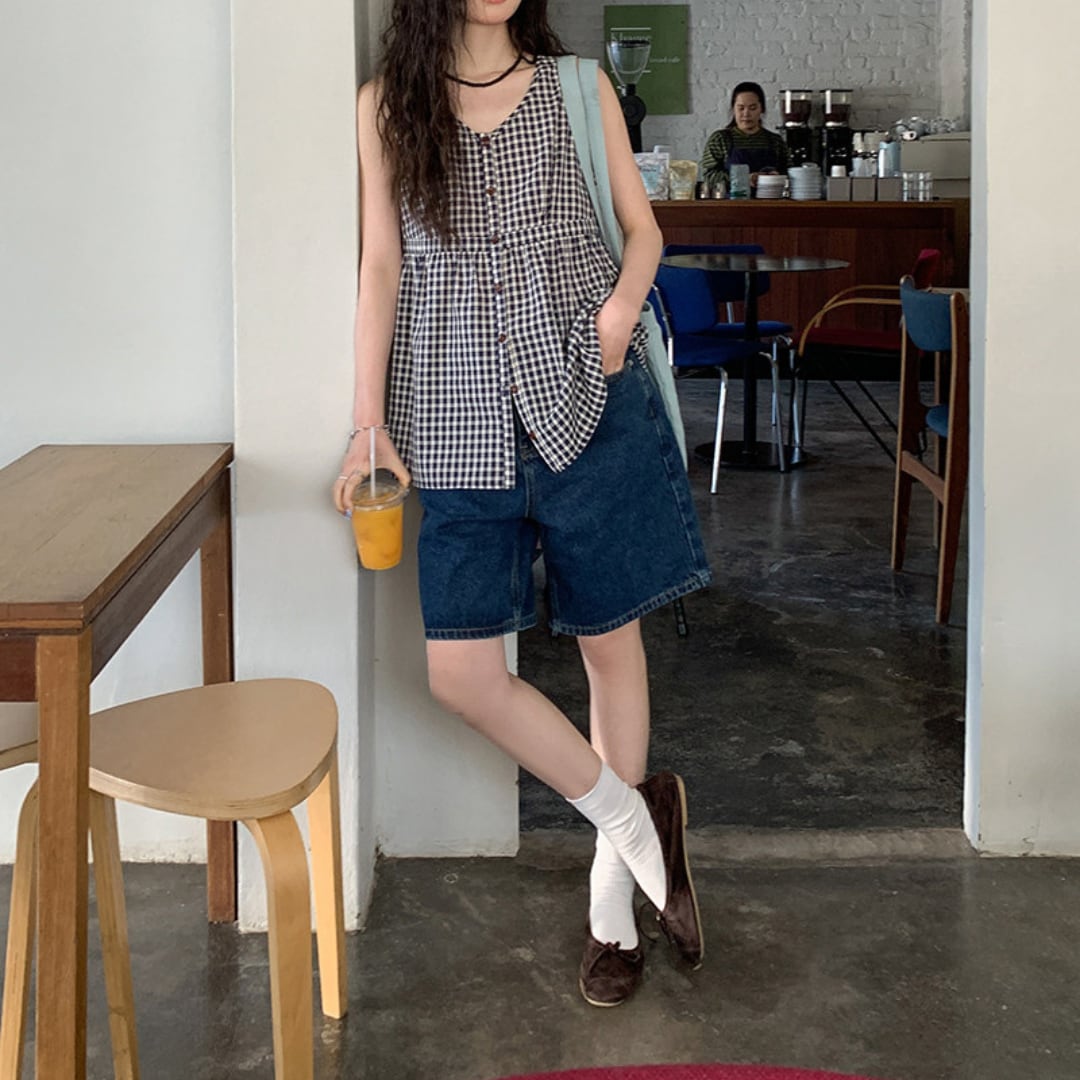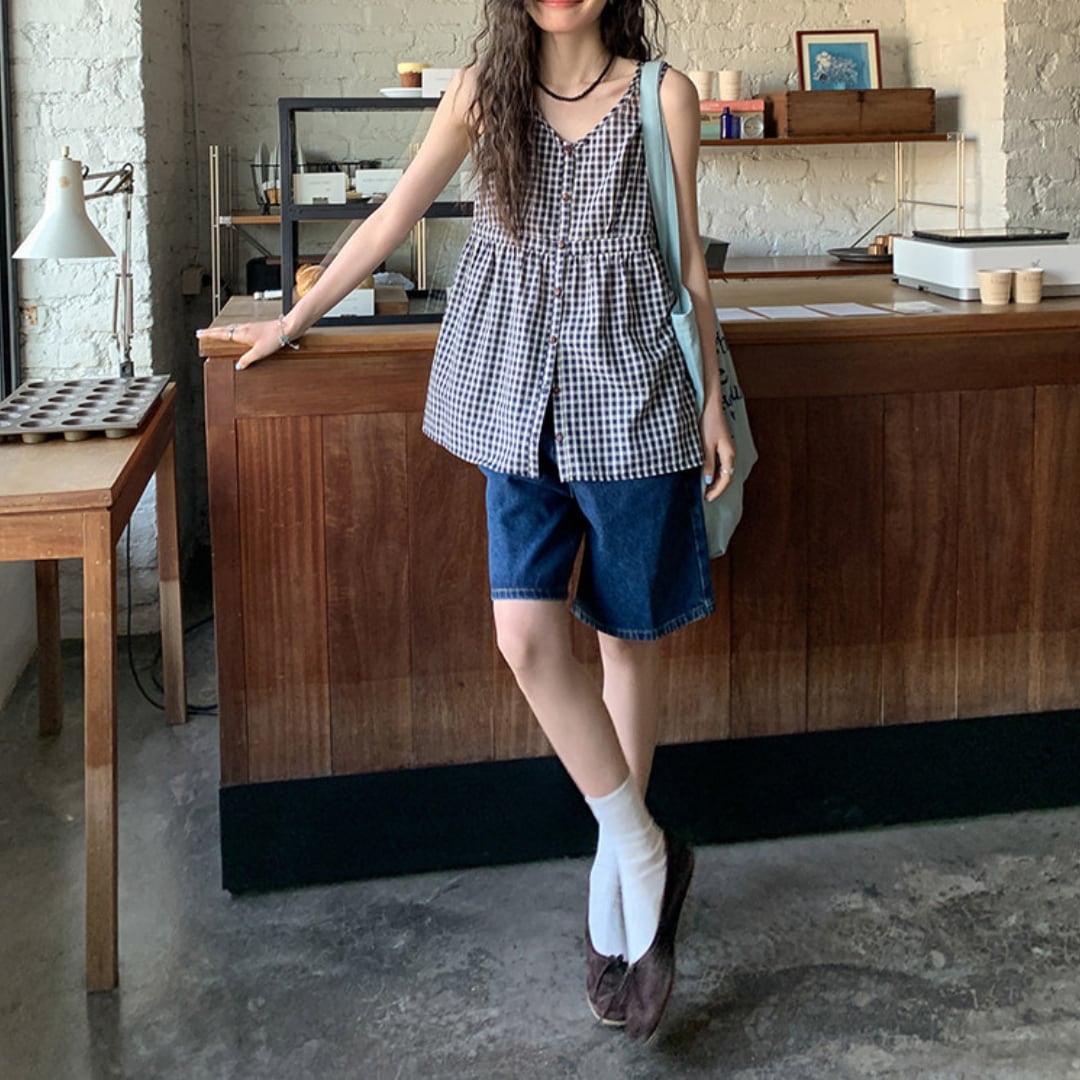 細かなギンガムチェック柄とフロントボタンのデザインがやさしいアクセントになり、ふんわりと広がるシルエットで軽やかに着こなせるノースリーブブラウス。
