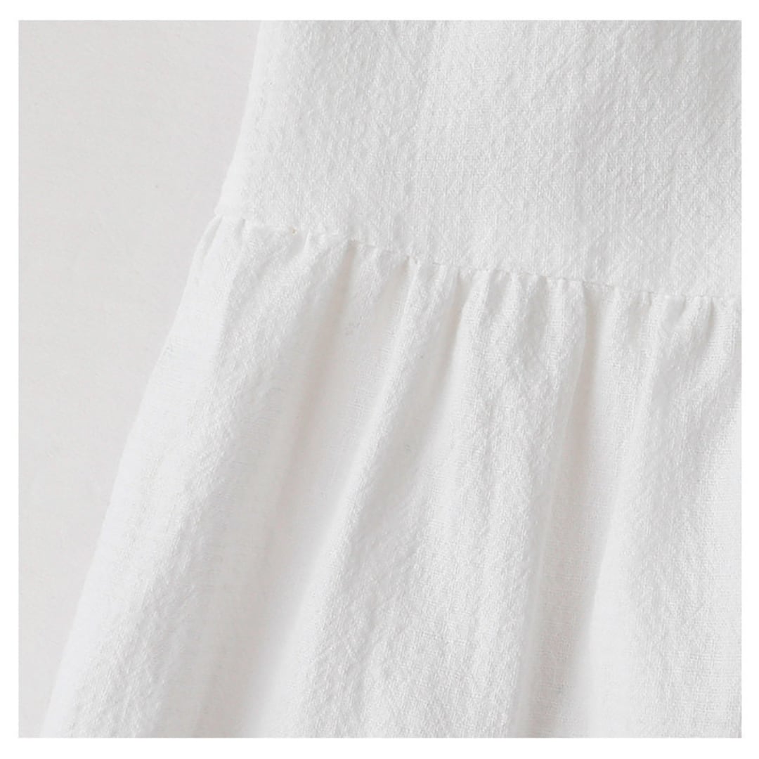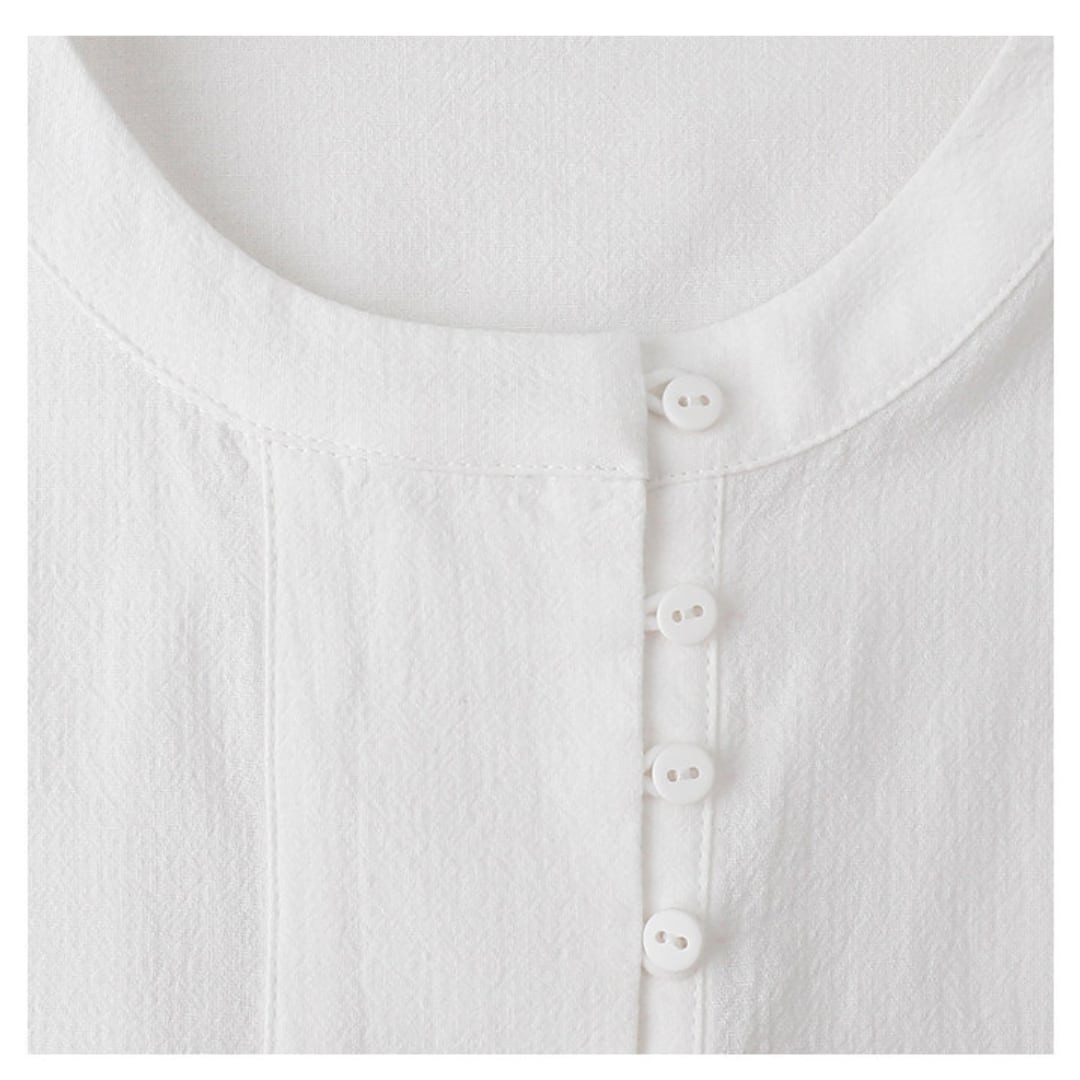 胸下からふんわり広がるギャザーデザインと、やさしい風合いのコットン素材が魅力のロングブラウス。