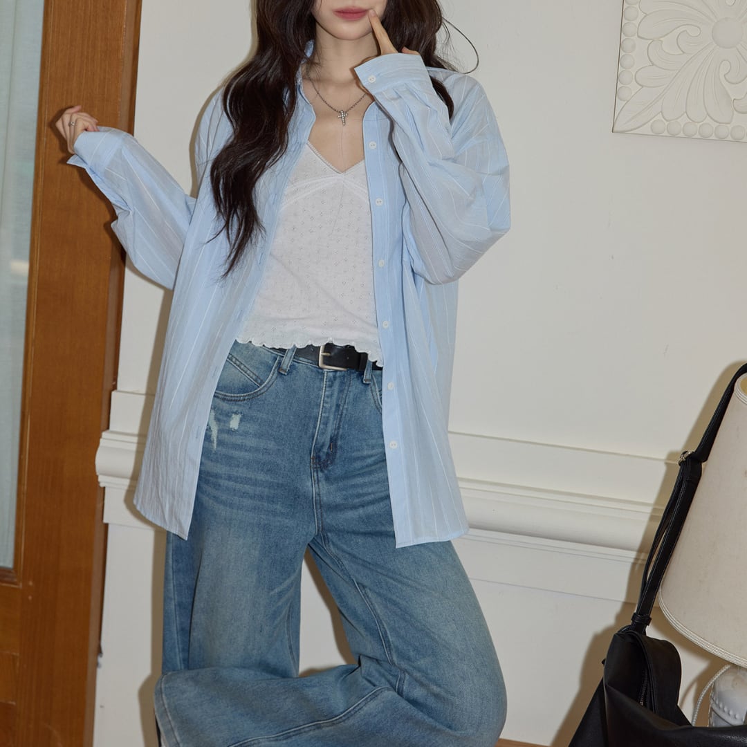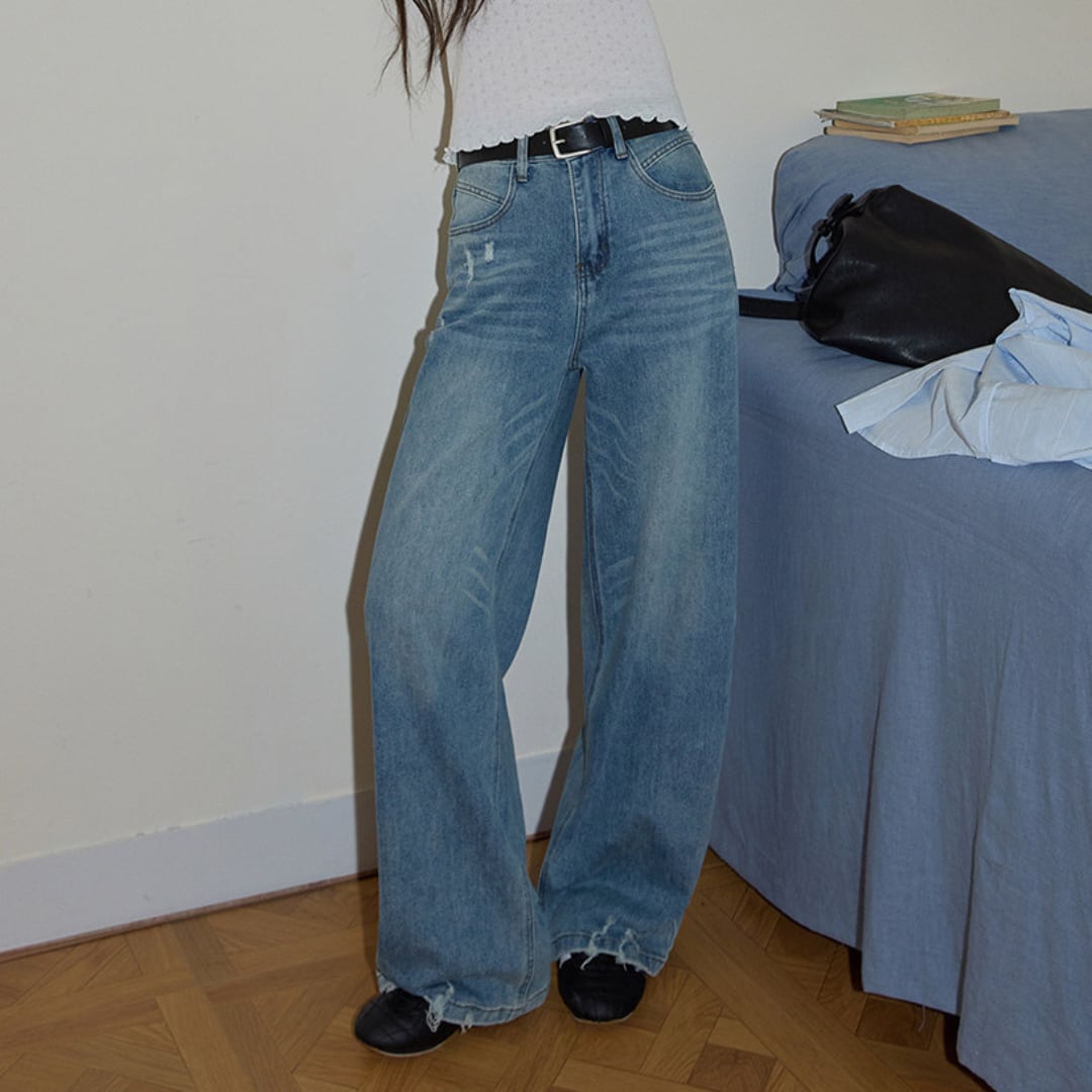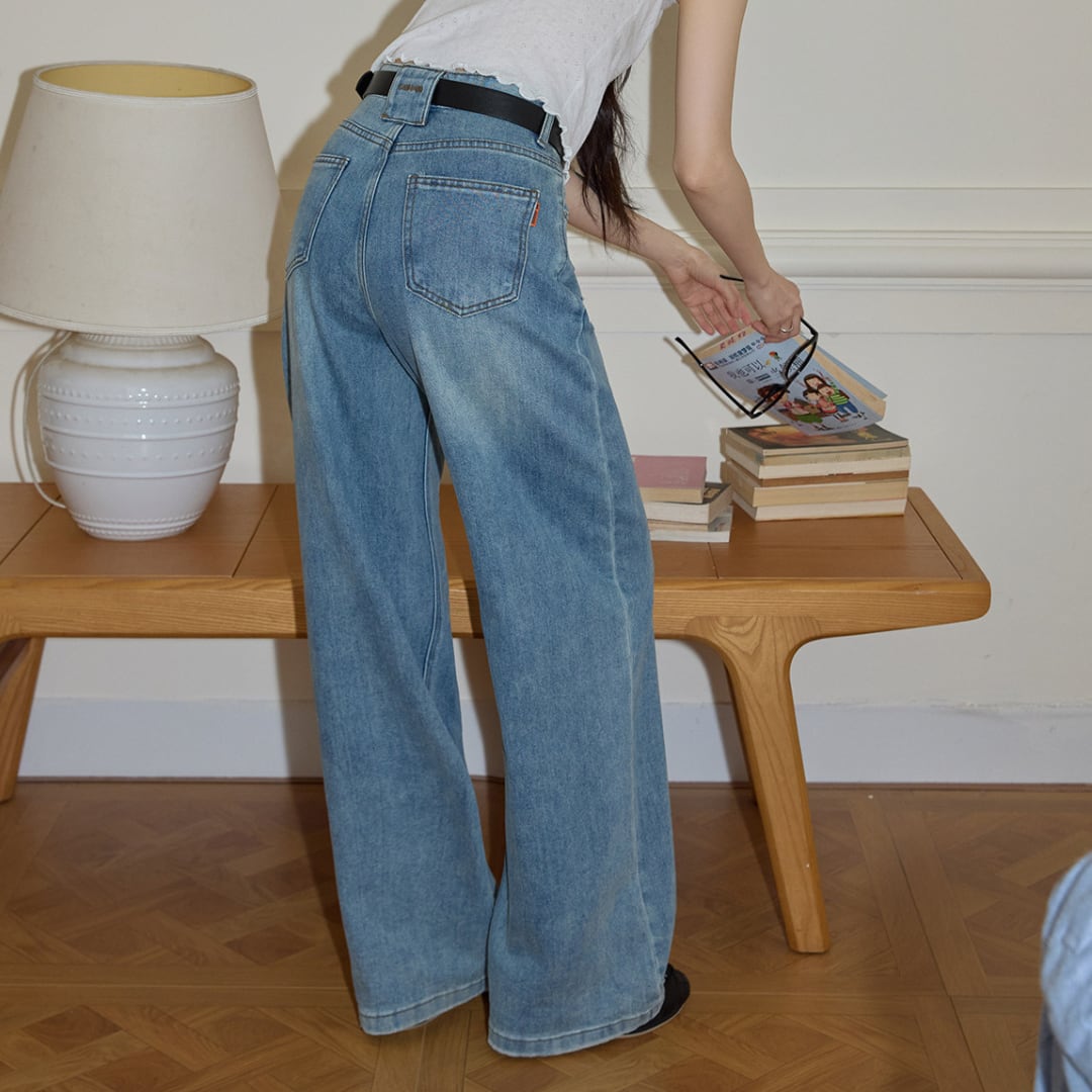 程よくゆとりのあるストレートワイドシルエットとハイウエスト設計が特徴で、腰まわりをすっきり見せながら自然に脚長効果を演出するデニムパンツ。