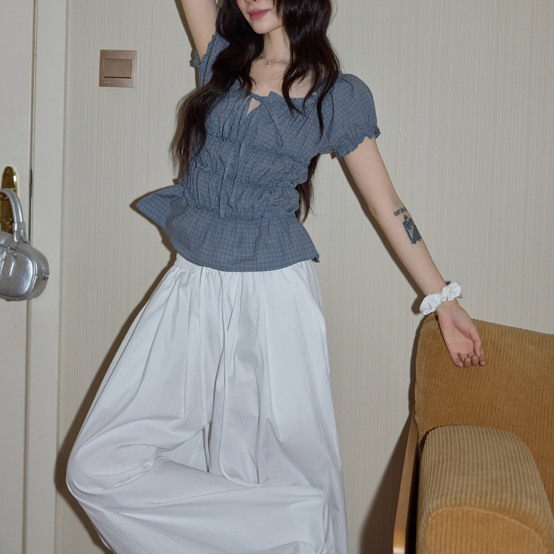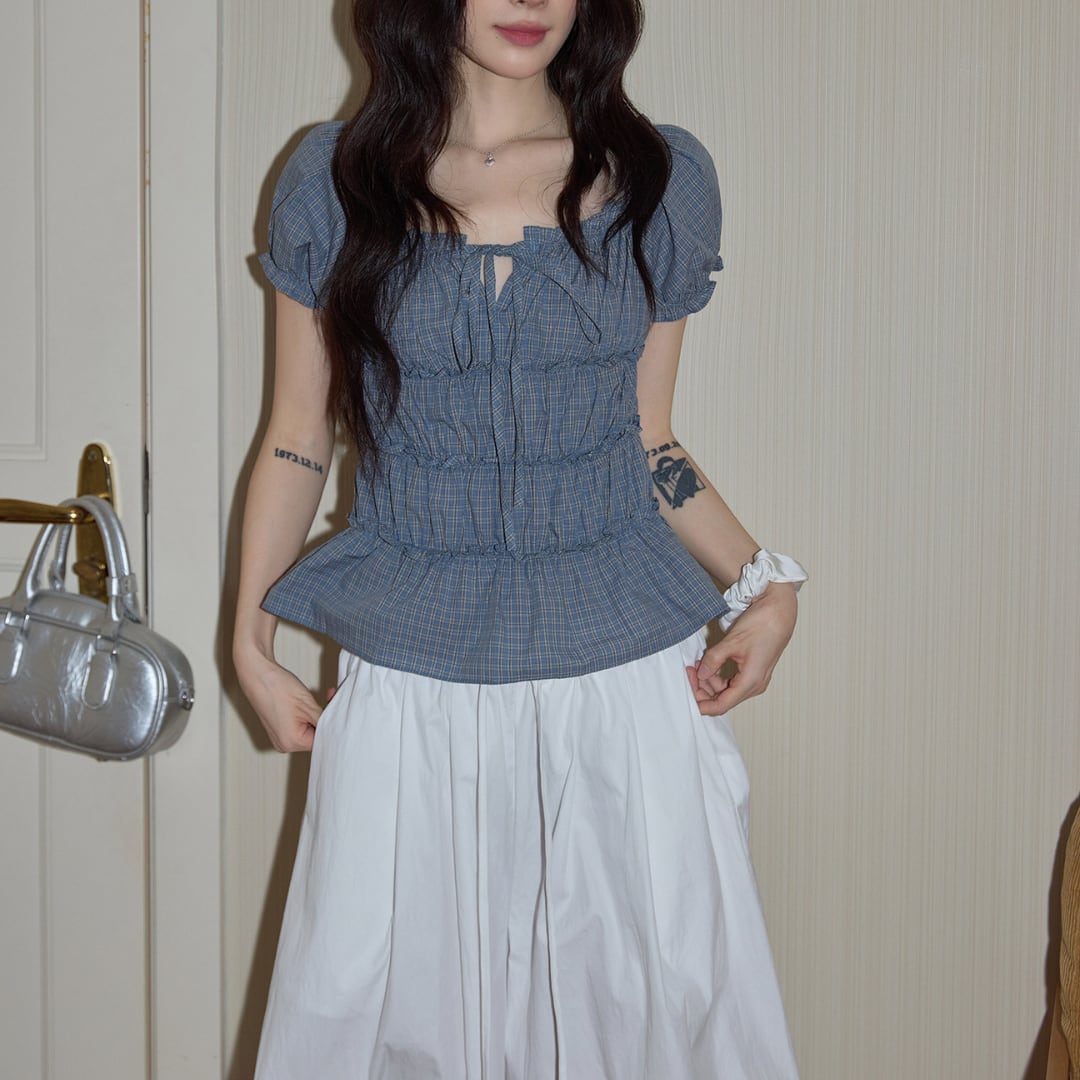 細やかなギャザーとコンパクトなシルエットが女性らしさを引き立てる、軽やかなチェック柄トップス。