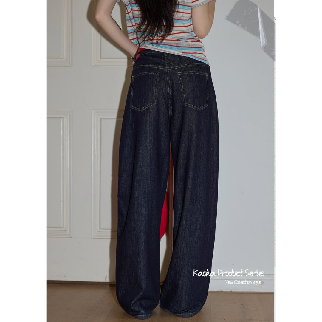 フロントに施されたセンターステッチが縦のラインを強調し、すっきりとした印象を与えるワイドシルエットのデニムパンツ。